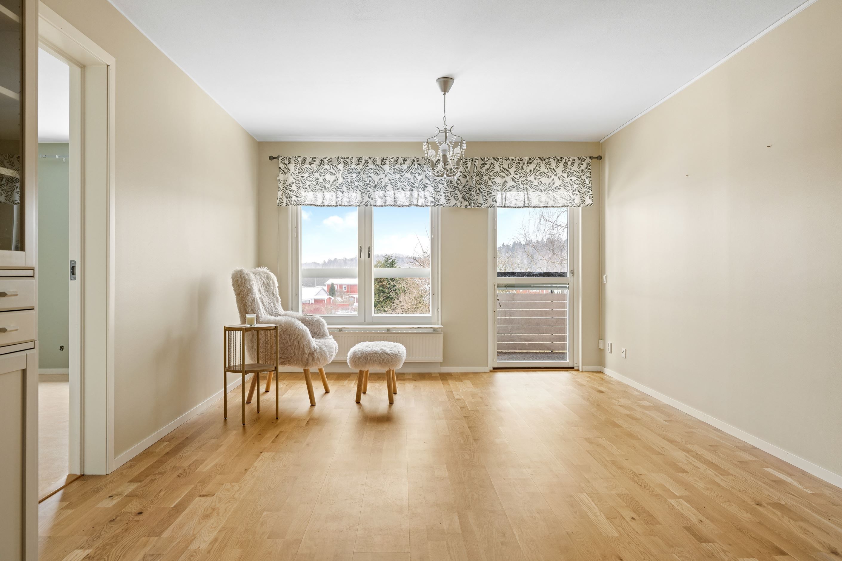 Vardagsrum med ljusa fina väggar och nytt golv. Här finns plats för matbord samt såklart även soffgrupp och tv hörna. Utgång till den möblerbara balkongen med eftermiddagssol och den eftertraktade kvällssolen. Här vilar ögonen mot en gång- och cykelväg samt Dalängen.