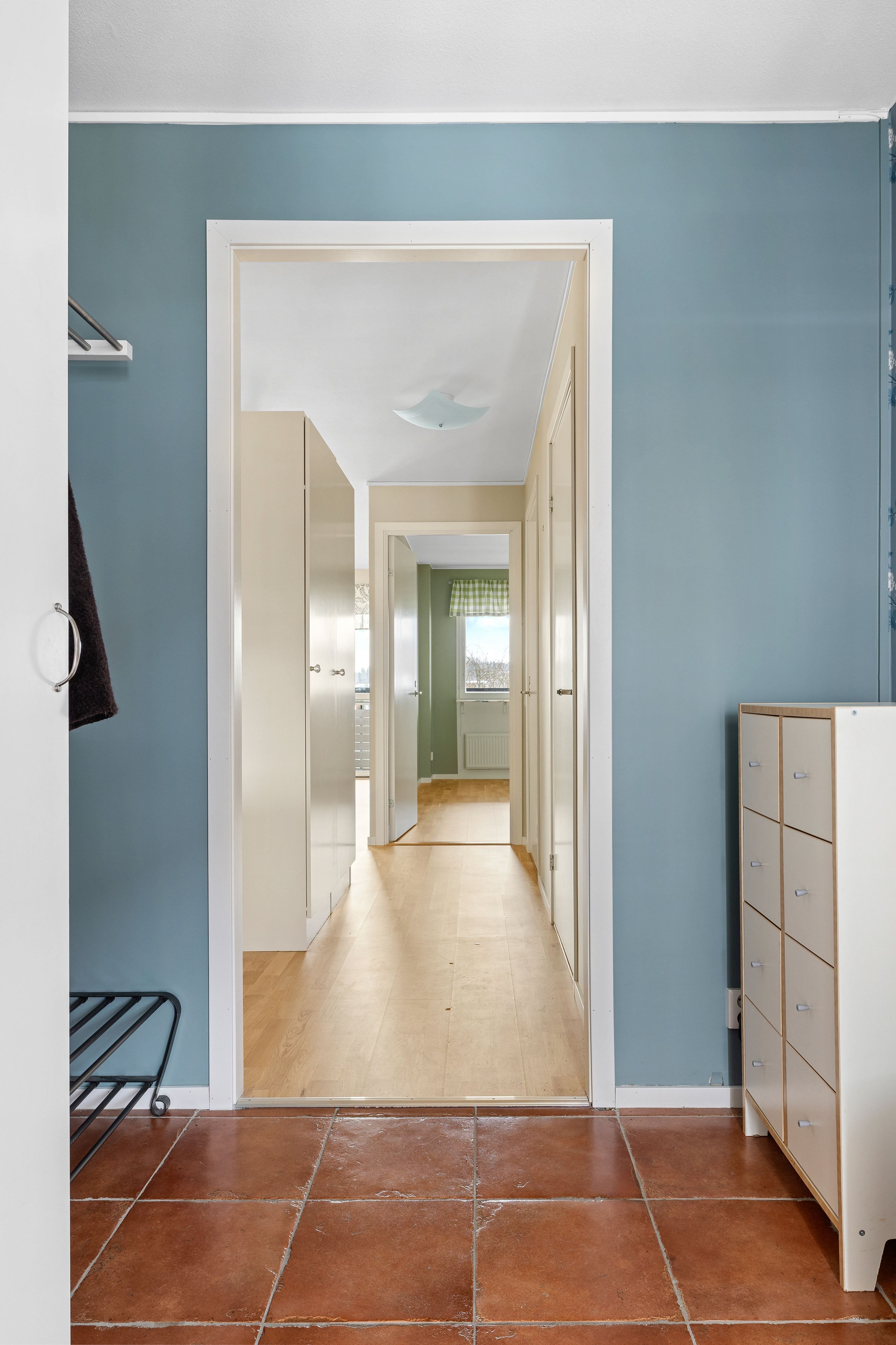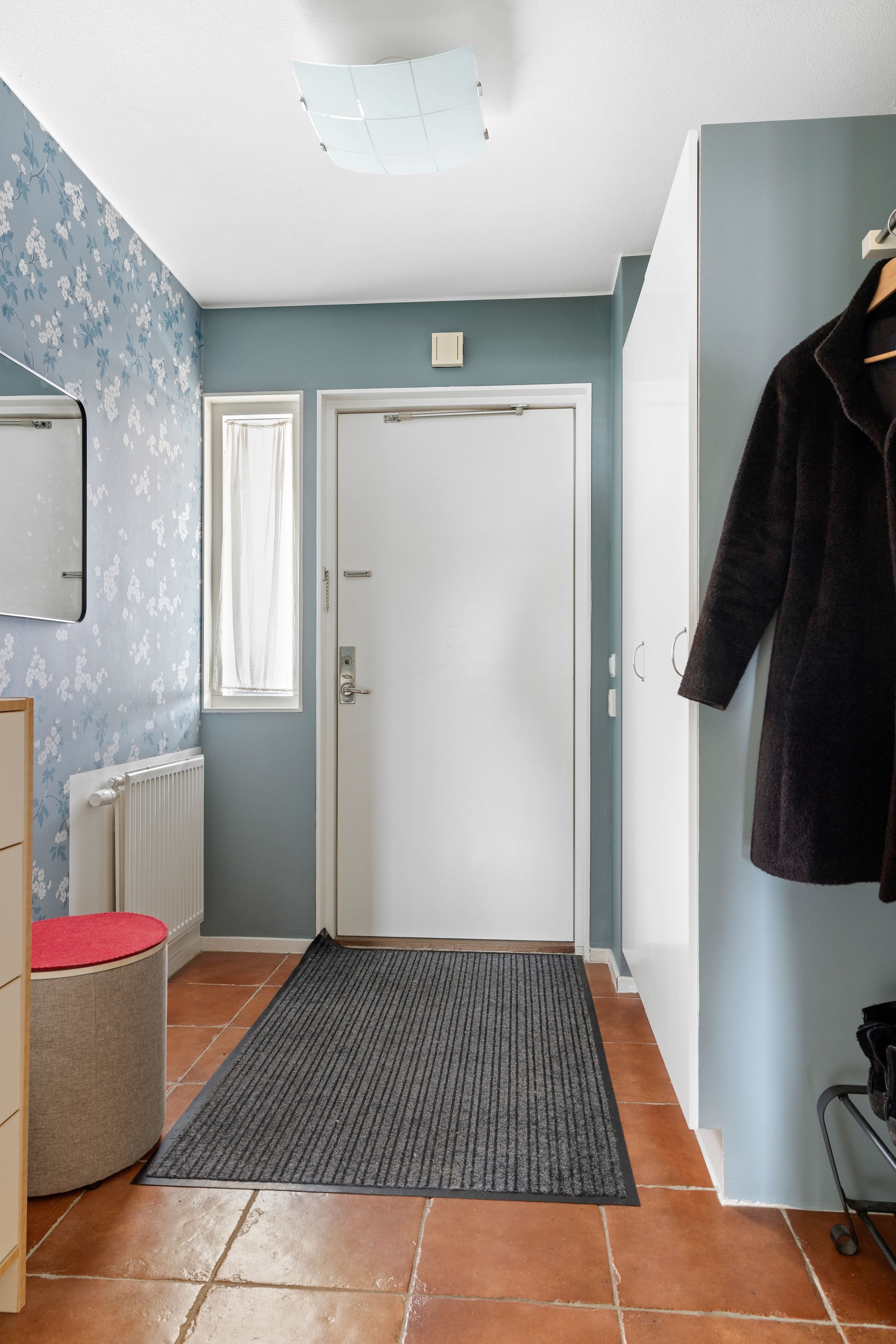 Här finns en rymlig hall med terracottafärgat klinkergolv som vetter mot den inre hallen. I entréhallen finns två bra garderober samt en hatthylla för kläder och skor. Nytapetserade väggar i blå ton och gott om förvaring i form av två garderober. Vidare in finner du ytterligare två garderober varav ett är ett praktiskt städskåp. Bredvid ytterdörren finns ett rymligt extra varmförråd med egen ingång, där allt annat får plats!