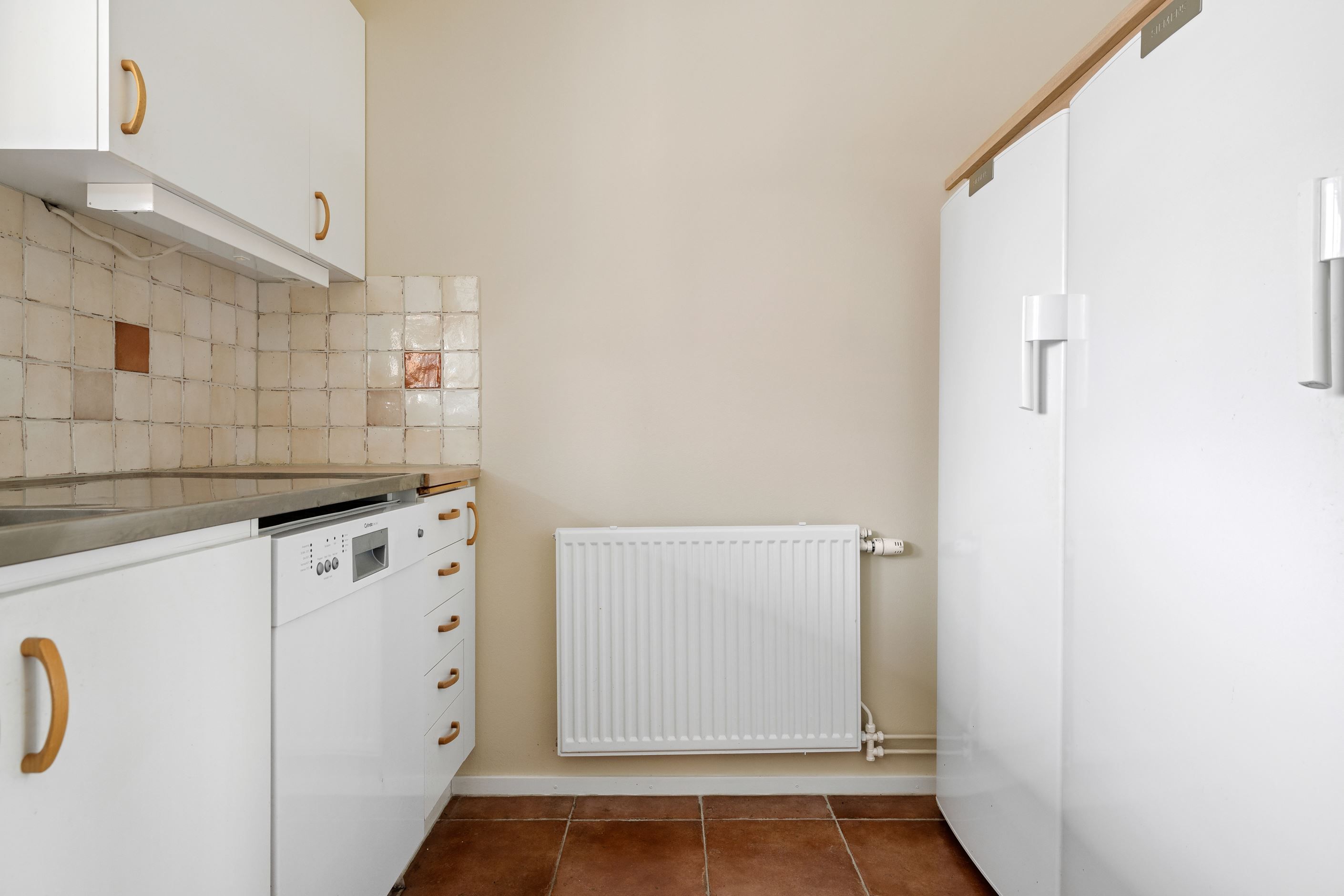 Köket ligger i vinkel med samma typ av klinkergolv som i hallen. Ljusa väggar och ljust kakel över arbetsbänkarna. Ny bänkskiva samt nymålade köksluckor ger en trevlig och fräsch känsla. Här finns diskmaskin, kyl, frys och spis, ugn och fläkt. Fönster över diskbänken.
