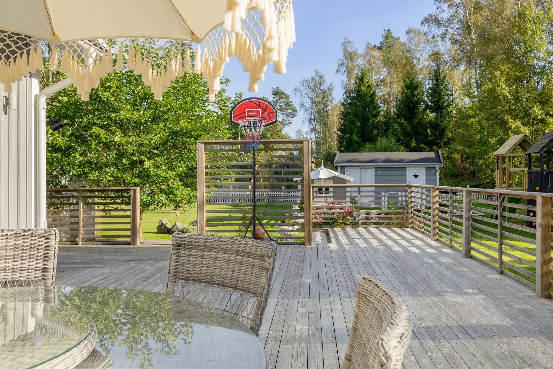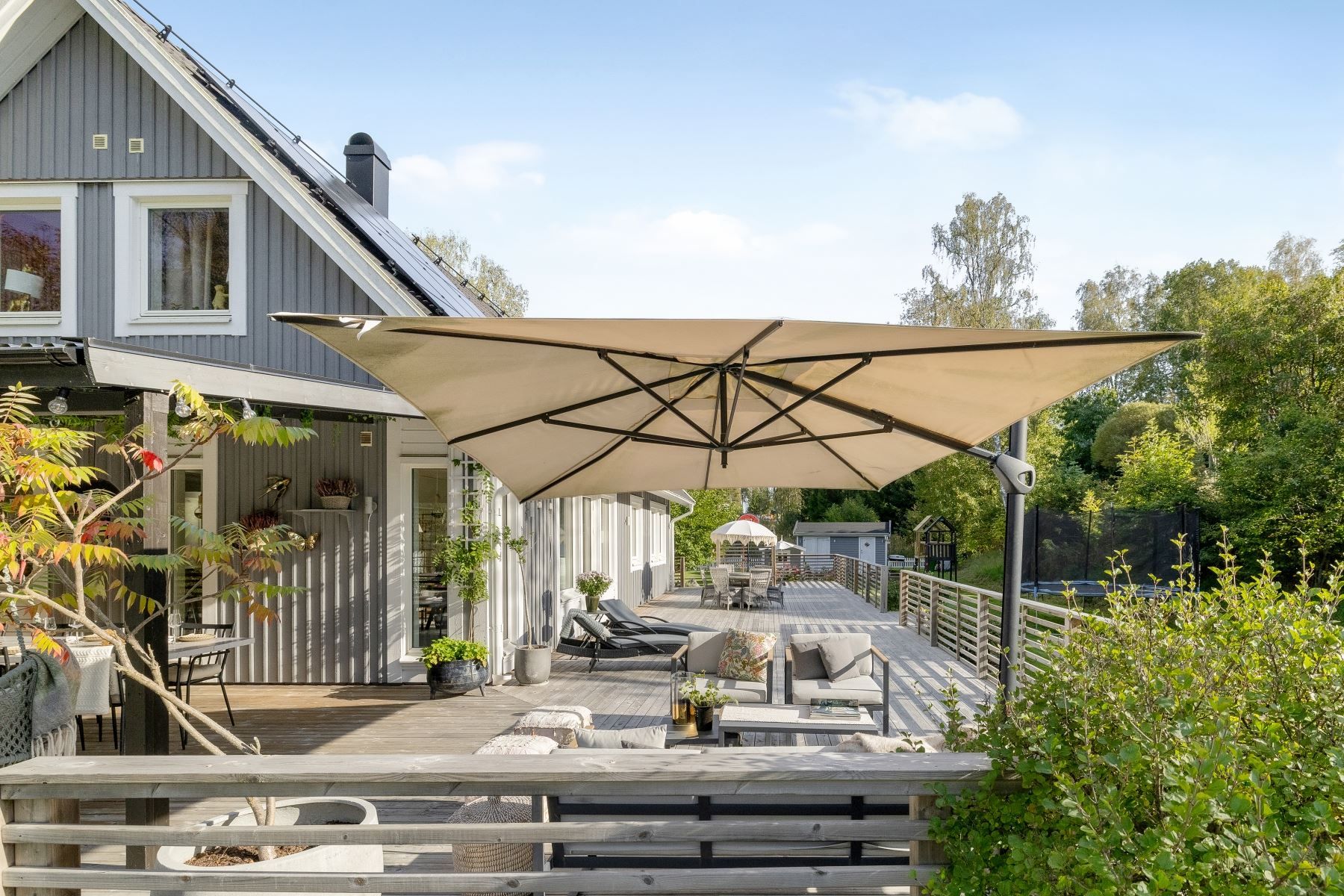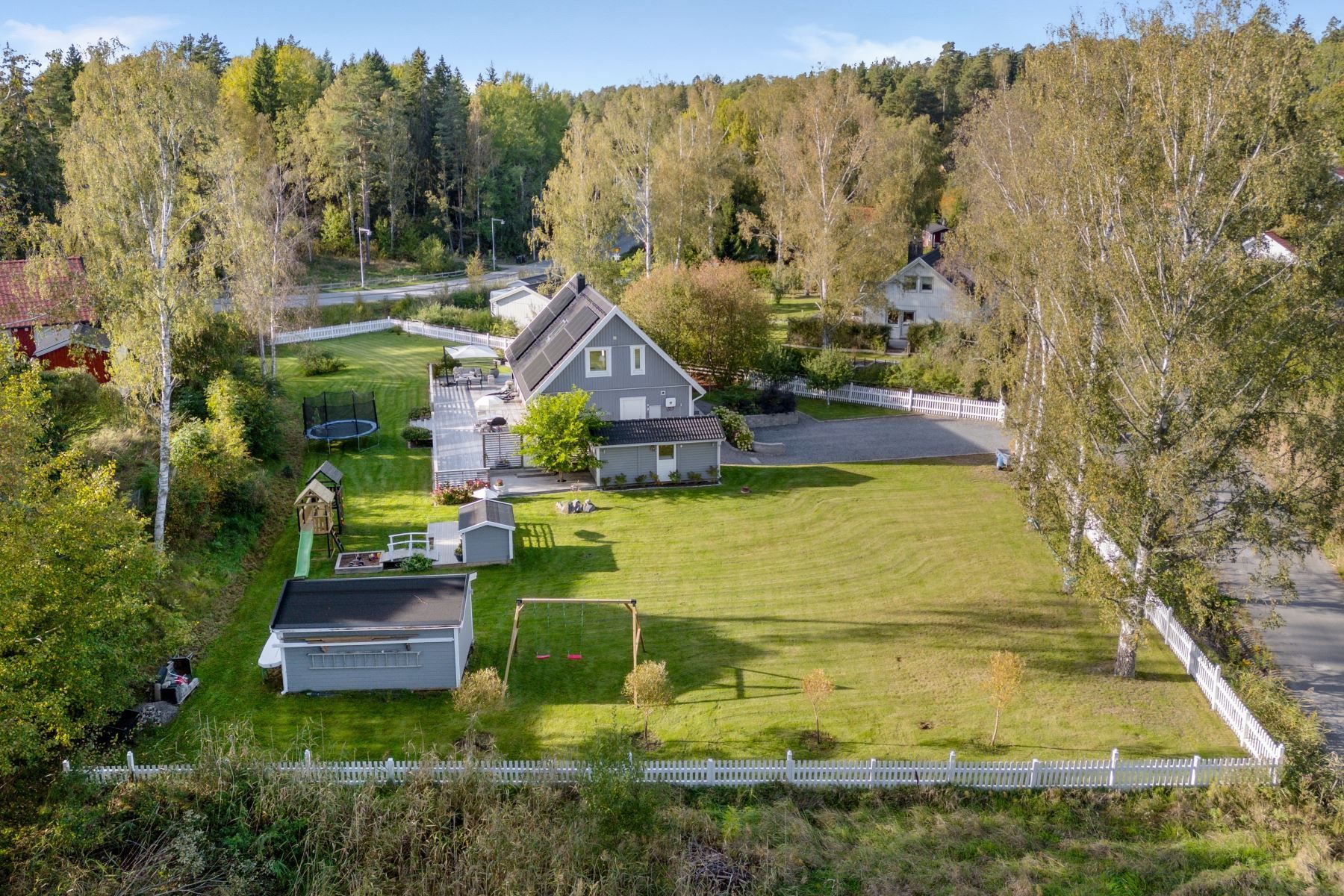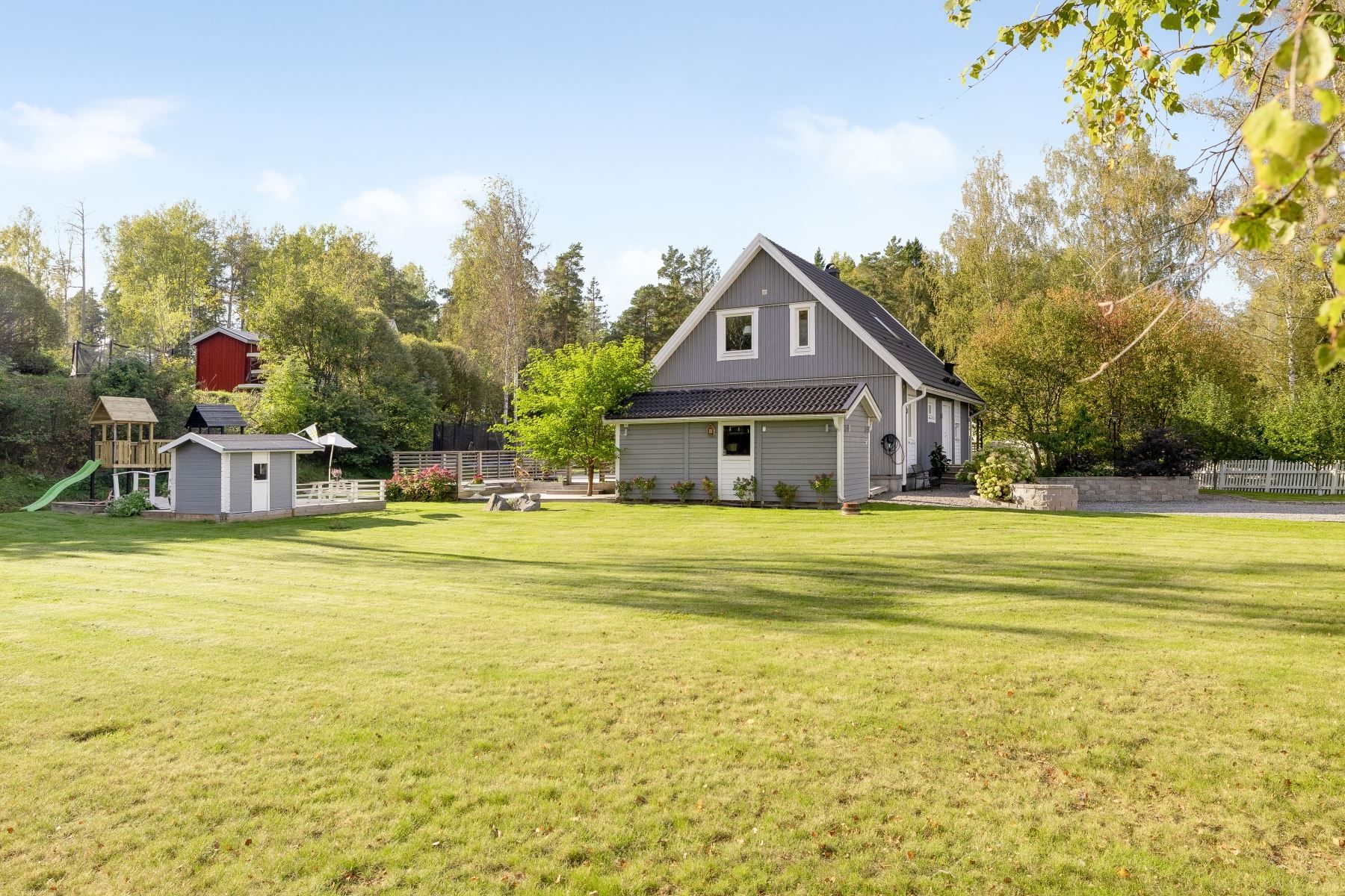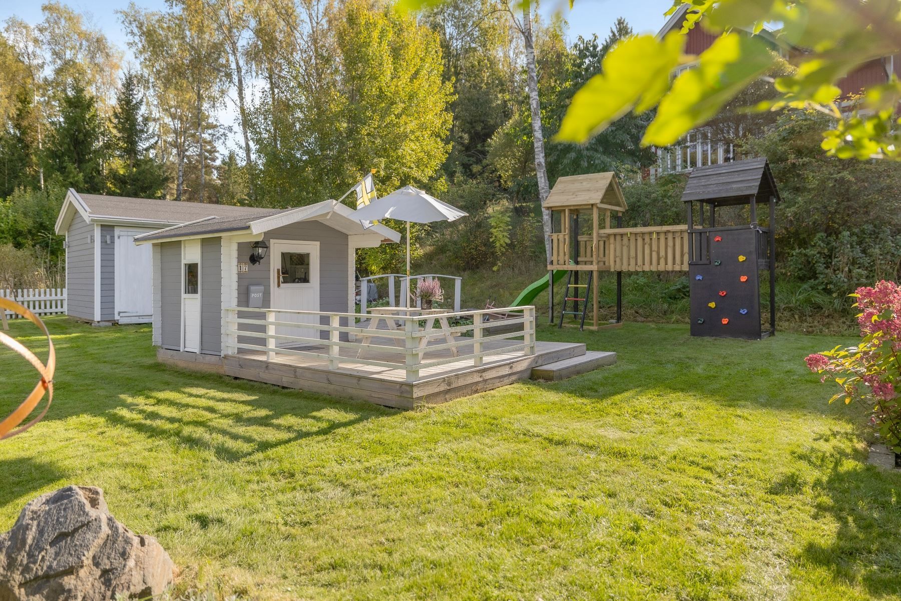 Tomten är en dröm för barnfamiljen, med lekstuga och gott om plats för lek, spel och utevistelser. Den stora trädäckade altanen – delvis under tak – ger både sol hela dagen och skön skugga när det behövs. Här skapas en naturlig plats för både vardag och fest, året runt.