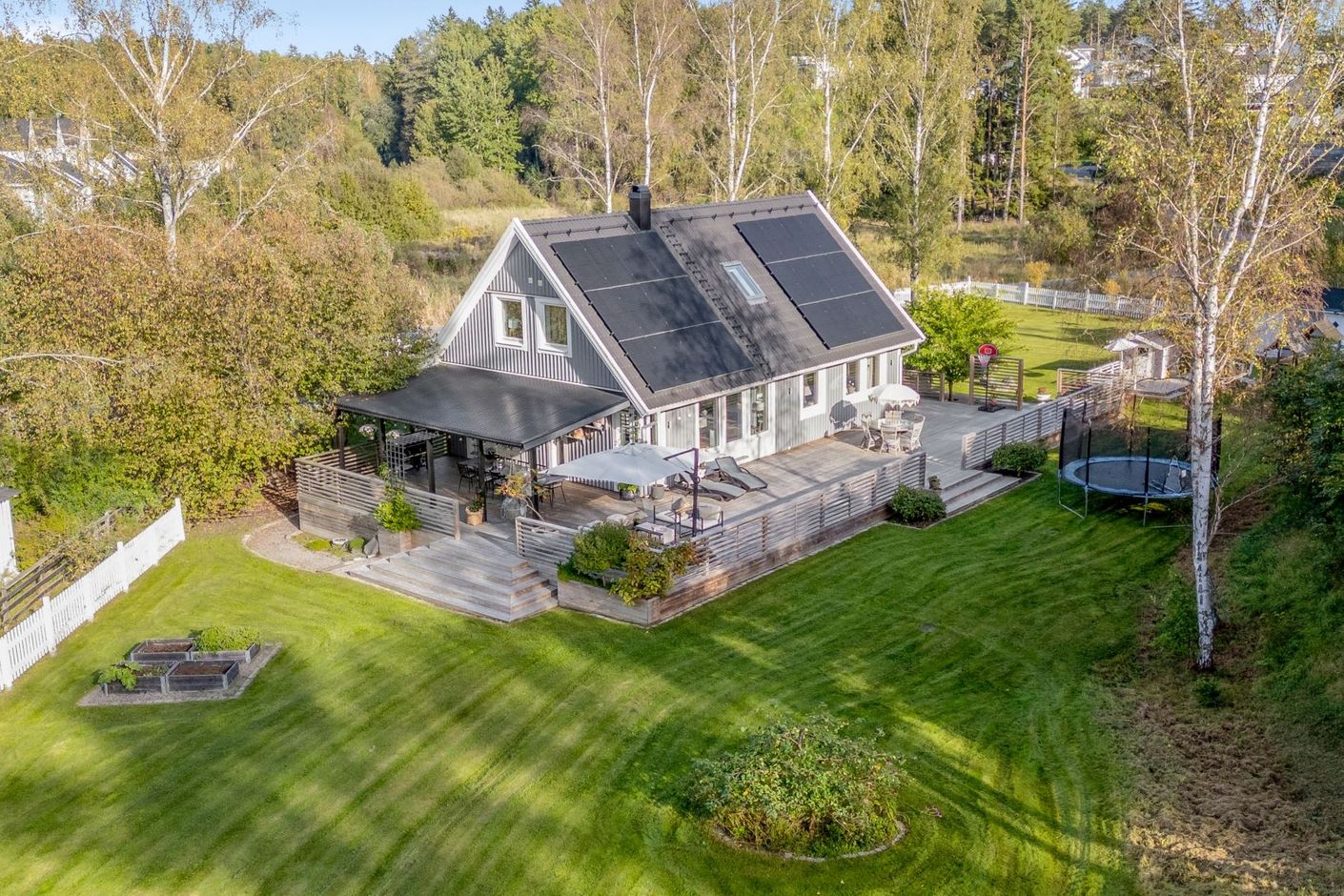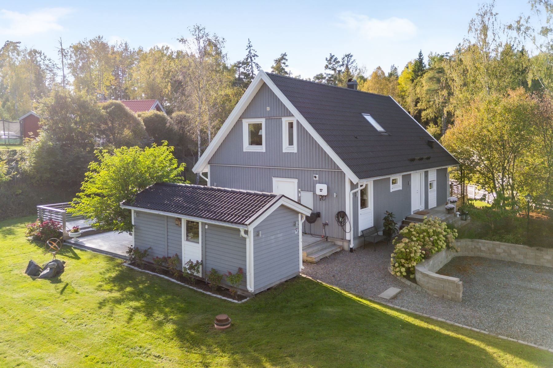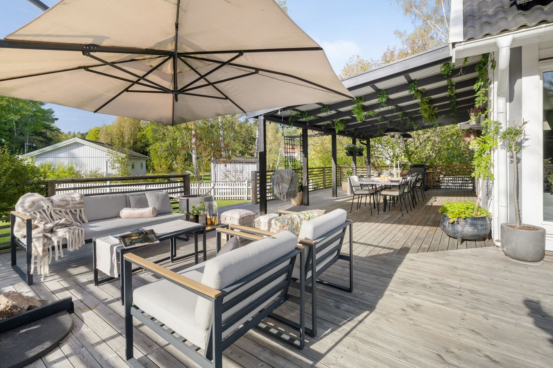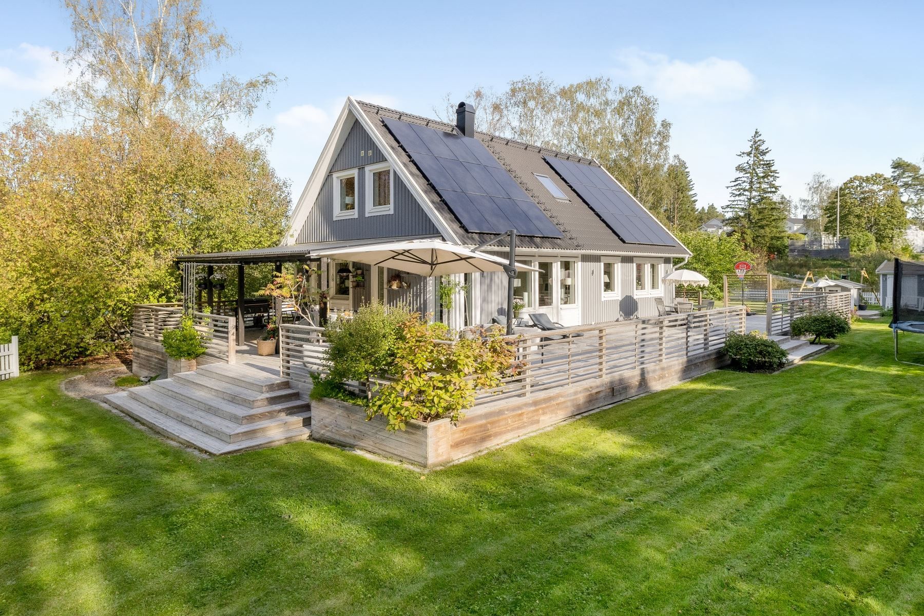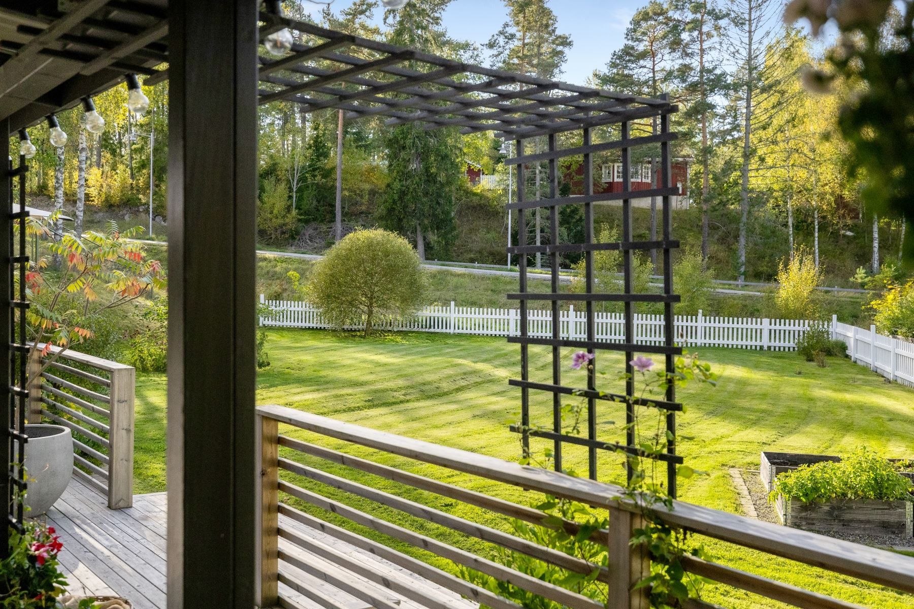 Tomten är en dröm för barnfamiljen, med lekstuga och gott om plats för lek, spel och utevistelser. Den stora trädäckade altanen – delvis under tak – ger både sol hela dagen och skön skugga när det behövs. Här skapas en naturlig plats för både vardag och fest, året runt.