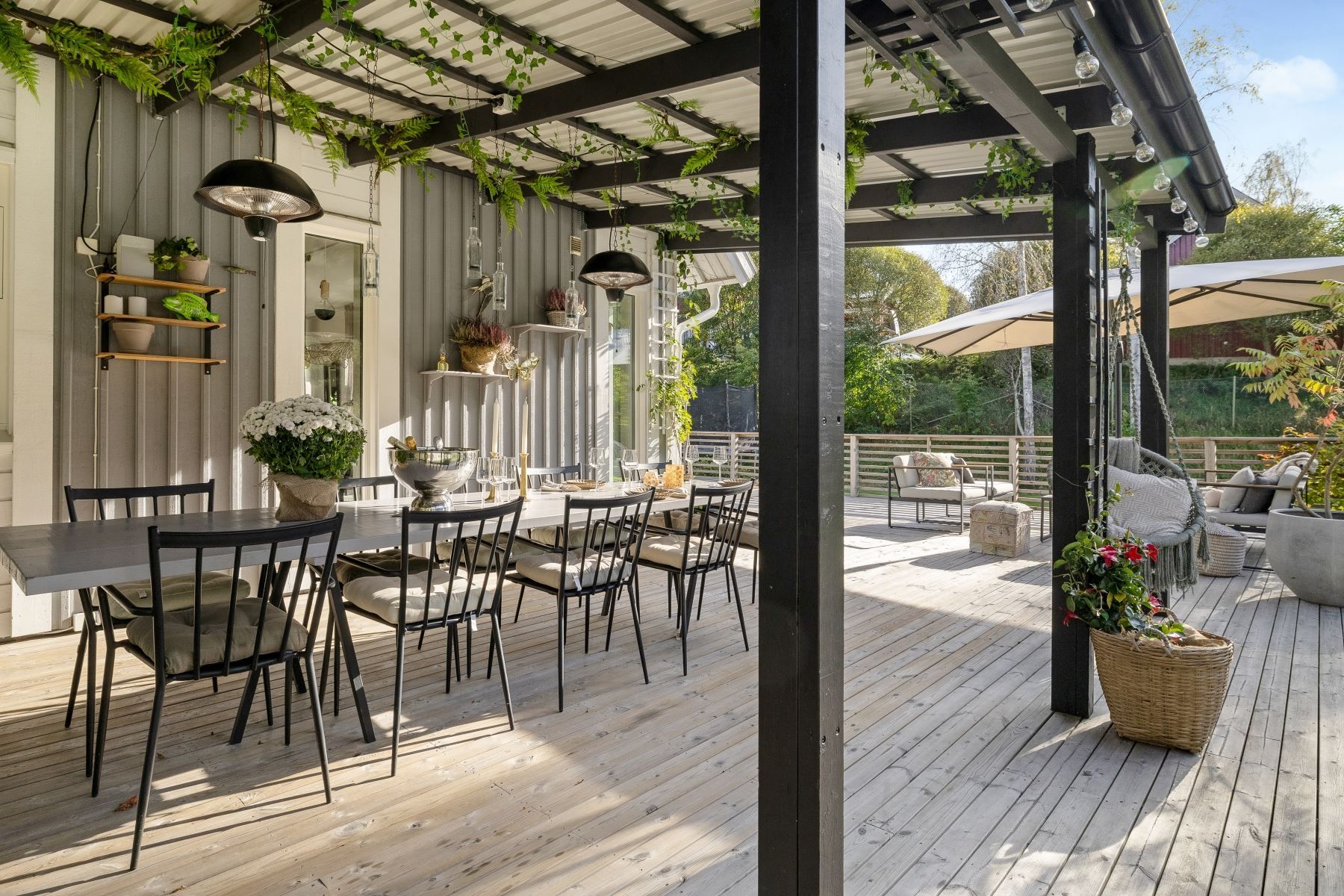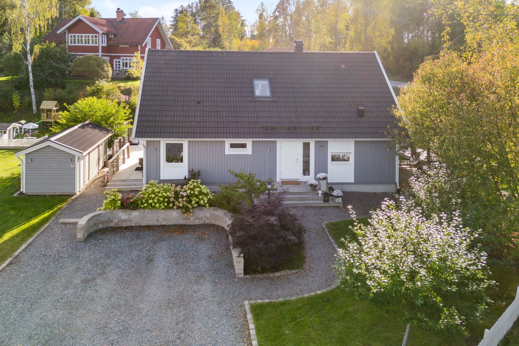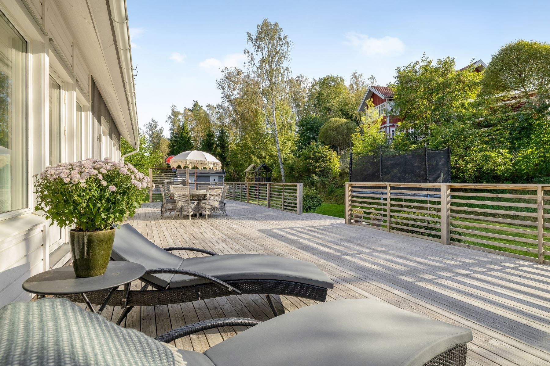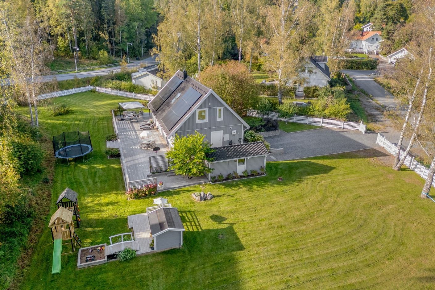 Tomten är en dröm för barnfamiljen, med lekstuga och gott om plats för lek, spel och utevistelser. Den stora trädäckade altanen – delvis under tak – ger både sol hela dagen och skön skugga när det behövs. Här skapas en naturlig plats för både vardag och fest, året runt.