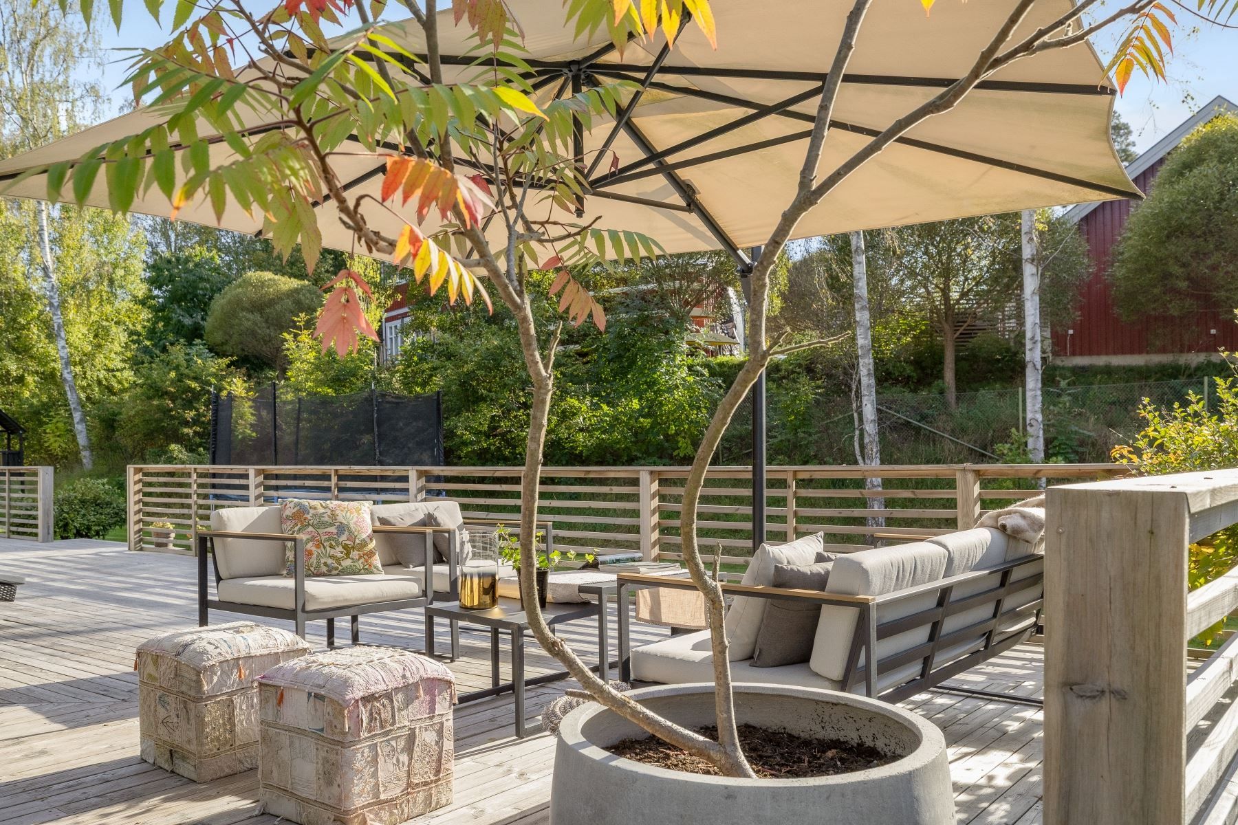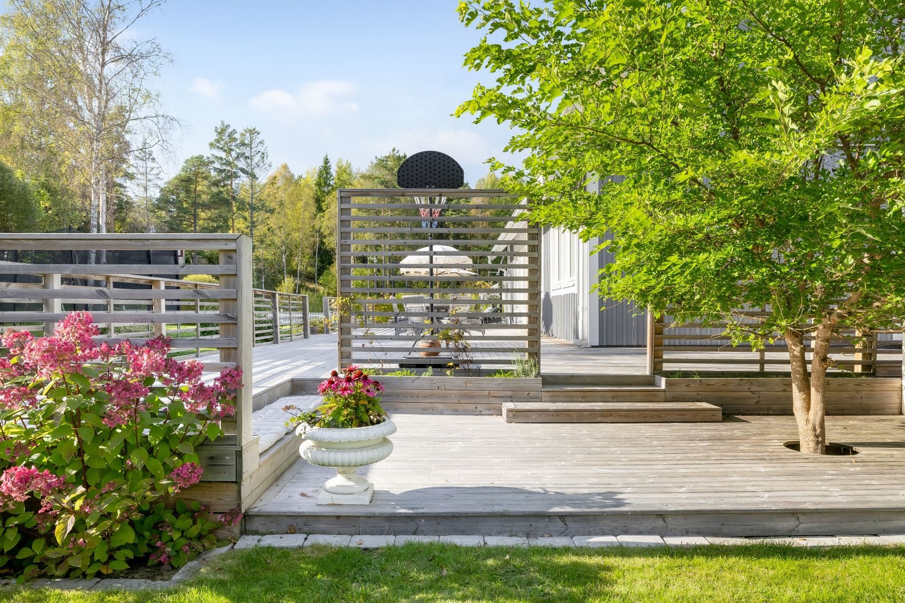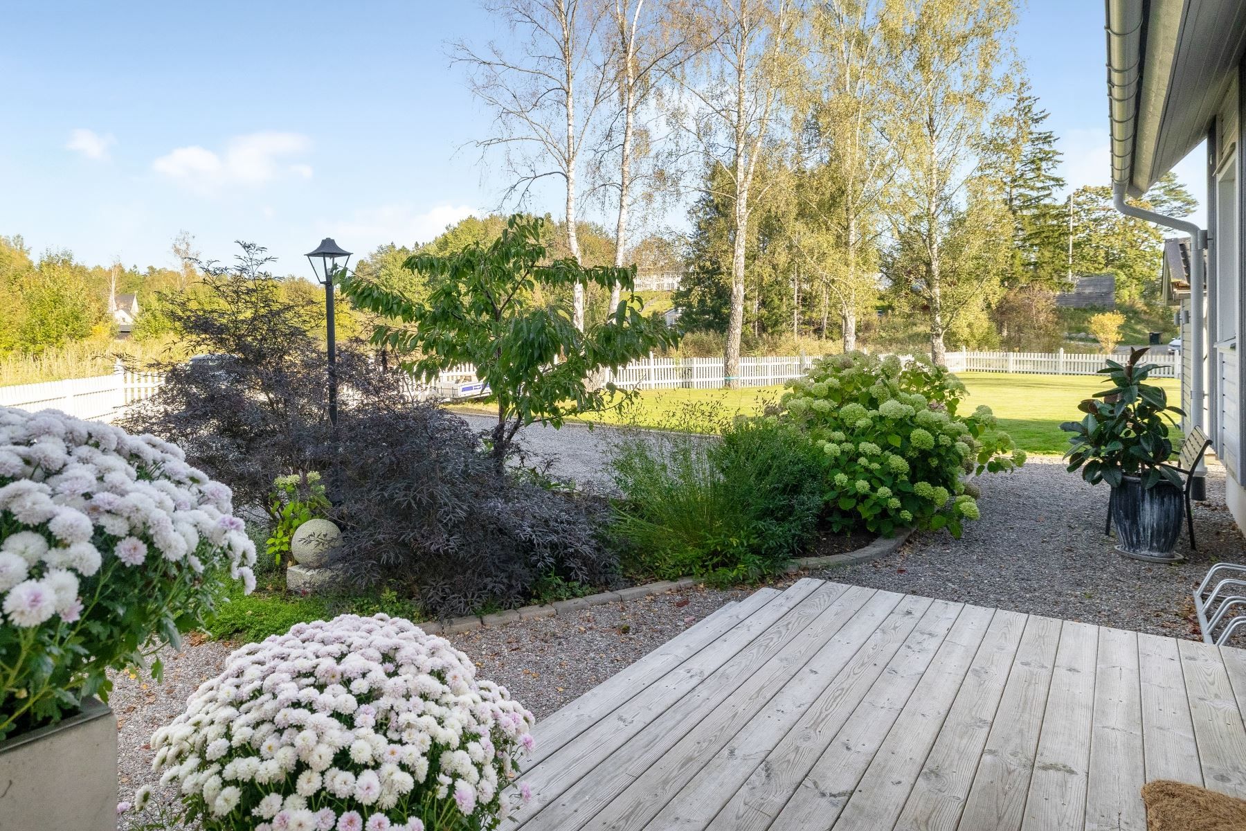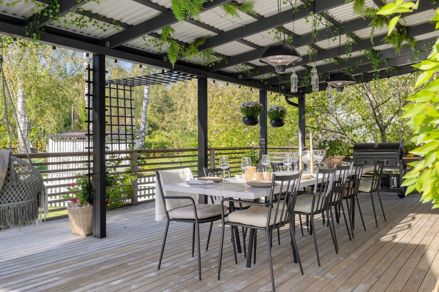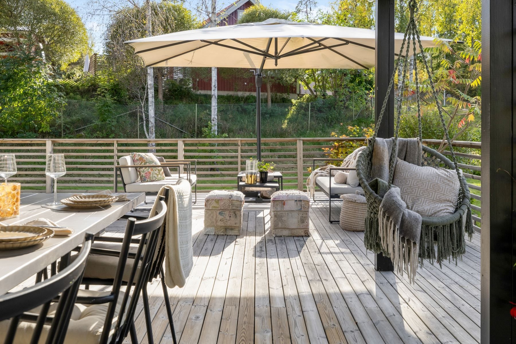 Tomten är en dröm för barnfamiljen, med lekstuga och gott om plats för lek, spel och utevistelser. Den stora trädäckade altanen – delvis under tak – ger både sol hela dagen och skön skugga när det behövs. Här skapas en naturlig plats för både vardag och fest, året runt.
