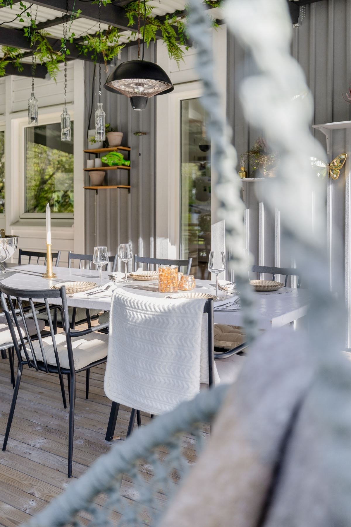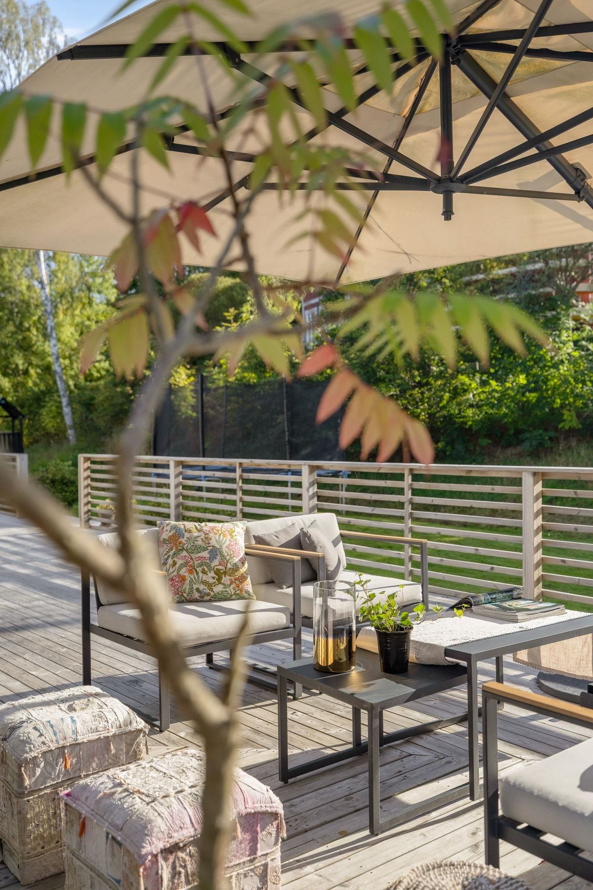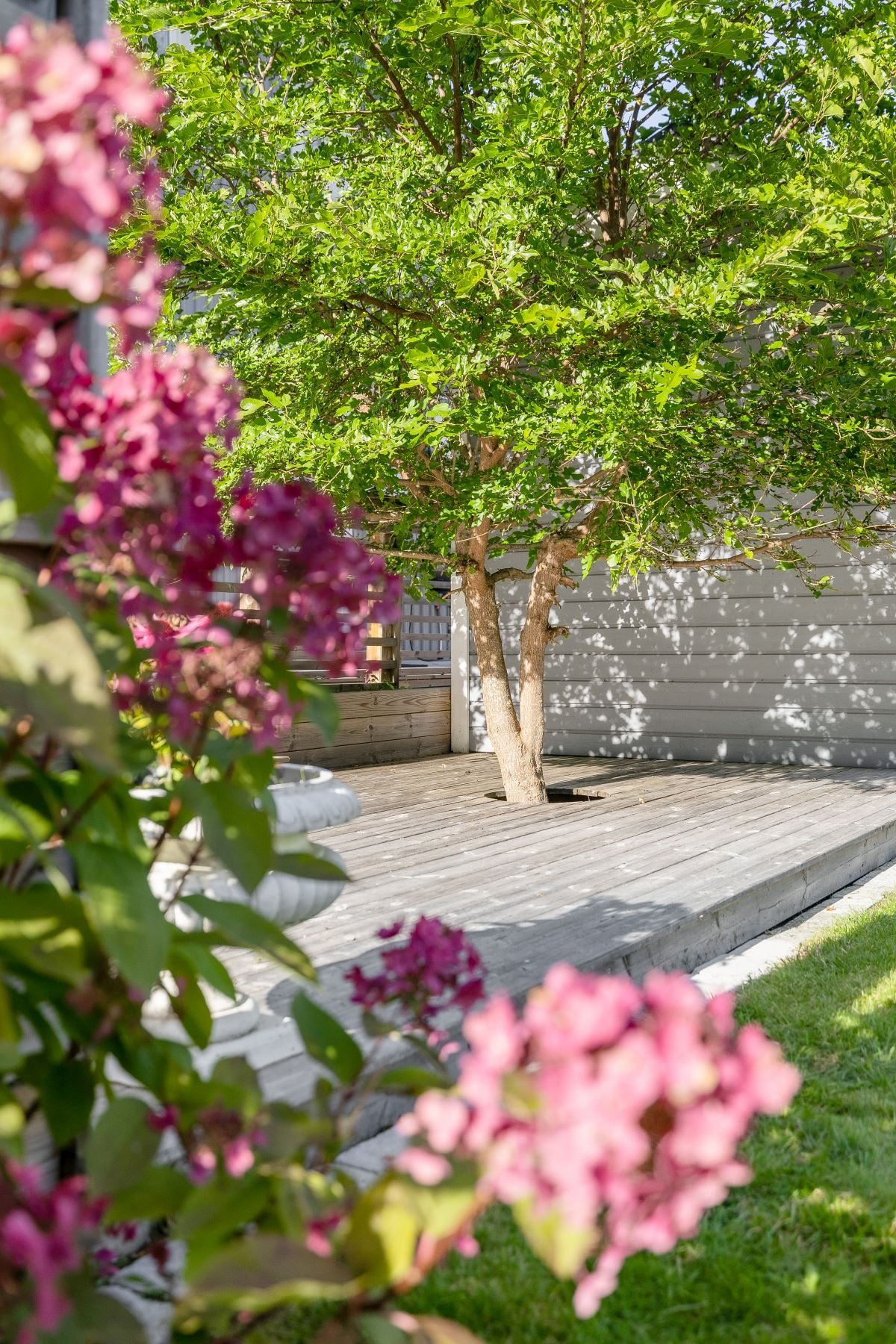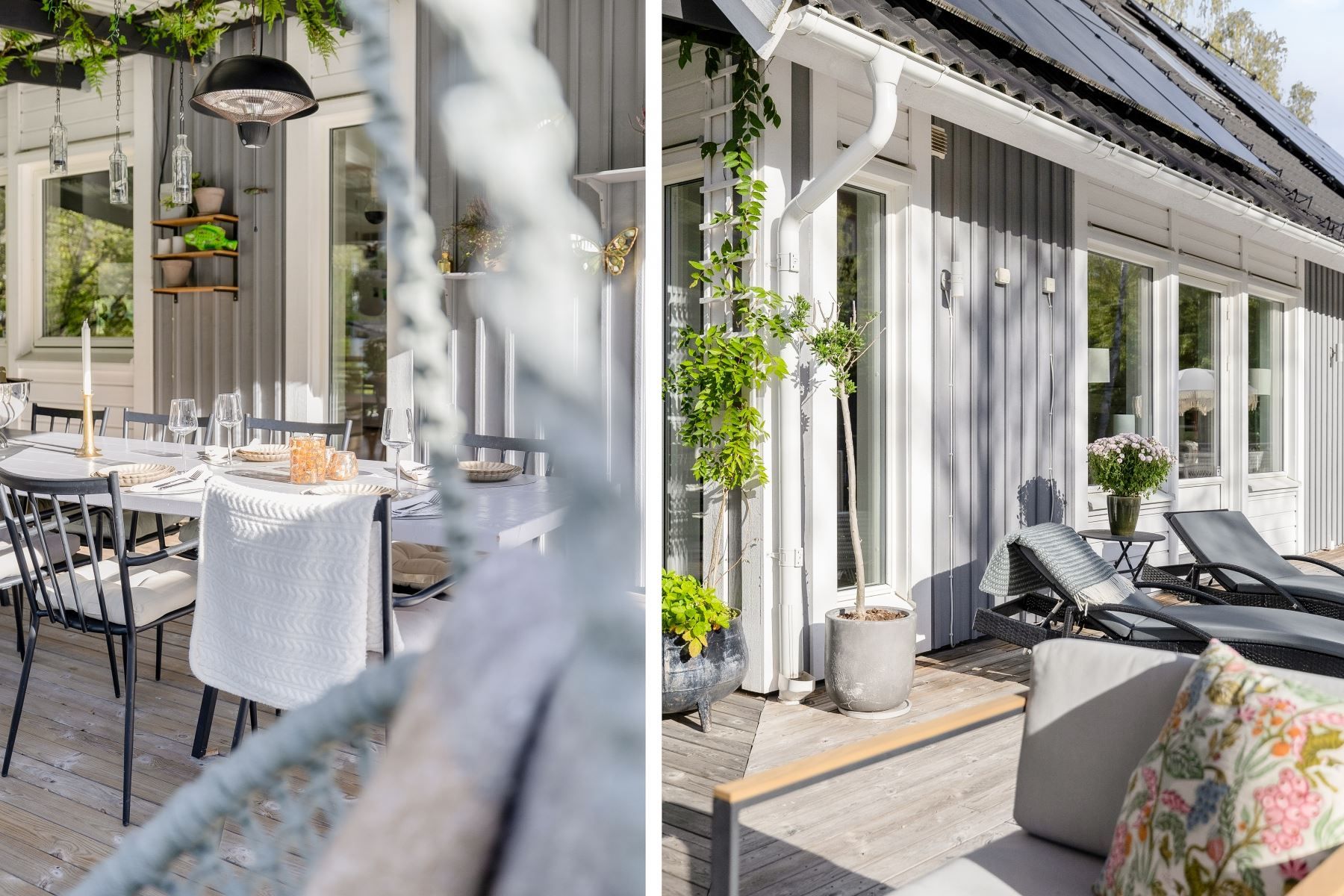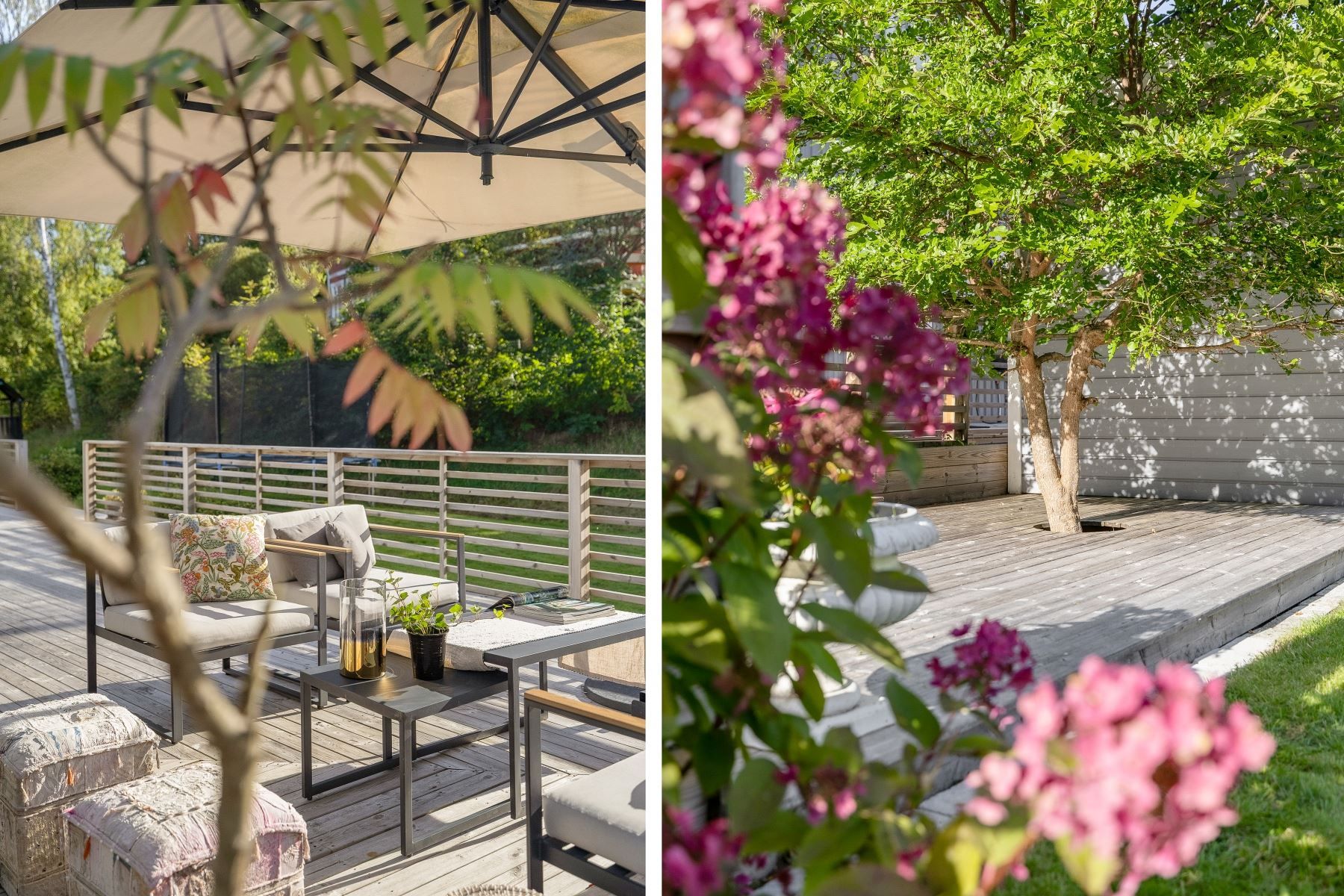 Tomten är en dröm för barnfamiljen, med lekstuga och gott om plats för lek, spel och utevistelser. Den stora trädäckade altanen – delvis under tak – ger både sol hela dagen och skön skugga när det behövs. Här skapas en naturlig plats för både vardag och fest, året runt.