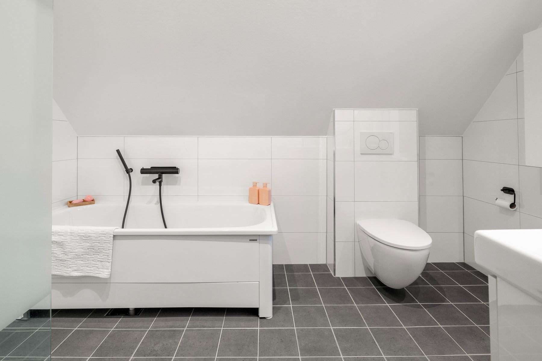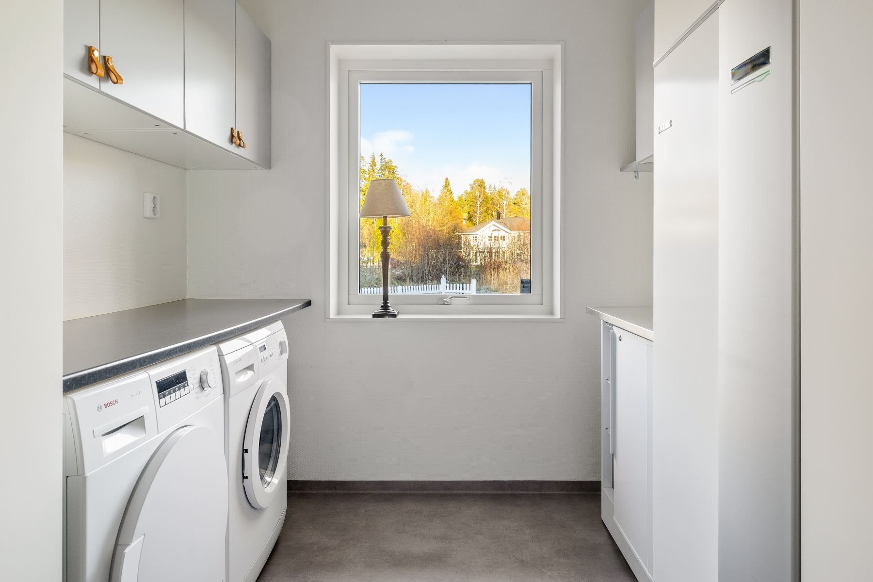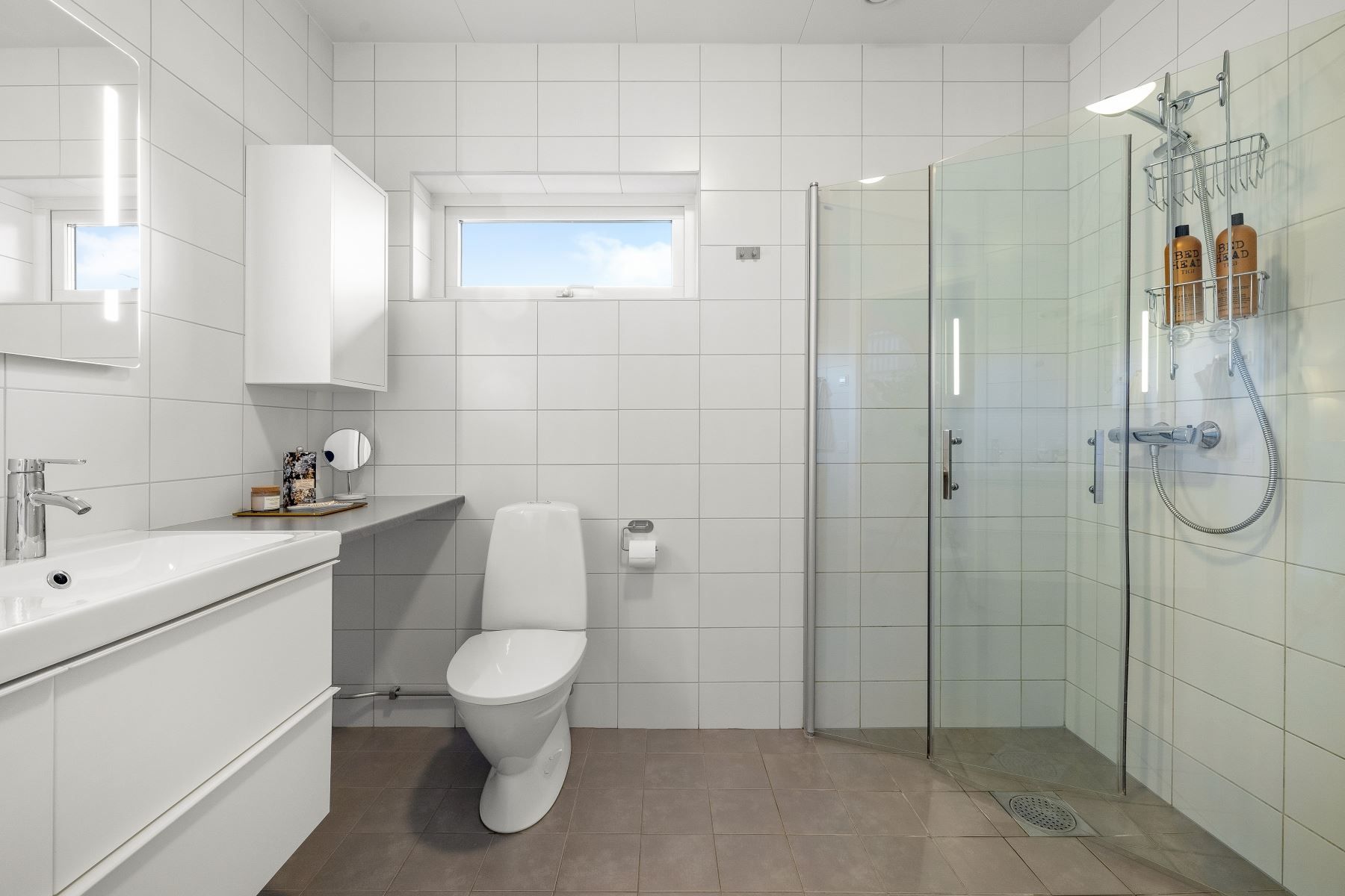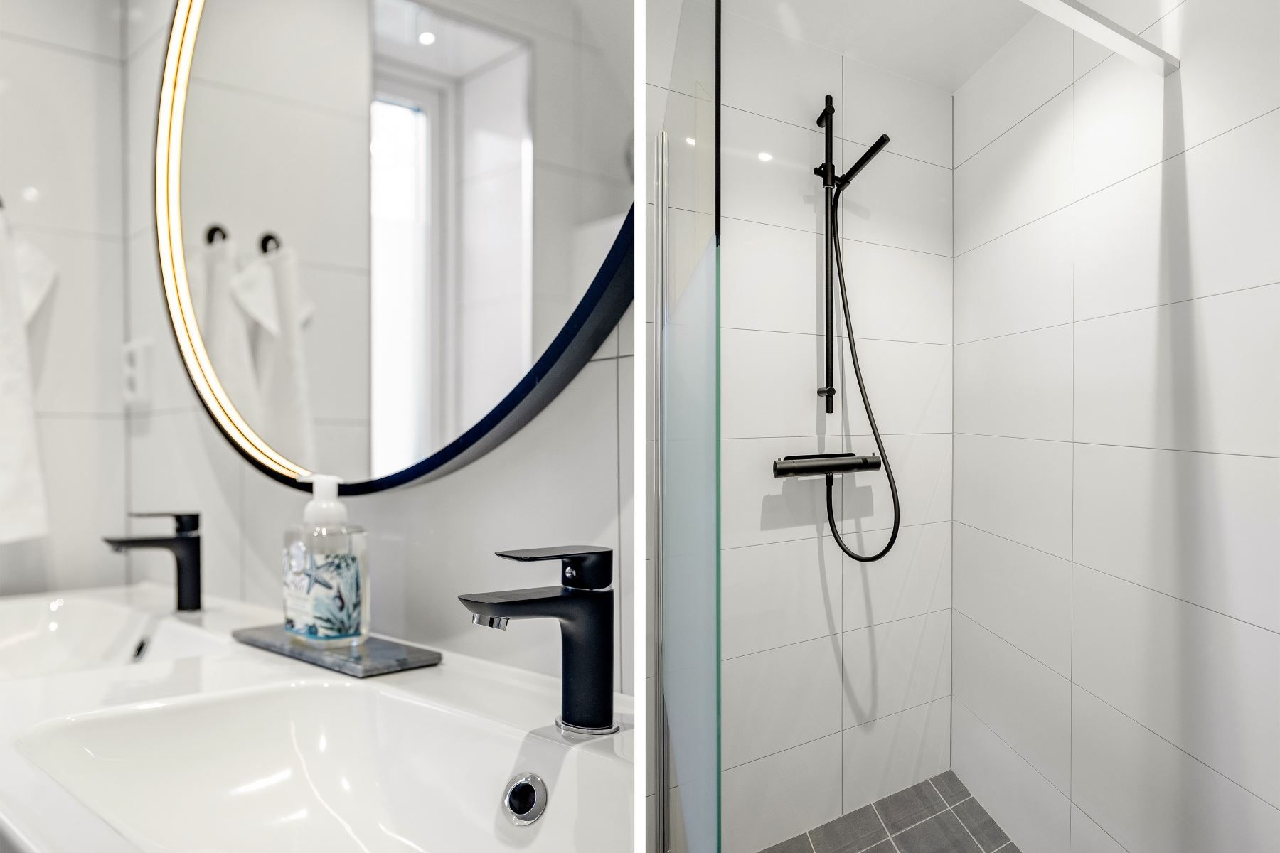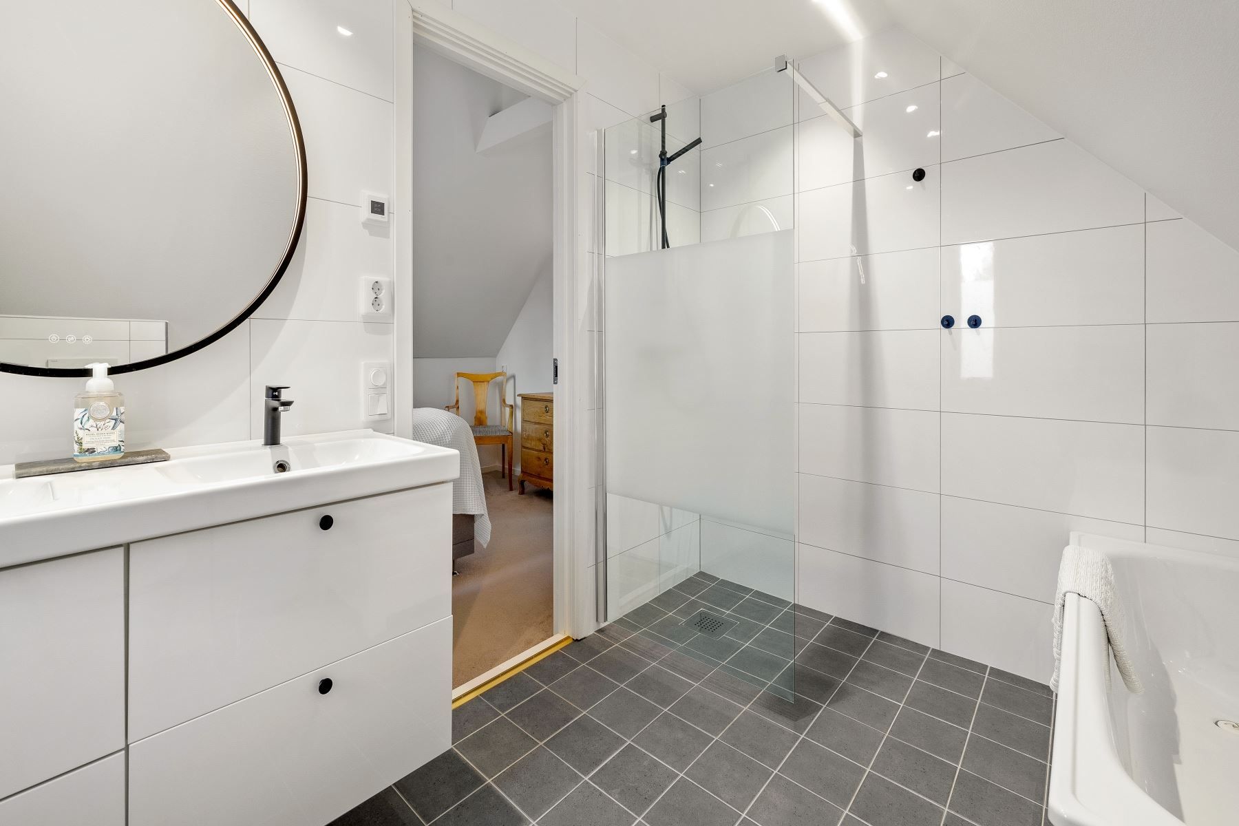 På entréplan finns även ett helkaklat badrum med duschhörna, wc, dubbelhandfat med kommod, spegel samt en praktisk avlastningsbänk. Ett fönster släpper in dagsljus som ger badrummet en fräsch känsla. Intill finns tvättstuga med arbetsyta och egen groventré – en praktisk lösning för barnfamiljen eller den med husdjur. Ett sovrum finns också på entréplan.