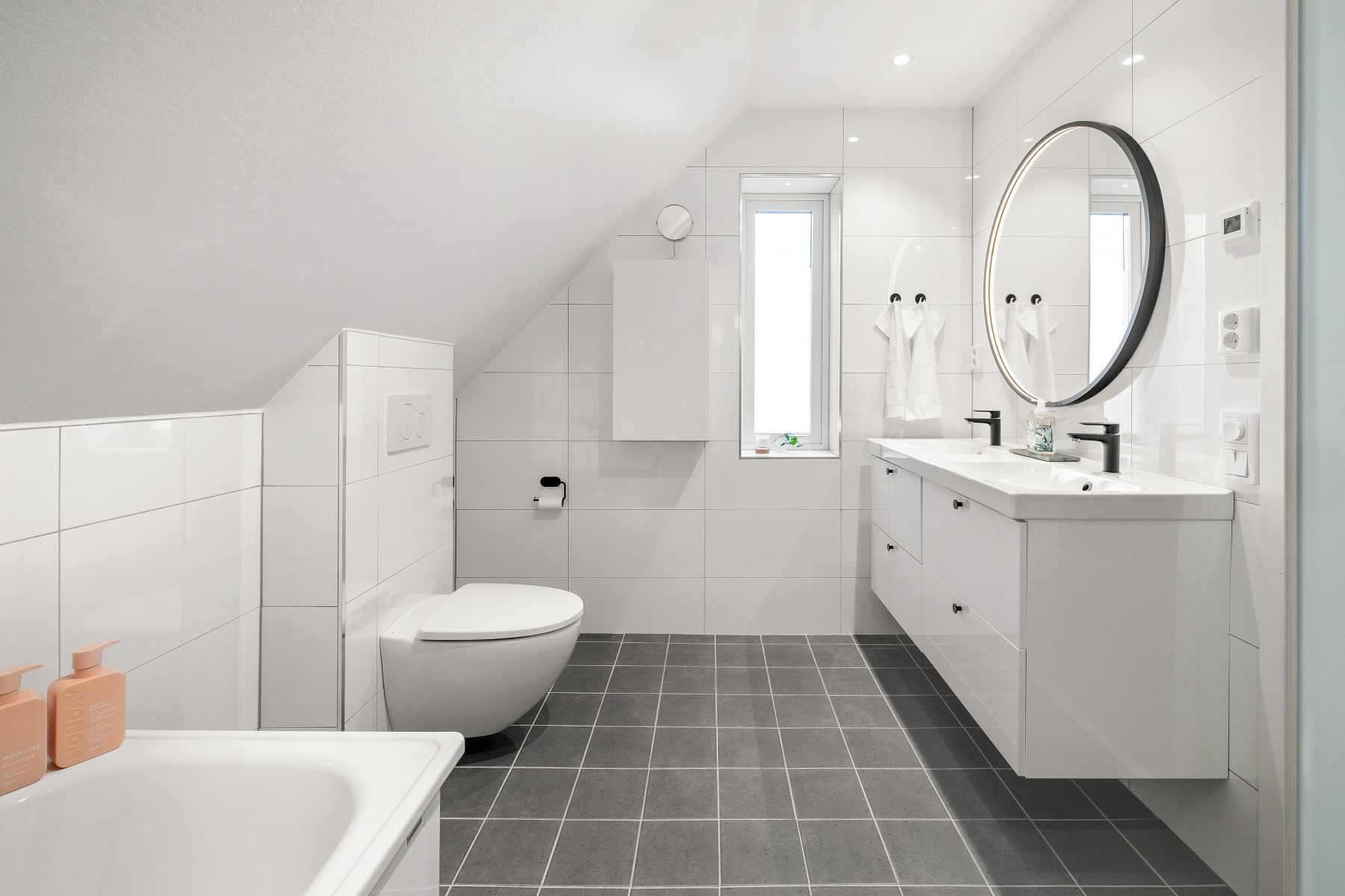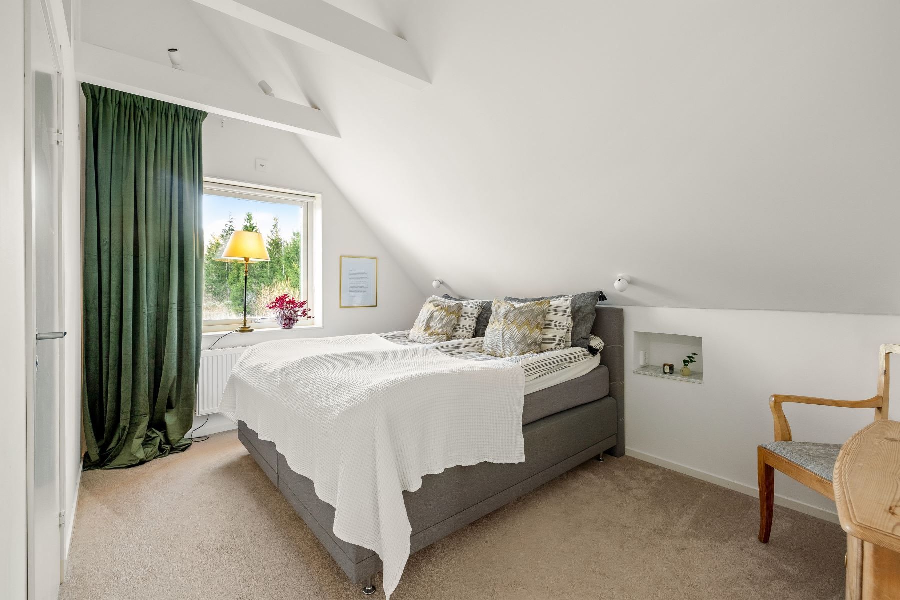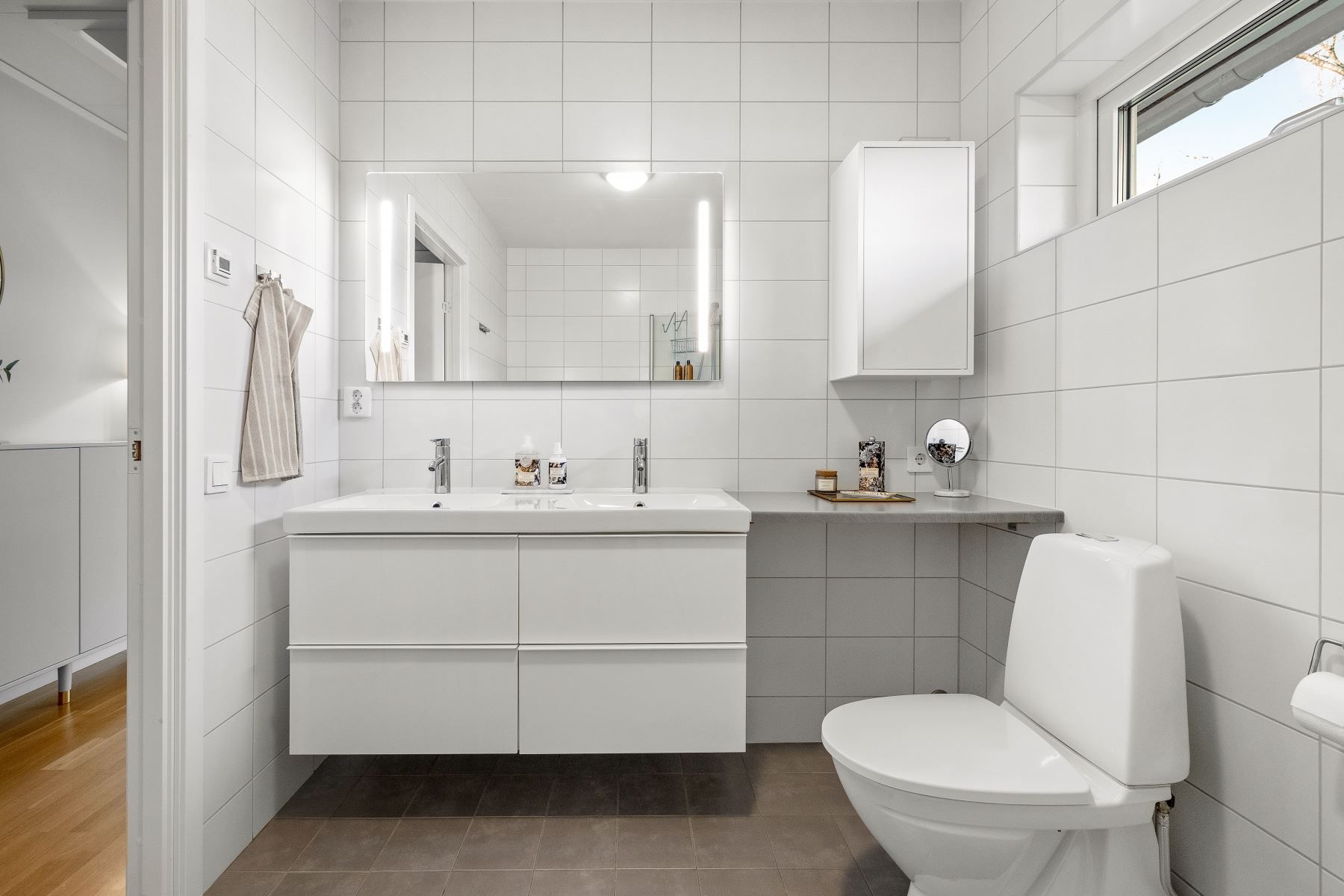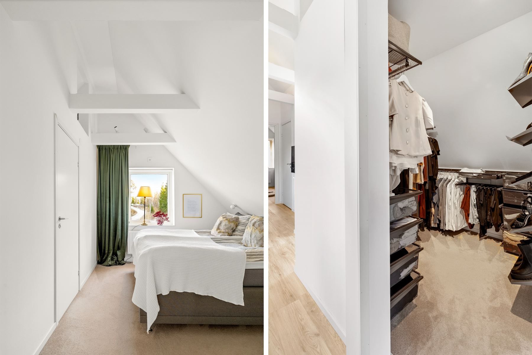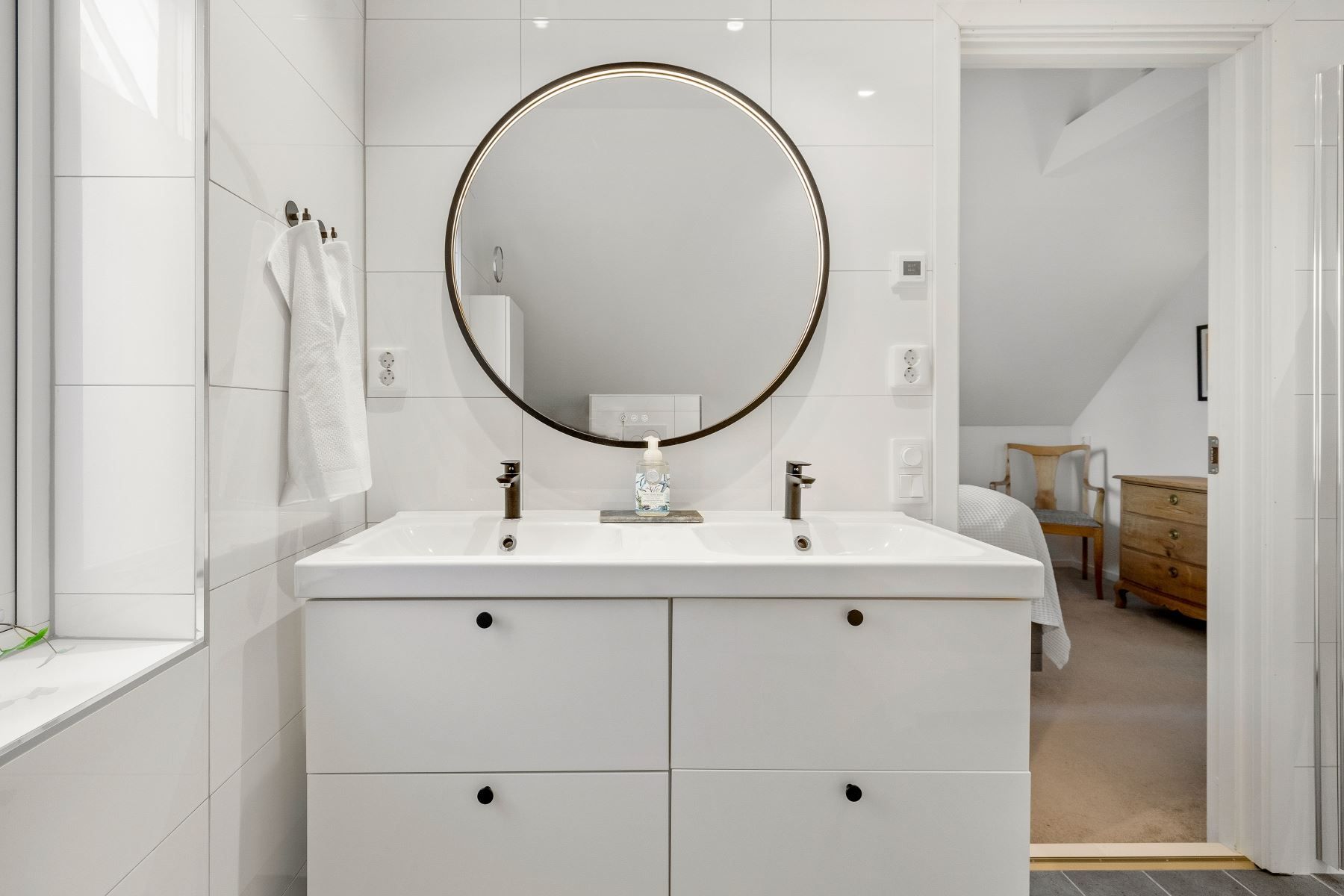 Hemmets master bedroom är något utöver det vanliga – med helteckningsmatta för lyxig komfort, walk-in-closet och ett eget badrum med både duschhörna och badkar, dubbelhandfat, vägghängd wc och fönster som ger ett naturligt ljusinsläpp. En privat oas i vardagen.