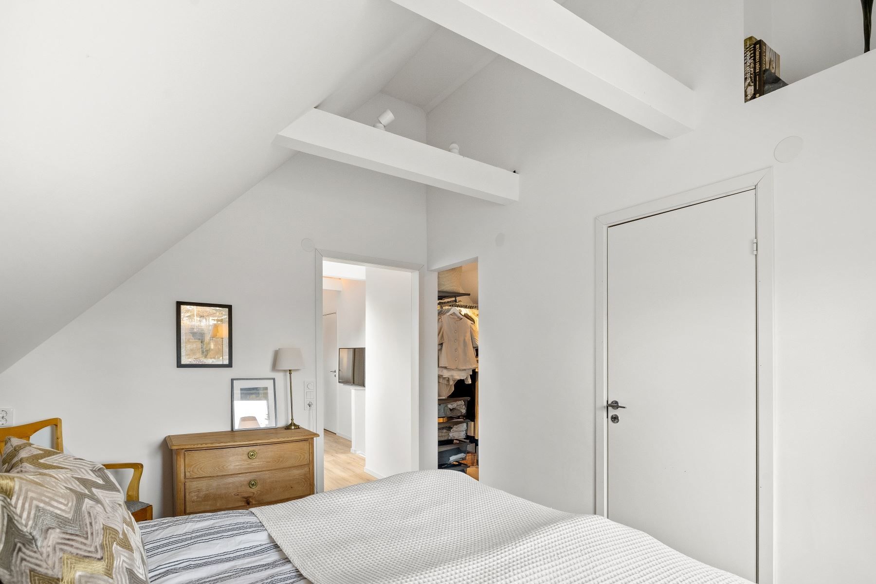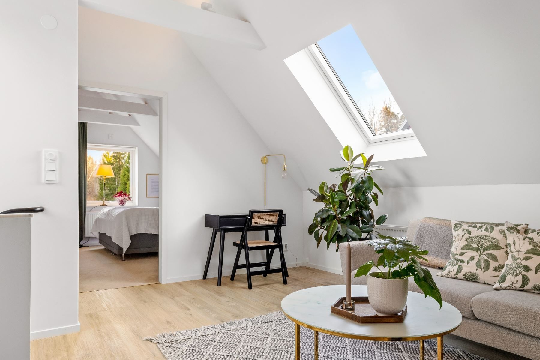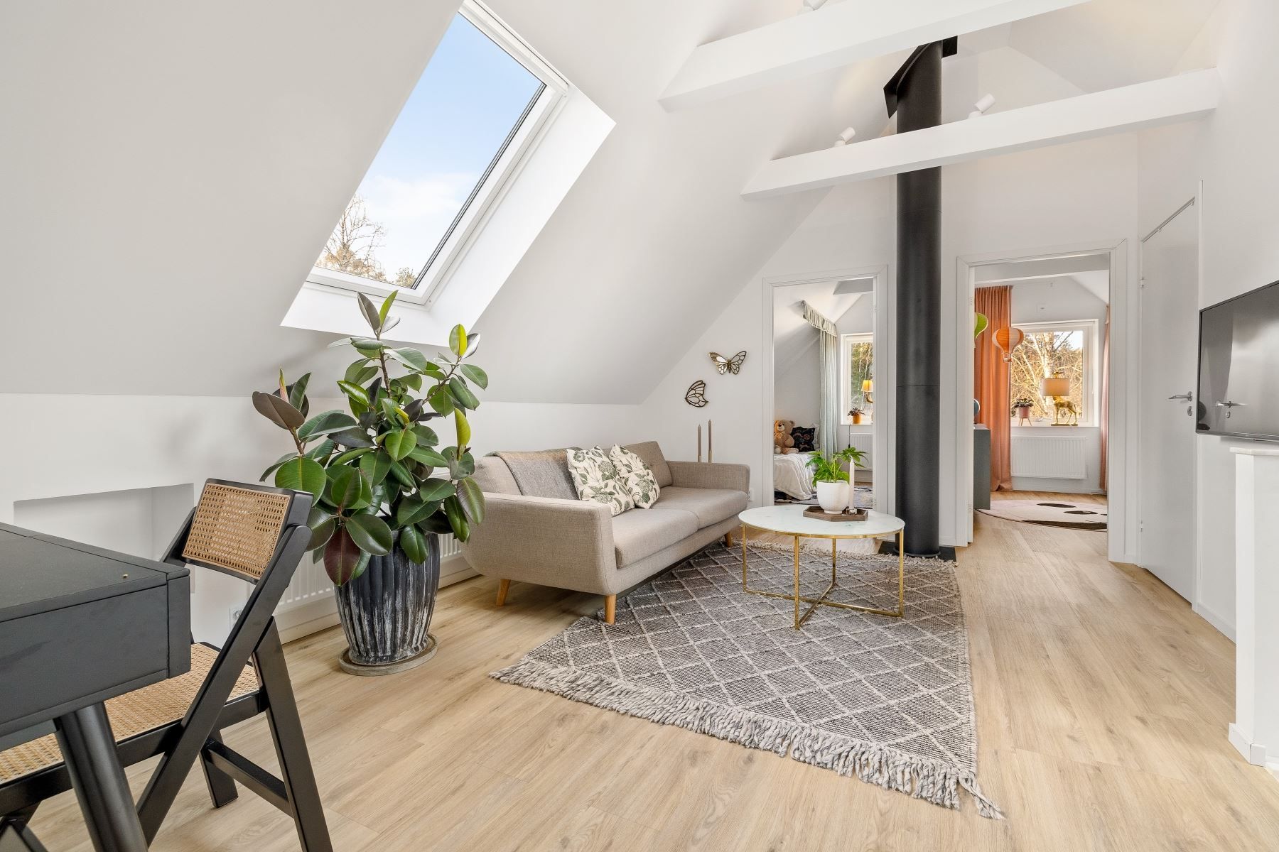 En trappa upp möts du av ett trivsamt allrum med plats för soffgrupp, arbetsplats eller annan möblering. Takfönster ger fint ljusinsläpp, och den generösa takhöjden skapar extra rymd. I direkt anslutning finns ett förvaringsutrymme med god kapacitet.