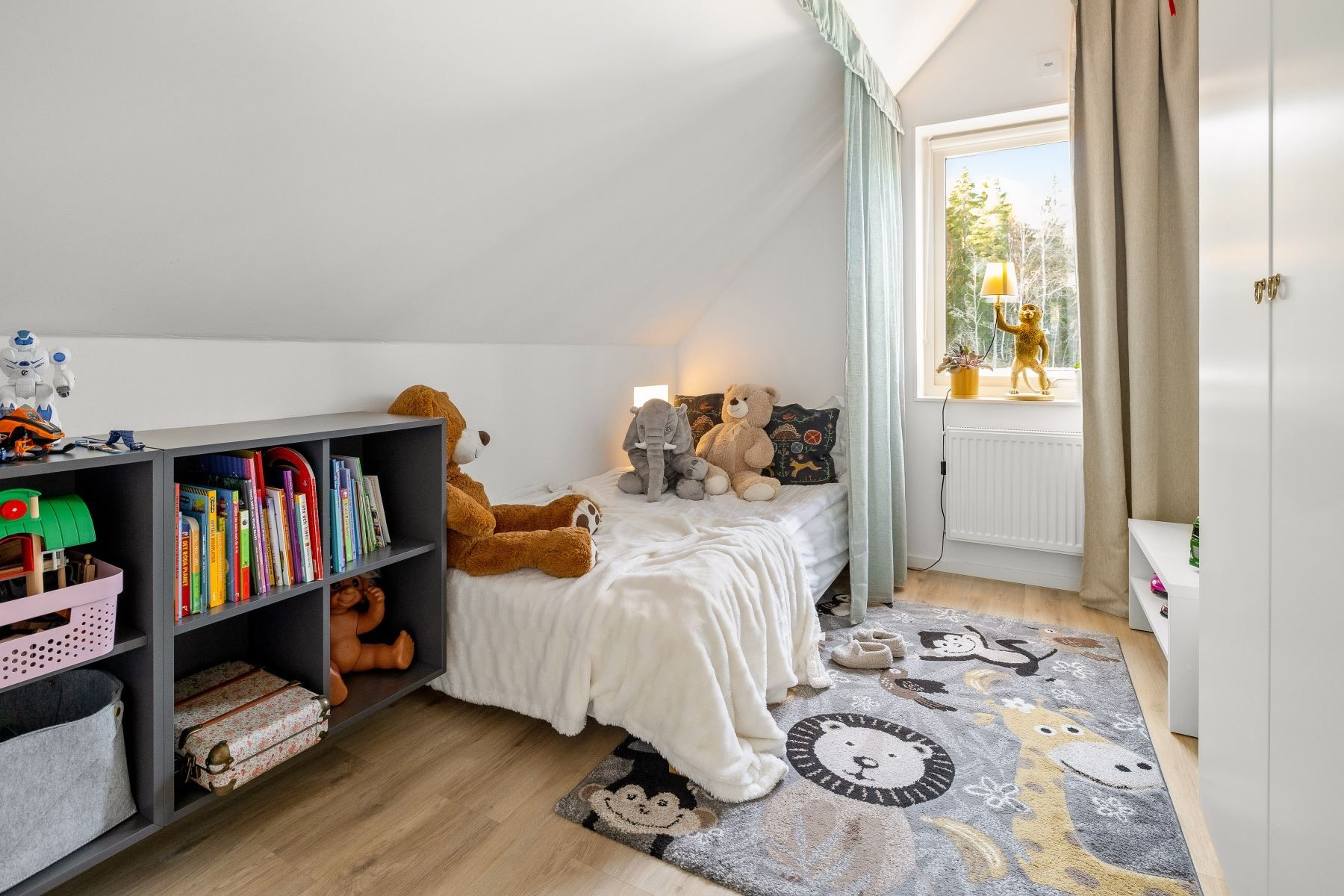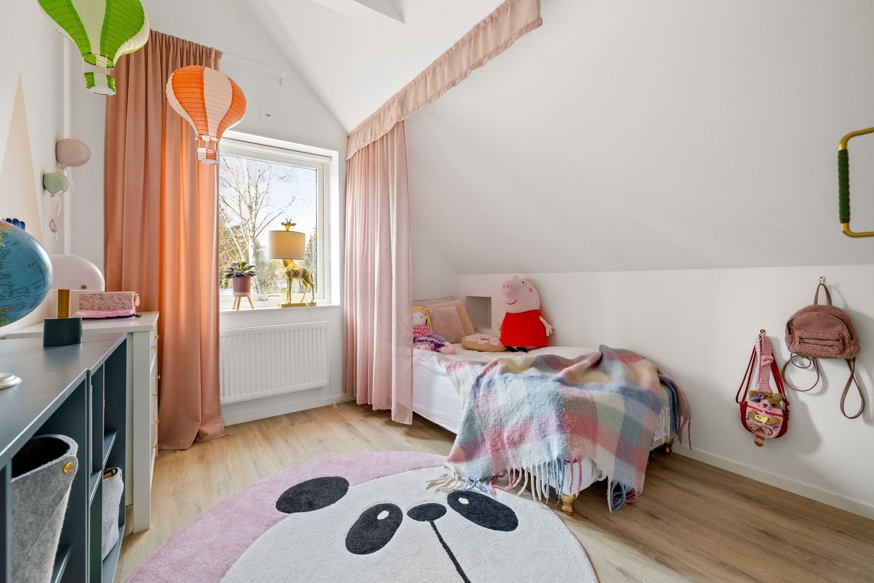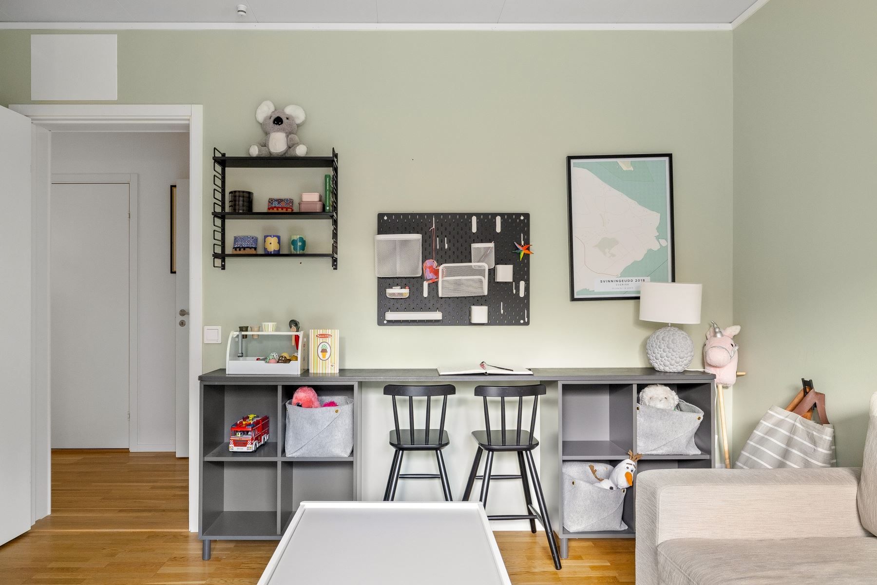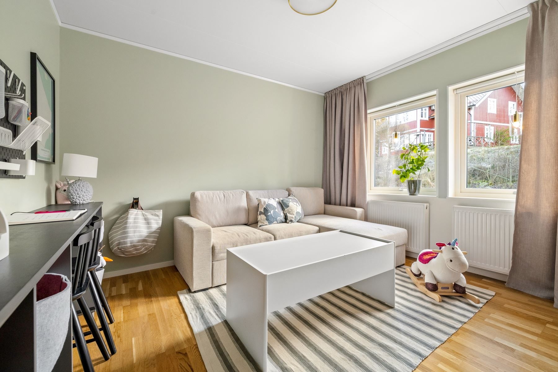 En trappa upp möts du av ett trivsamt allrum med plats för soffgrupp, arbetsplats eller annan möblering. Takfönster ger fint ljusinsläpp, och den generösa takhöjden skapar extra rymd. I direkt anslutning finns ett förvaringsutrymme med god kapacitet.