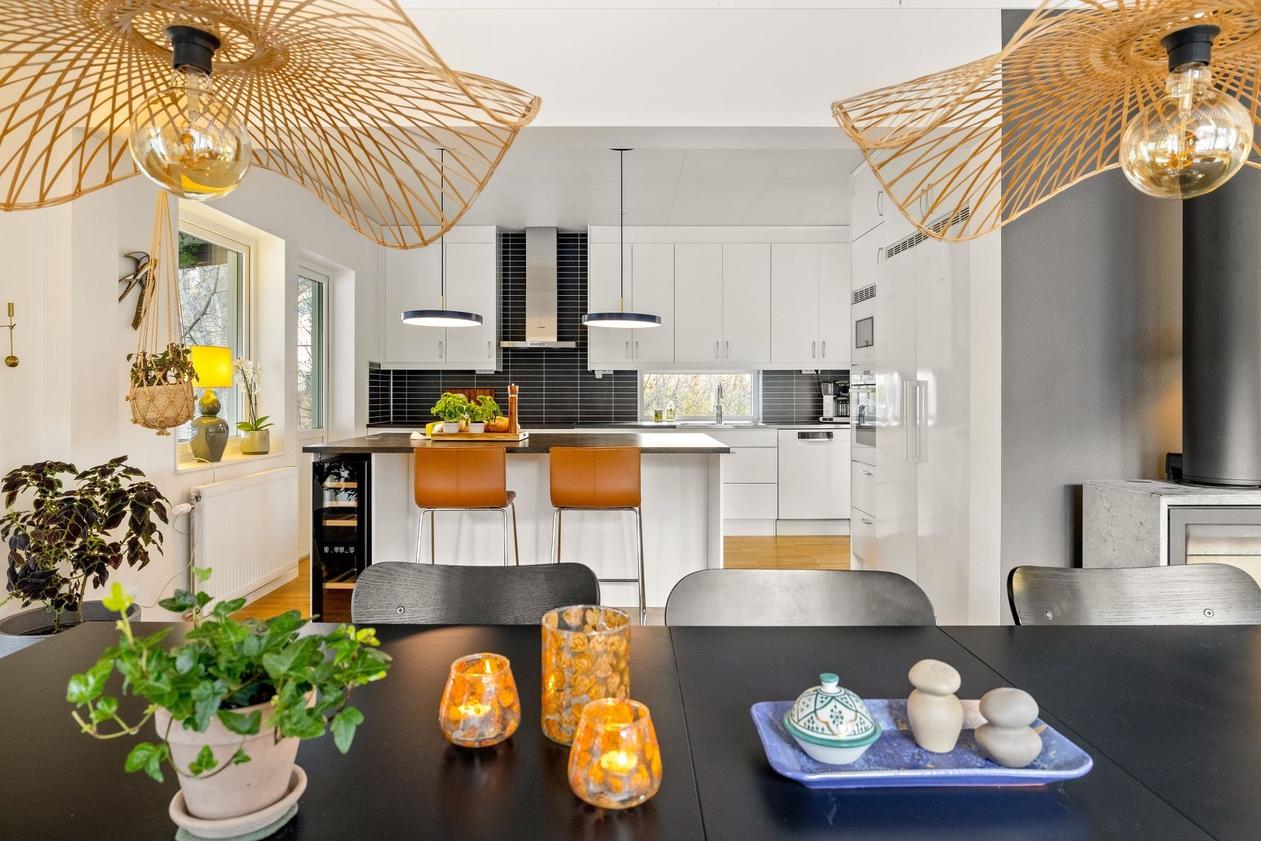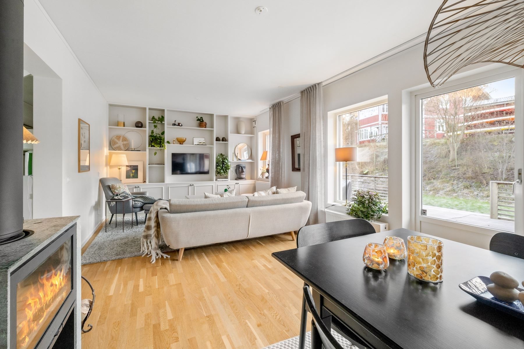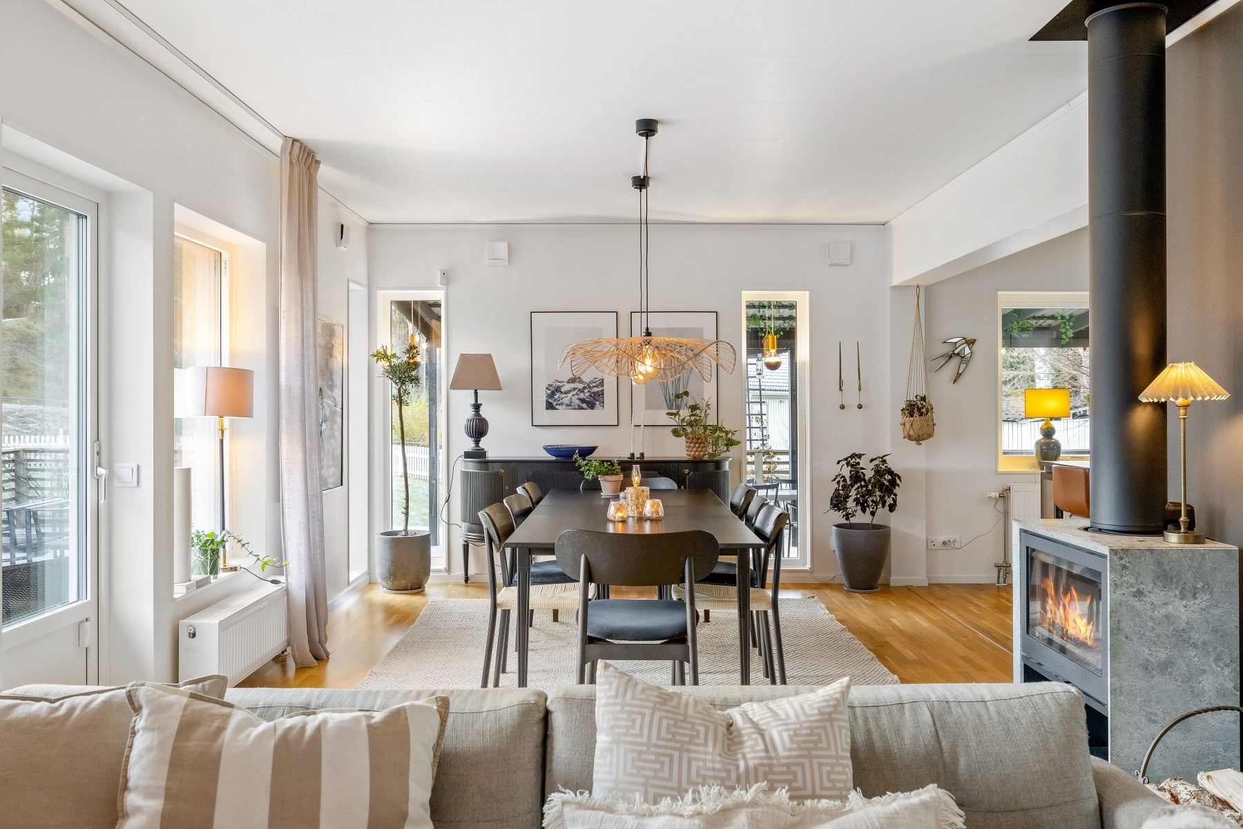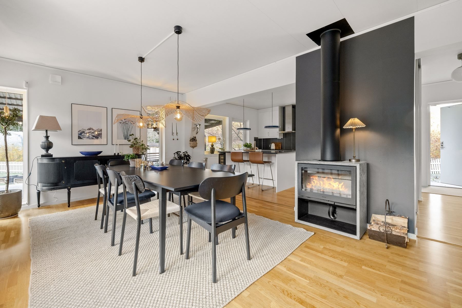 Vardagsrummet rymmer enkelt både en rejäl soffgrupp och stort matbord. Den generösa köksön skapar en självklar samlingspunkt för både matlagning och umgänge. Köket är fullutrustat, har gott om förvaring och utgör ett modernt nav i huset – medan den centralt placerade braskaminen ger både värme och stämning under årets kalla månader.