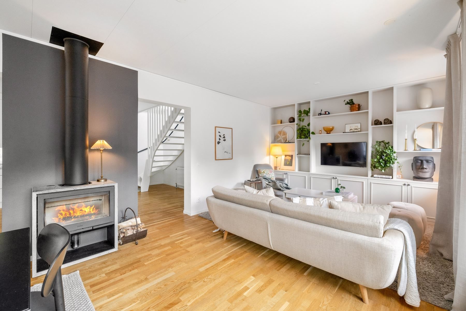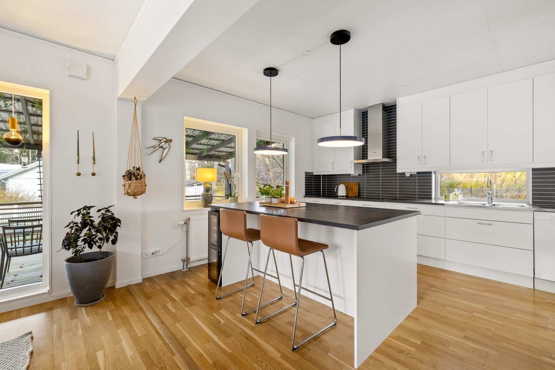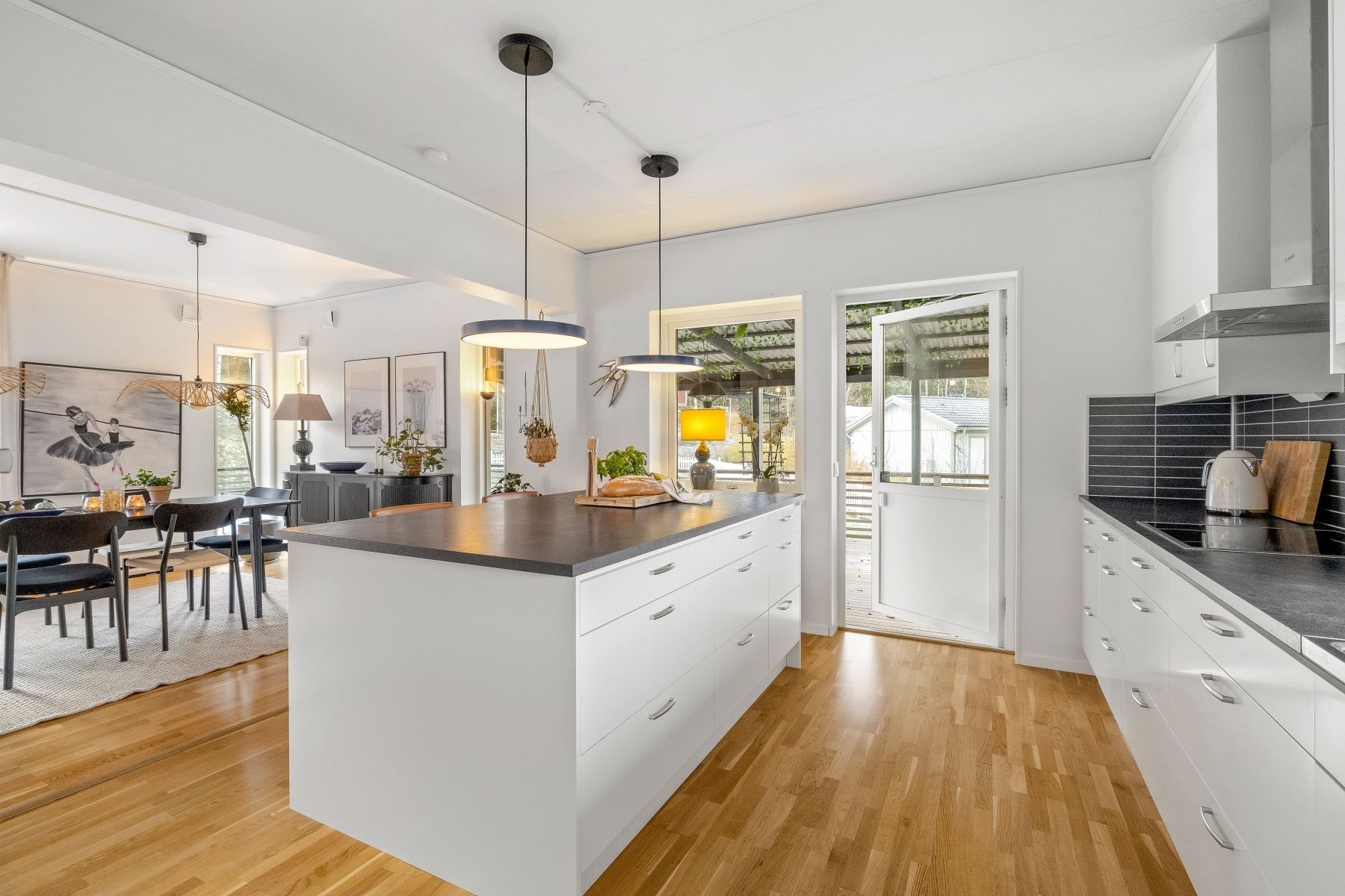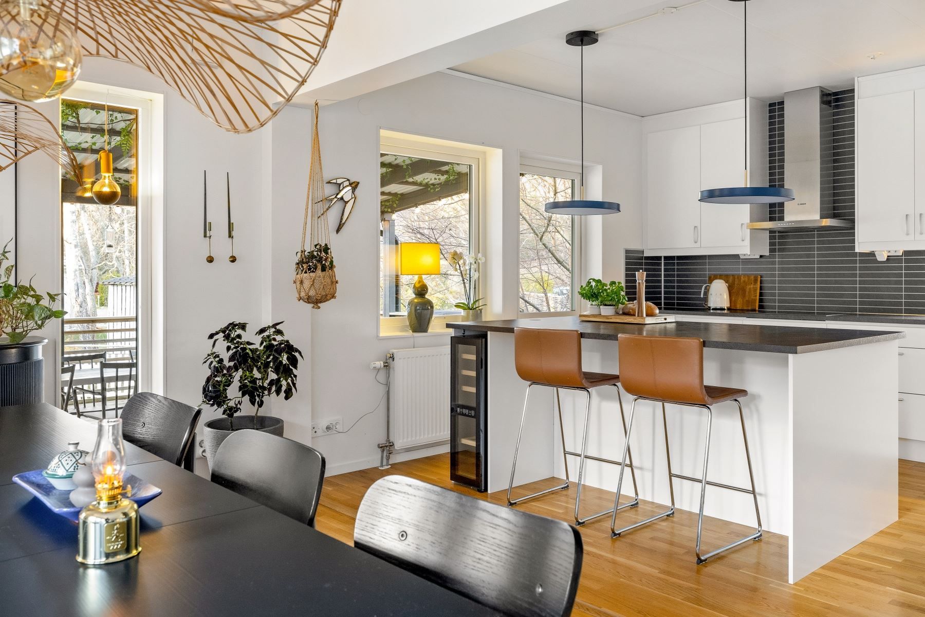 Vardagsrummet rymmer enkelt både en rejäl soffgrupp och stort matbord. Den generösa köksön skapar en självklar samlingspunkt för både matlagning och umgänge. Köket är fullutrustat, har gott om förvaring och utgör ett modernt nav i huset – medan den centralt placerade braskaminen ger både värme och stämning under årets kalla månader.