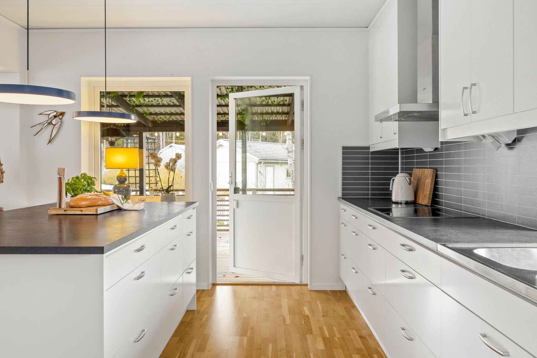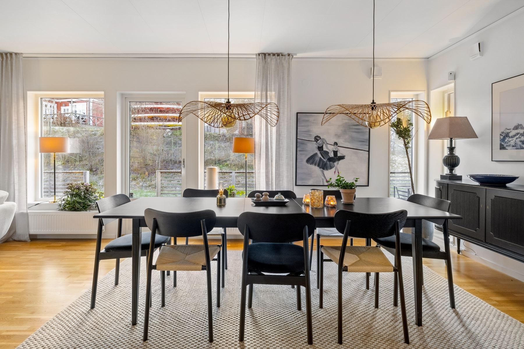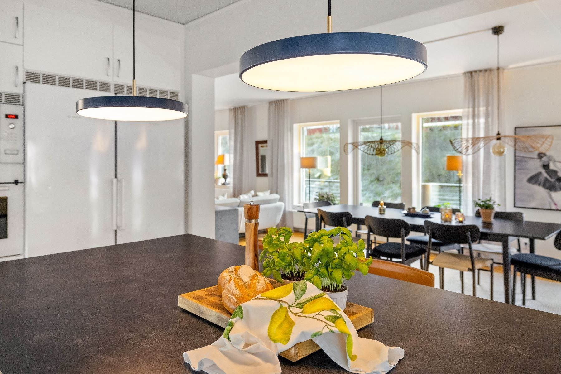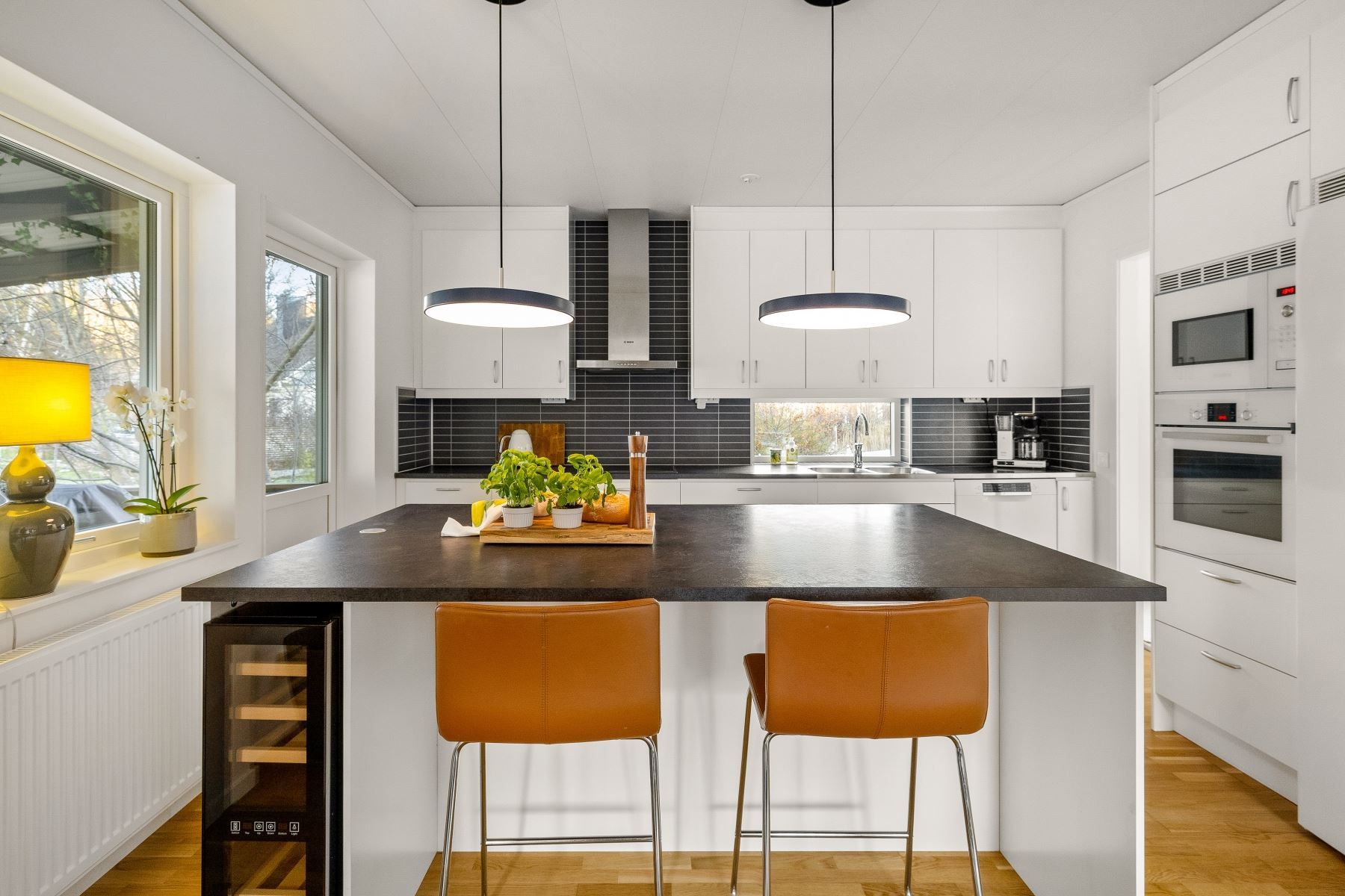 Vardagsrummet rymmer enkelt både en rejäl soffgrupp och stort matbord. Den generösa köksön skapar en självklar samlingspunkt för både matlagning och umgänge. Köket är fullutrustat, har gott om förvaring och utgör ett modernt nav i huset – medan den centralt placerade braskaminen ger både värme och stämning under årets kalla månader.