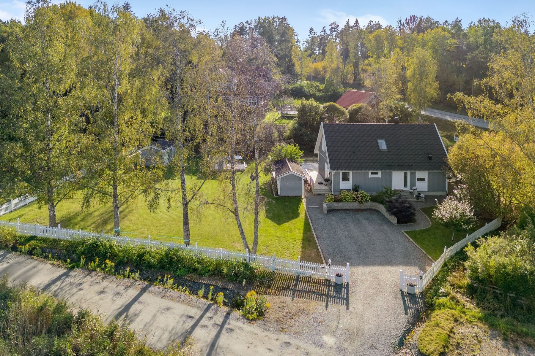 Intill huset finns en praktisk förrådsbyggnad, och den rymliga infarten rymmer flera bilar – här finns även möjlighet att ladda elbil.