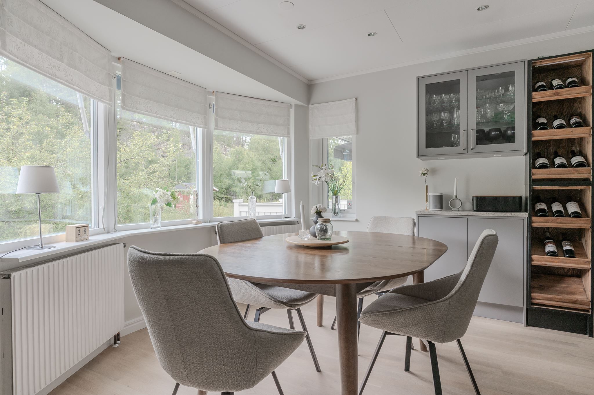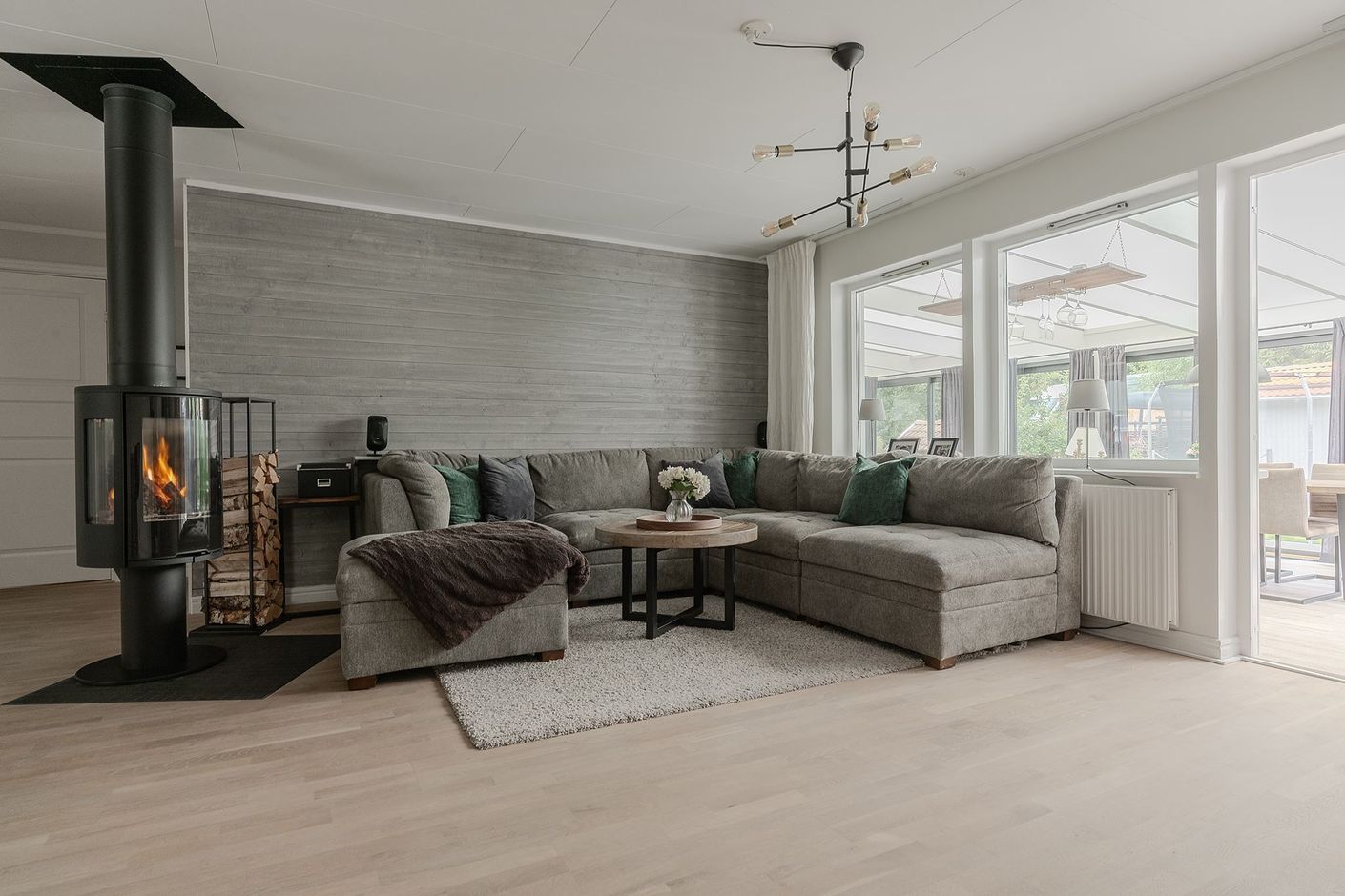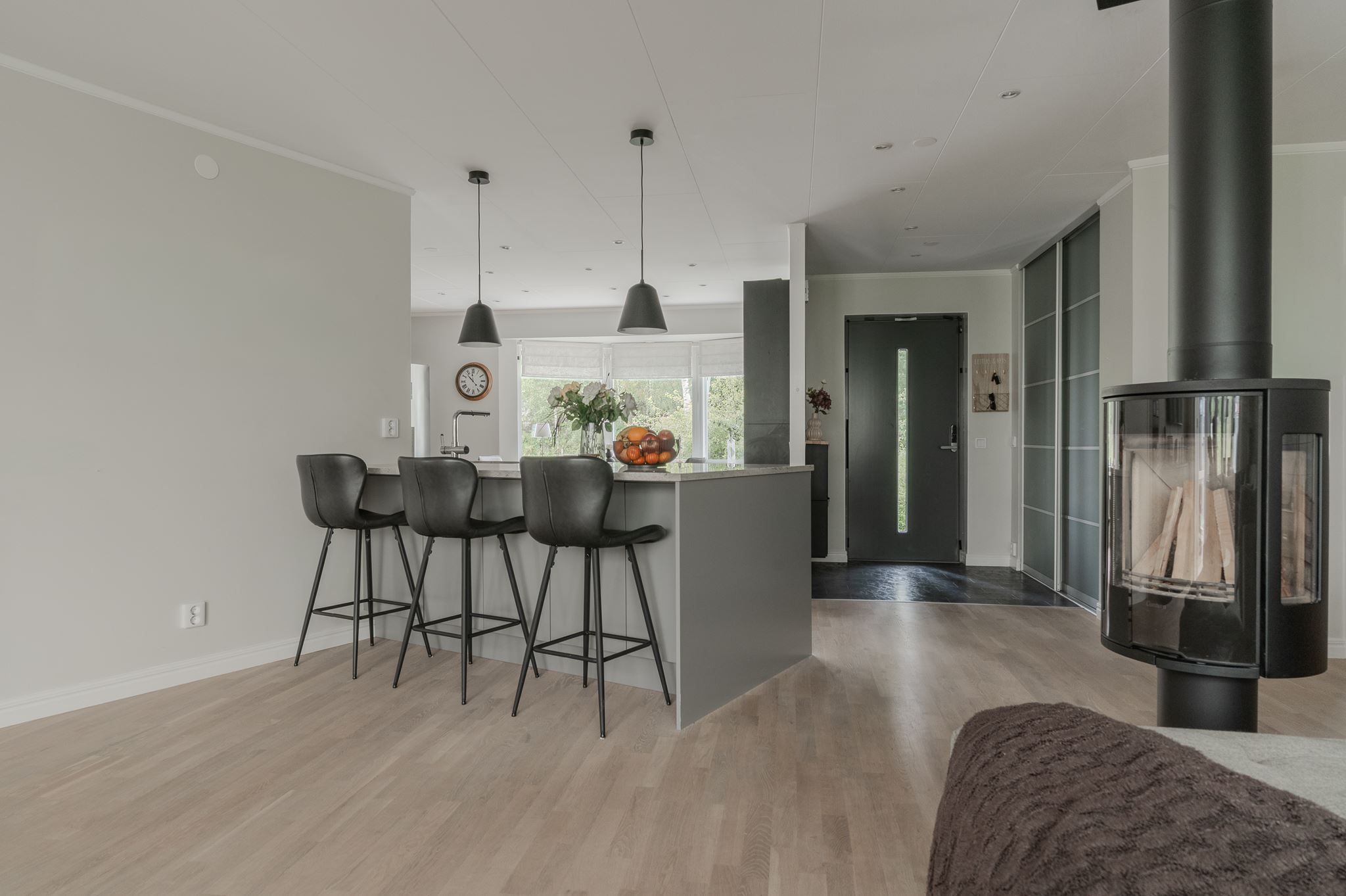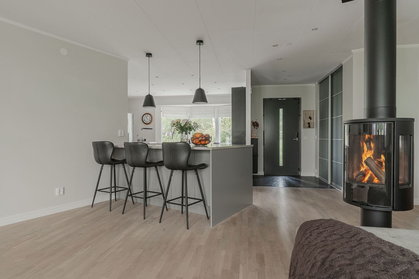 Redan vid uppfarten märks det att detta är ett hem som är något utöver det vanliga. Den känslan följer med in i varje rum och vidare ut i den fantastiska trädgården. Huset är väl omhändertaget och smakfullt renoverat med genomtänkta materialval och en tydlig känsla för detaljer. De varma väggtonerna och den ljusa parketten skapar en harmonisk helhet genom hela bostaden. Köket från Vedum är både stilrent och praktiskt, en naturlig samlingspunkt där matlagning, läxläsning och sociala stunder möts. I den öppna planlösningen mot vardagsrummet står en kamin centralt placerad som både värmer och skapar atmosfär. Här finns fyra sovrum och två badrum med dusch, smart fördelade på vardera sidan av huset.