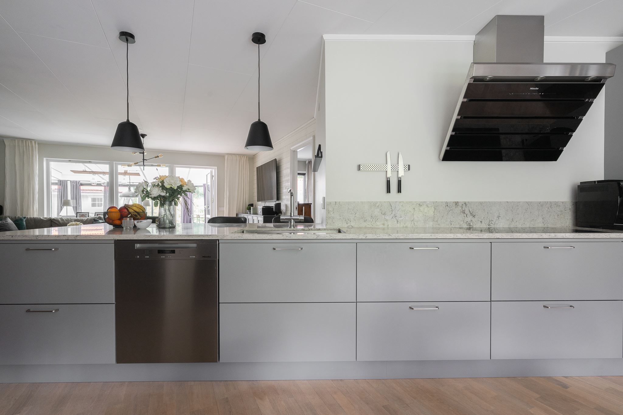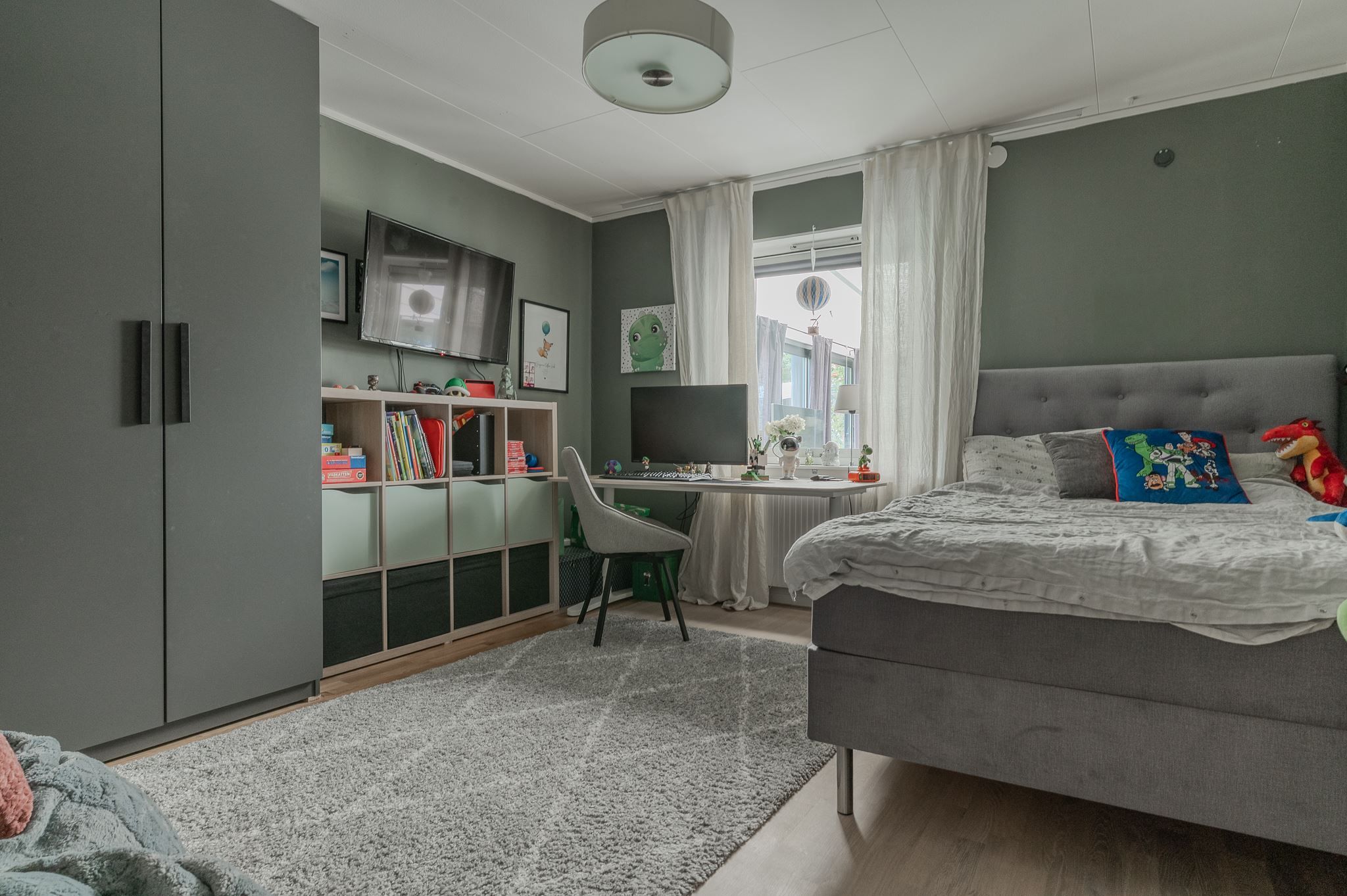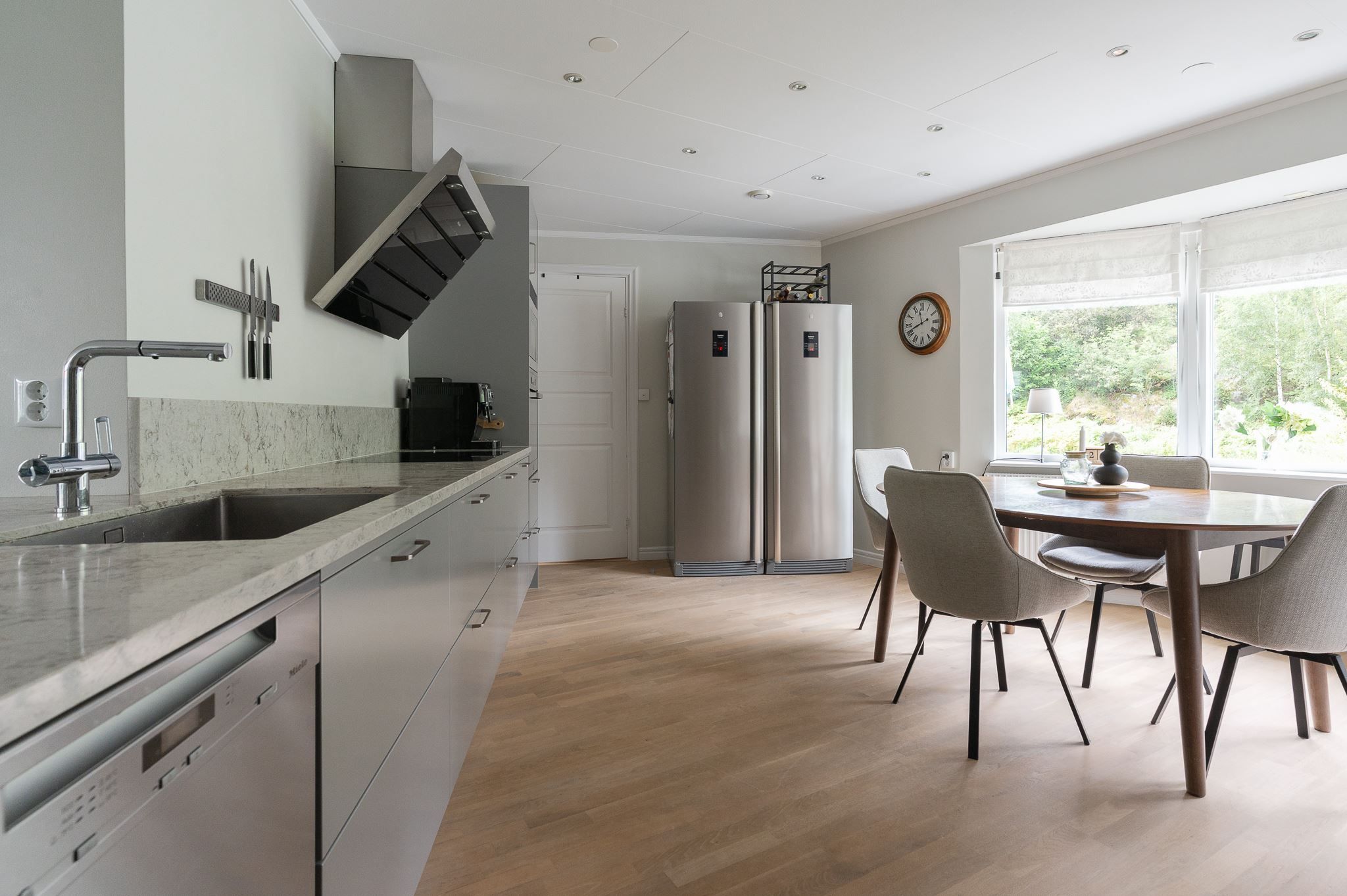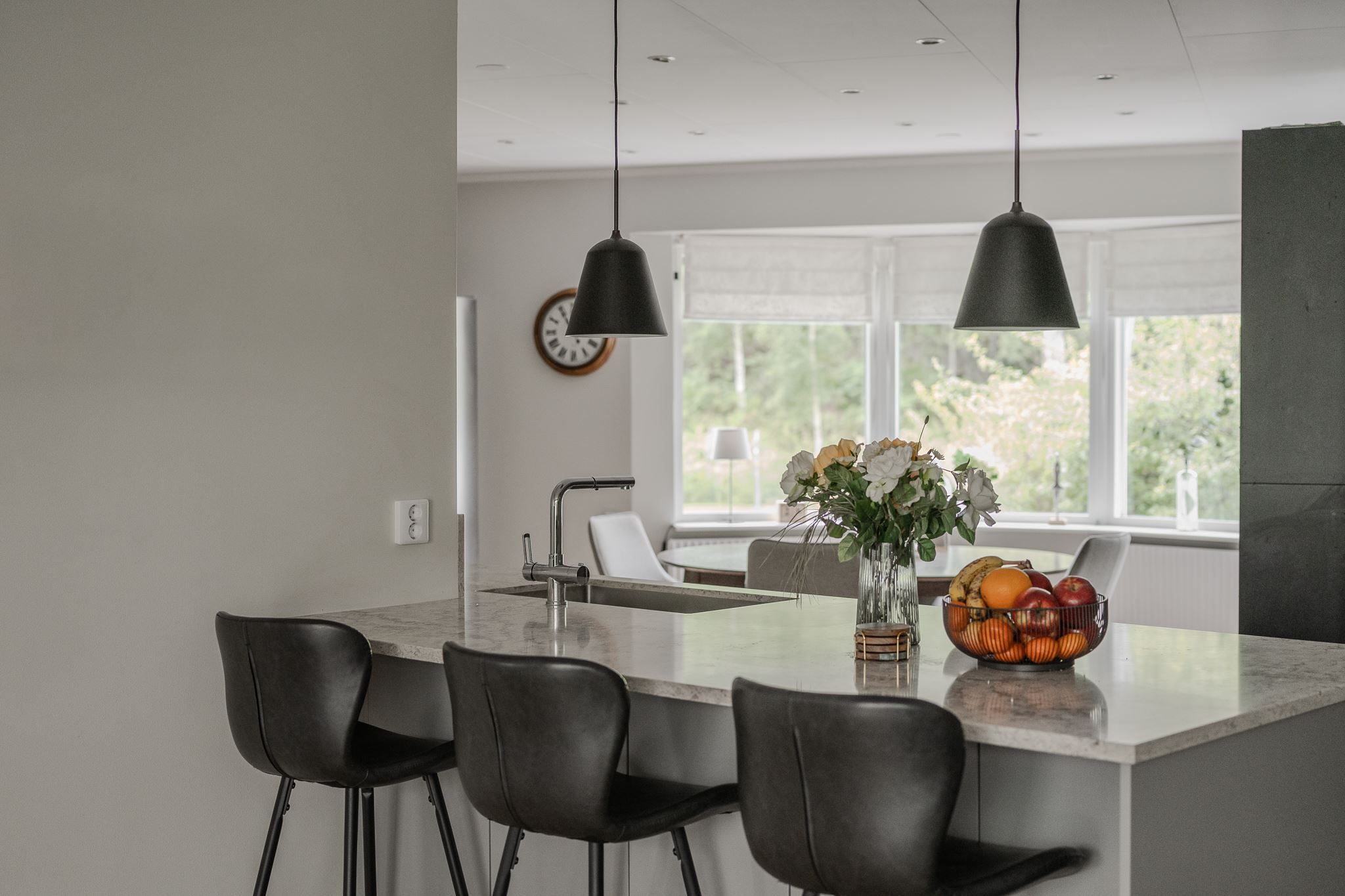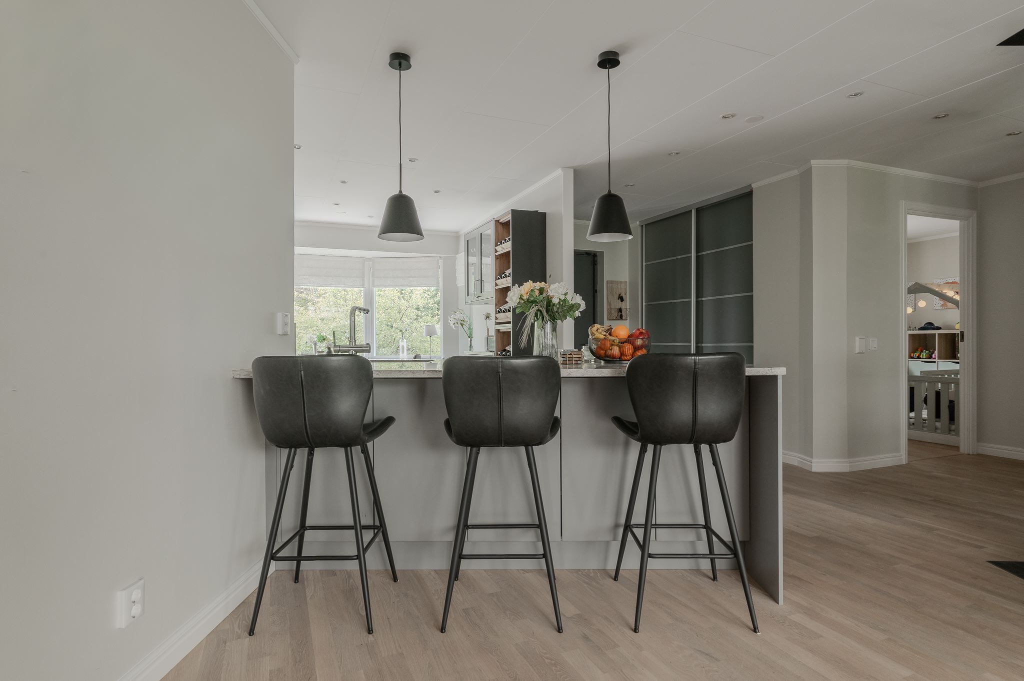 Redan vid uppfarten märks det att detta är ett hem som är något utöver det vanliga. Den känslan följer med in i varje rum och vidare ut i den fantastiska trädgården. Huset är väl omhändertaget och smakfullt renoverat med genomtänkta materialval och en tydlig känsla för detaljer. De varma väggtonerna och den ljusa parketten skapar en harmonisk helhet genom hela bostaden. Köket från Vedum är både stilrent och praktiskt, en naturlig samlingspunkt där matlagning, läxläsning och sociala stunder möts. I den öppna planlösningen mot vardagsrummet står en kamin centralt placerad som både värmer och skapar atmosfär. Här finns fyra sovrum och två badrum med dusch, smart fördelade på vardera sidan av huset.
