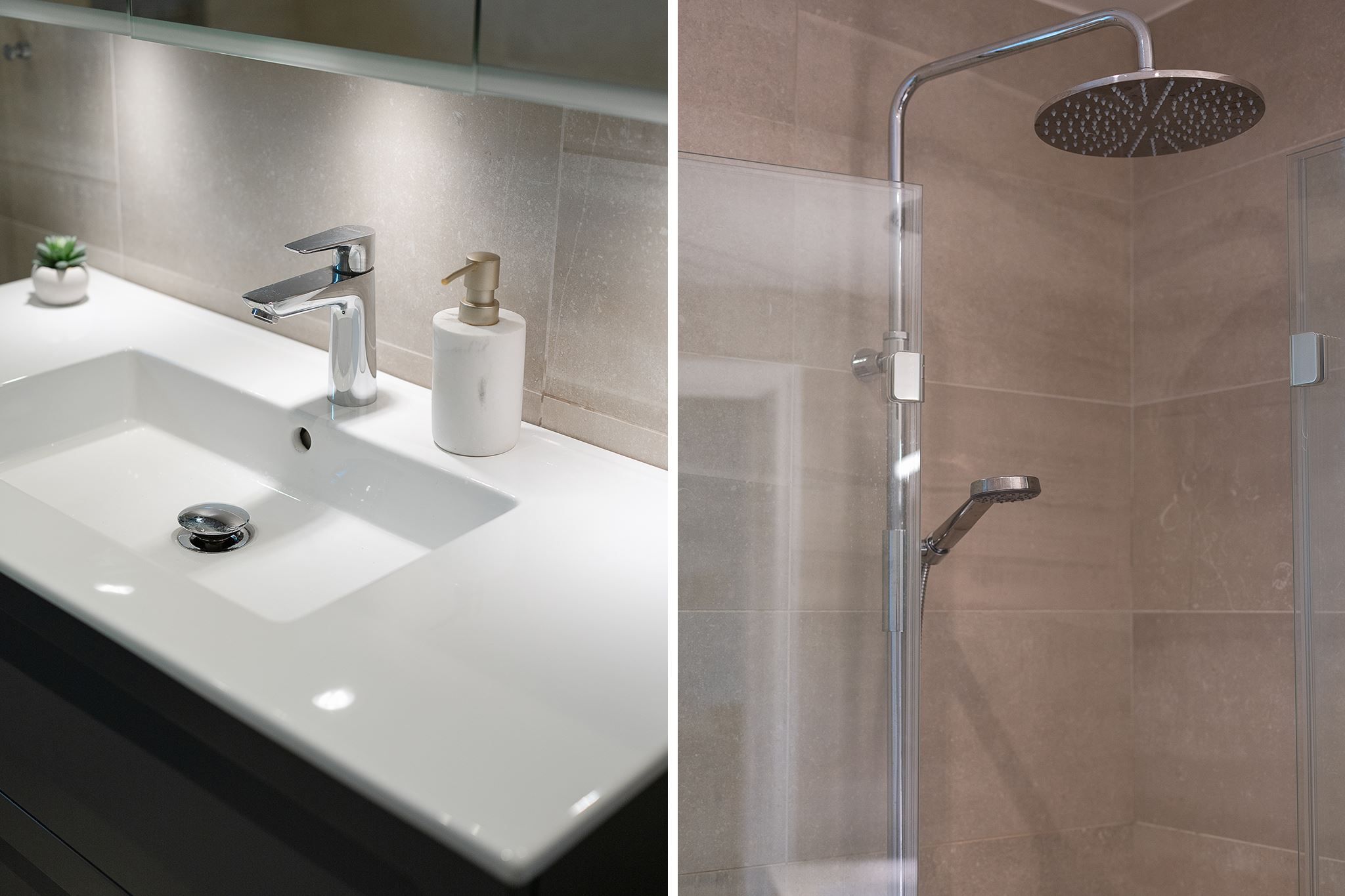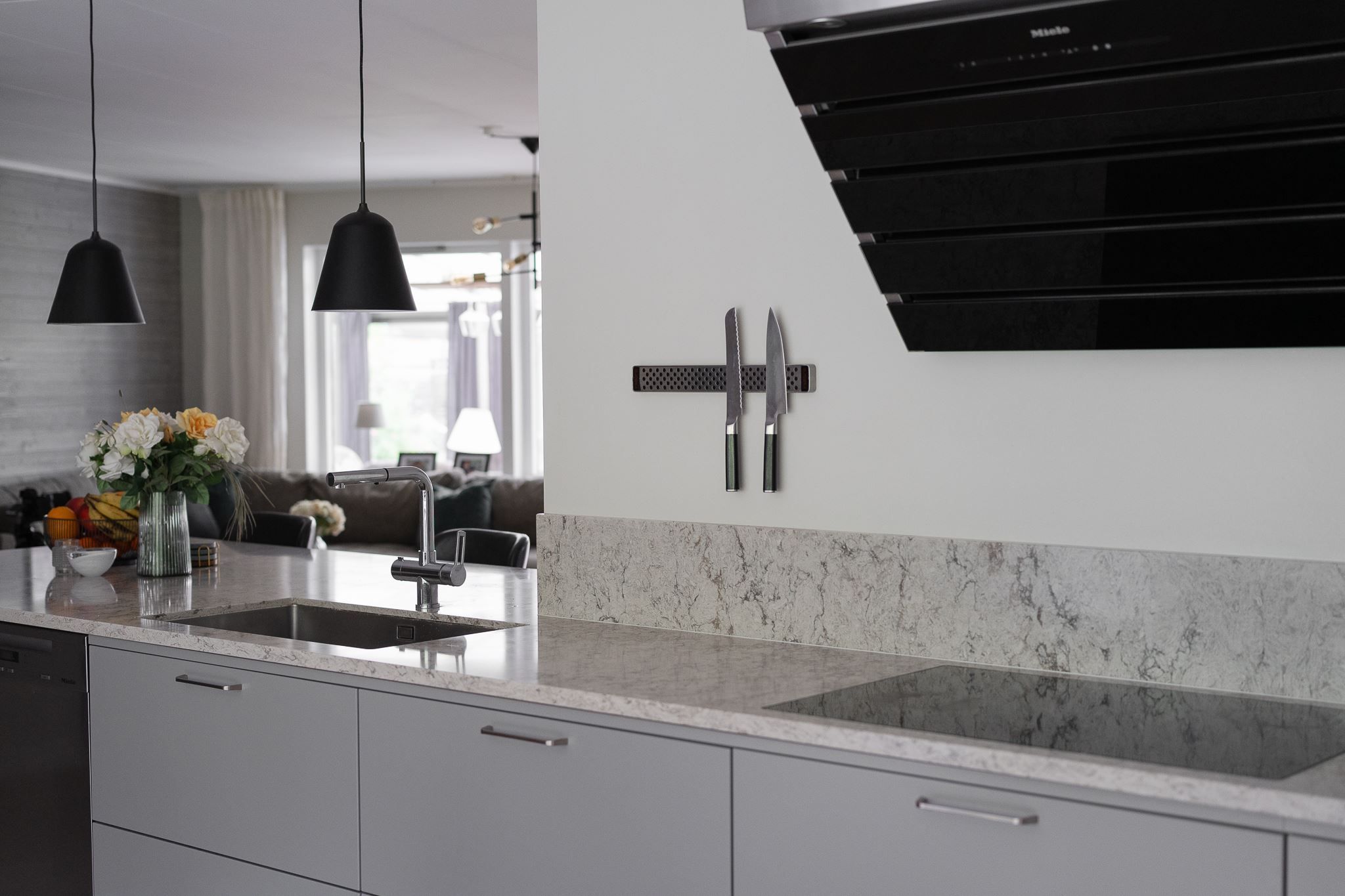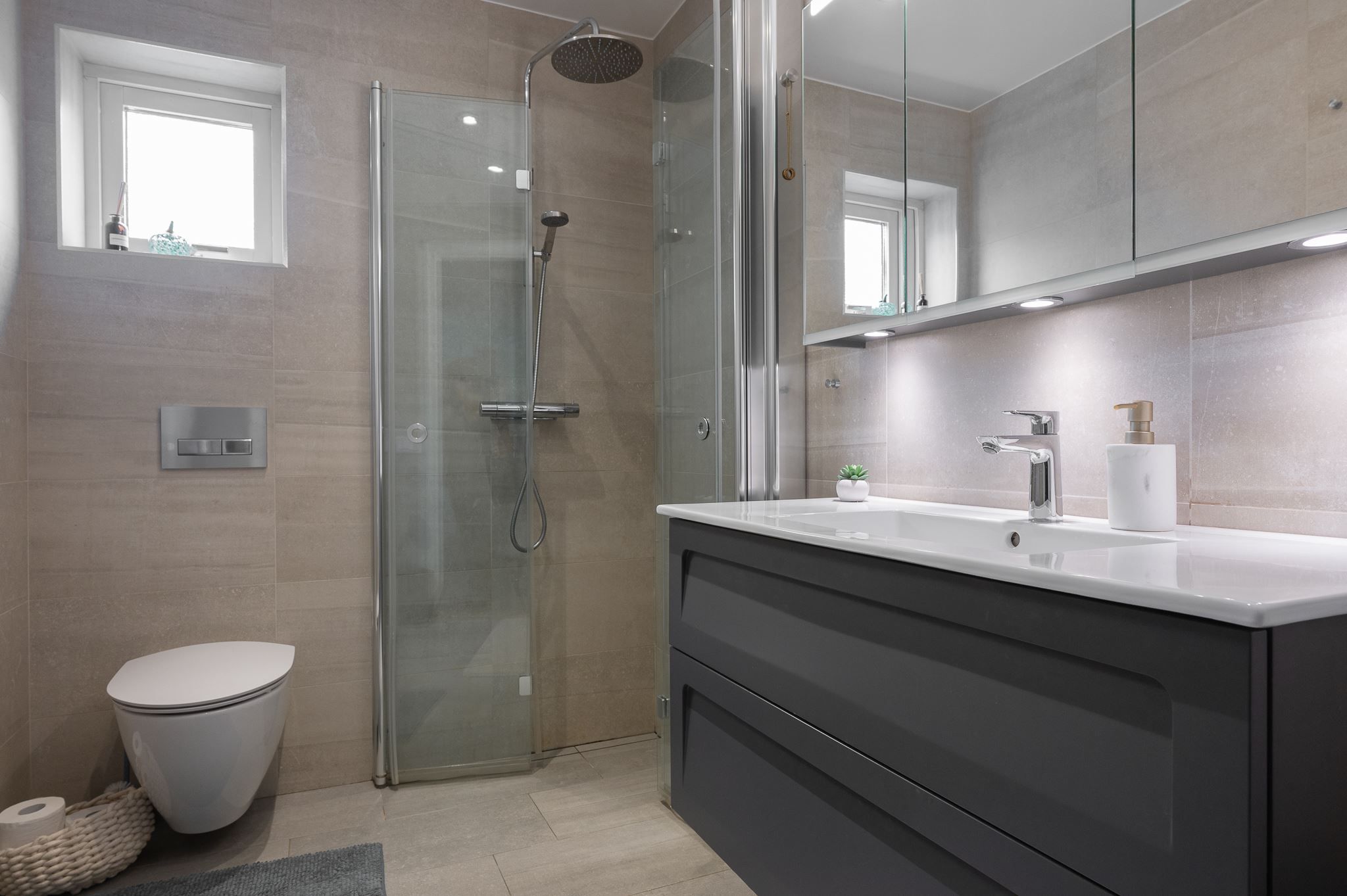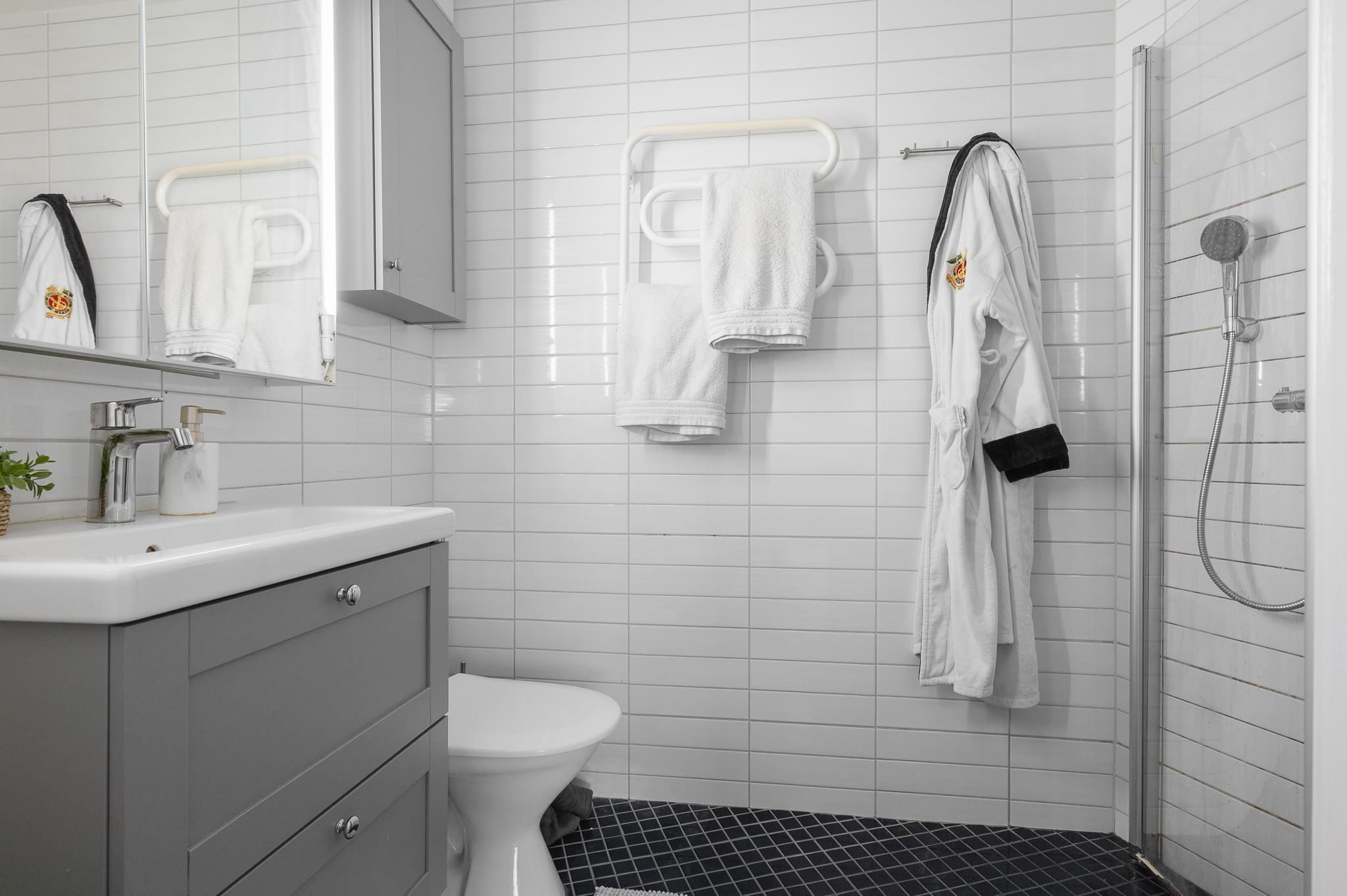 Tvättstugan nås smidigt både från köket och via en egen utgång mot framsidan. Tvättmaskin från Miele och torktumlare från Huskvarna är placerade under en rymlig arbetsbänk som ger gott om yta för vikning och sortering. En tvättho underlättar grovtvätt och städmoment, samtidigt som välplanerade skåp och generösa ytor för klädhängning gör det enkelt att hålla ordning. Här återfinns även husets centraldammsugare samt ett praktiskt förråd/skafferi som ger extra förvaring för både hushållsartiklar och förnödenheter.