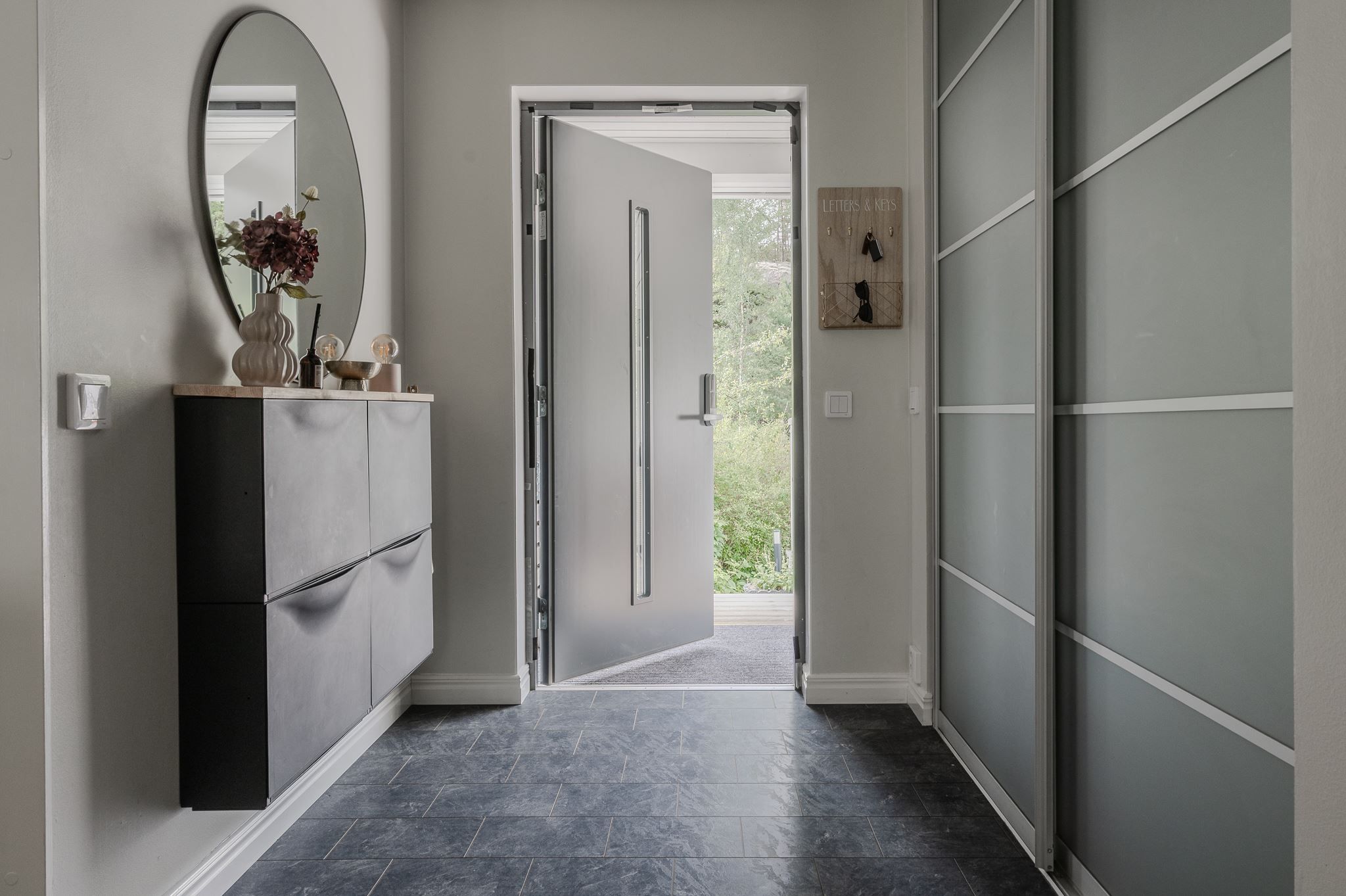 En modern fördel med huset är de installerade solpanelerna som tillsammans med ett stort batteri gör boendet både klimatsmart och kostnadseffektivt.