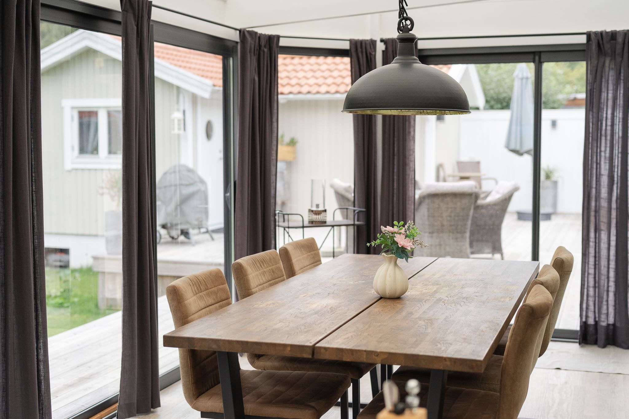 Från vardagsrummet når du hemmets kanske mest uppskattade del, ett uterum från Willab Garden om hela 32 kvm med vattenburen golvvärme och egen braskamin. Här tillbringas tid året om, som vardagsrum, matsal och social yta. Under sommaren kan skjutdörrarna öppnas upp mot altanen vilket suddar ut gränsen mellan ute och inne.