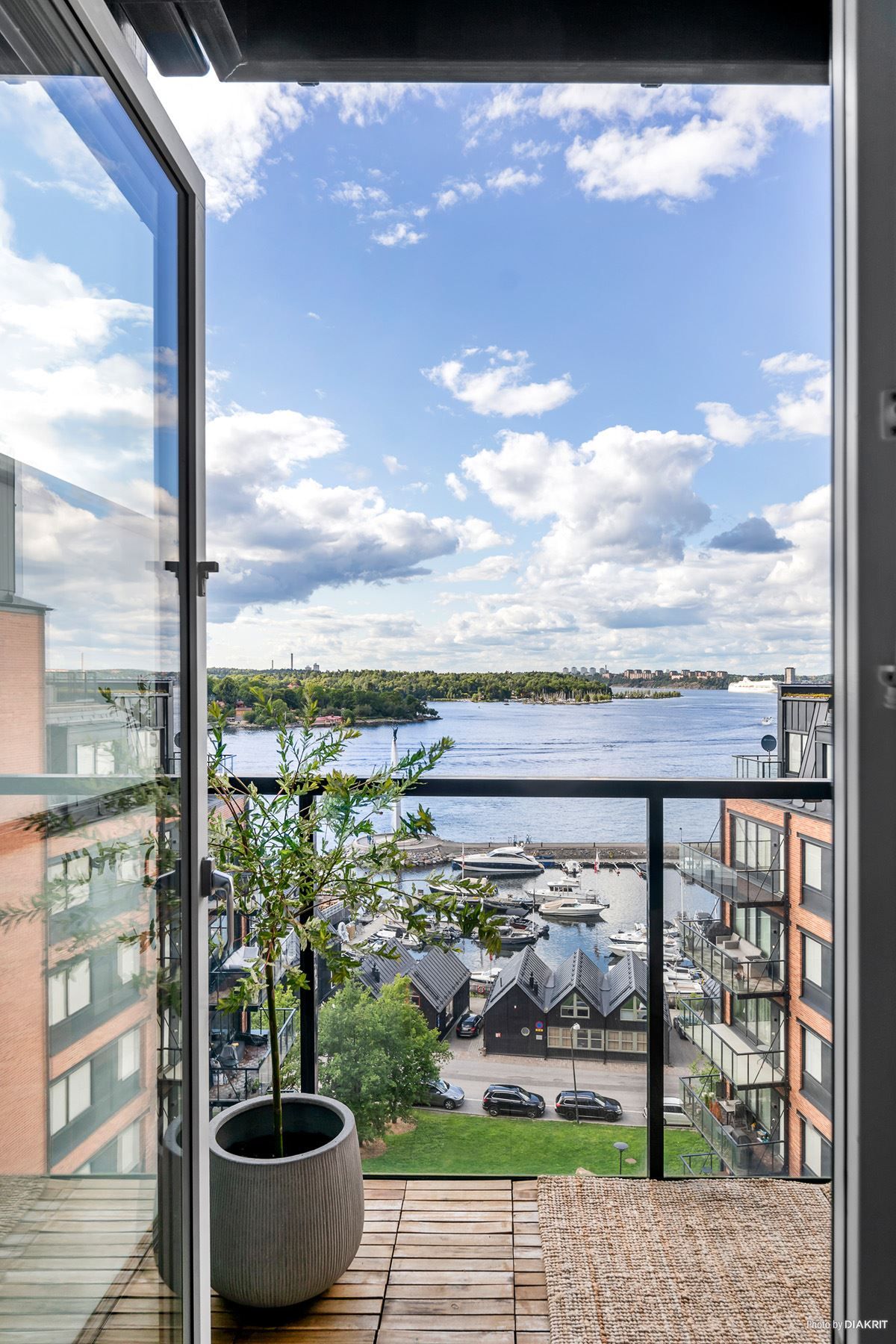 Exklusiv bostad med balkong med kvällssol och havsutsikt över Stockholms inlopp!