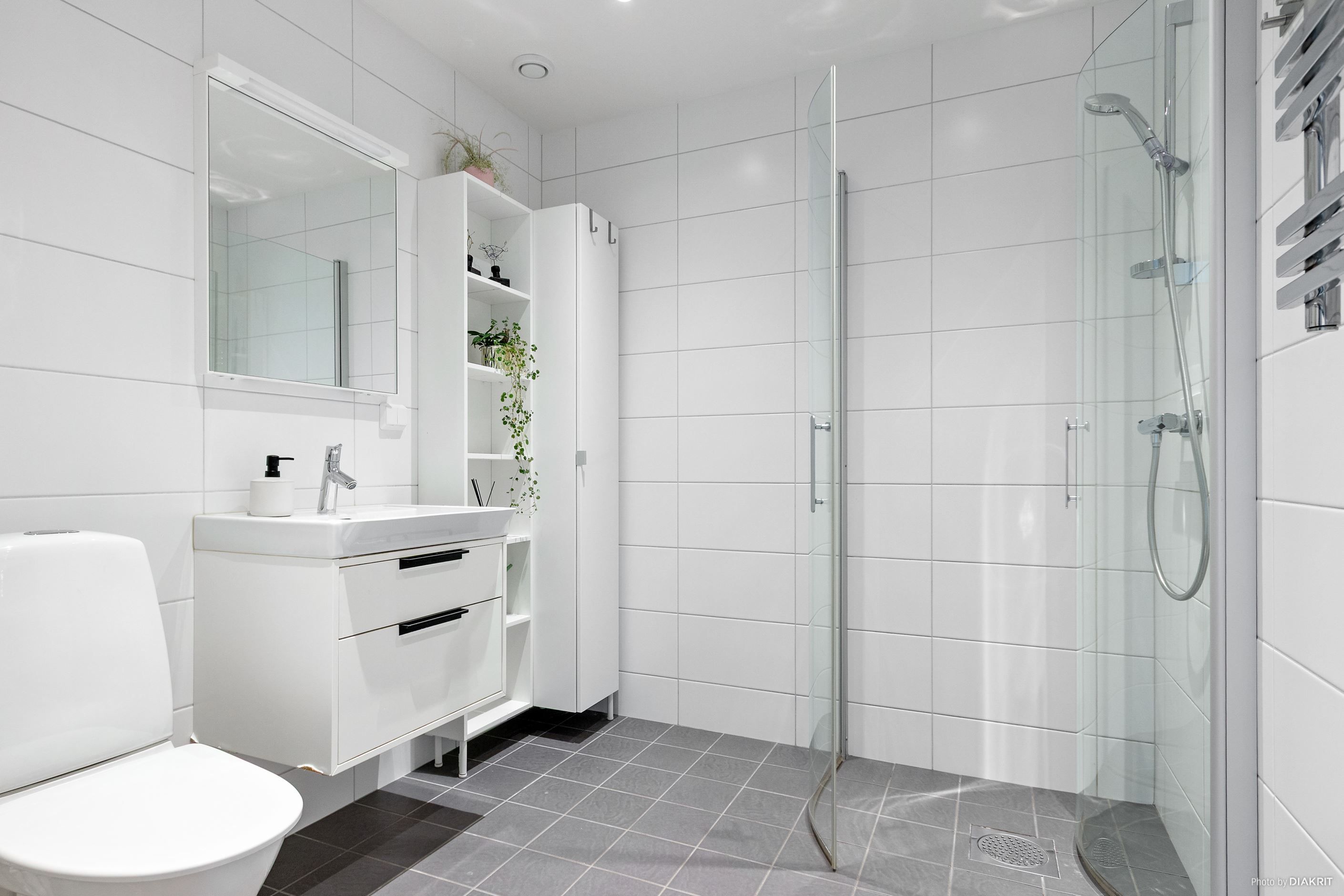 På övre plan finns även ett helkaklat badrum som är utrustat med duschhörna. Här finns även toalett samt kommod med handfat.