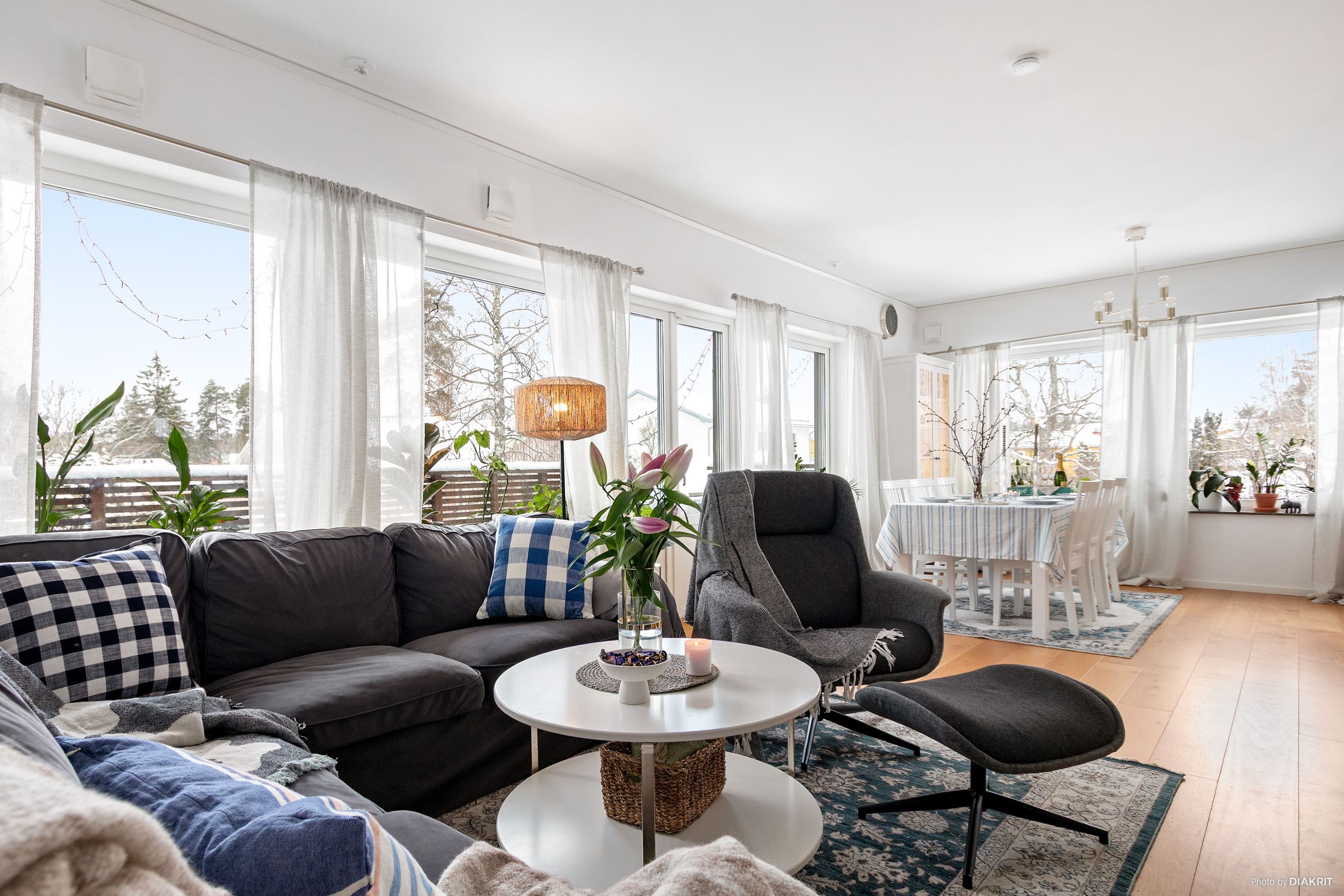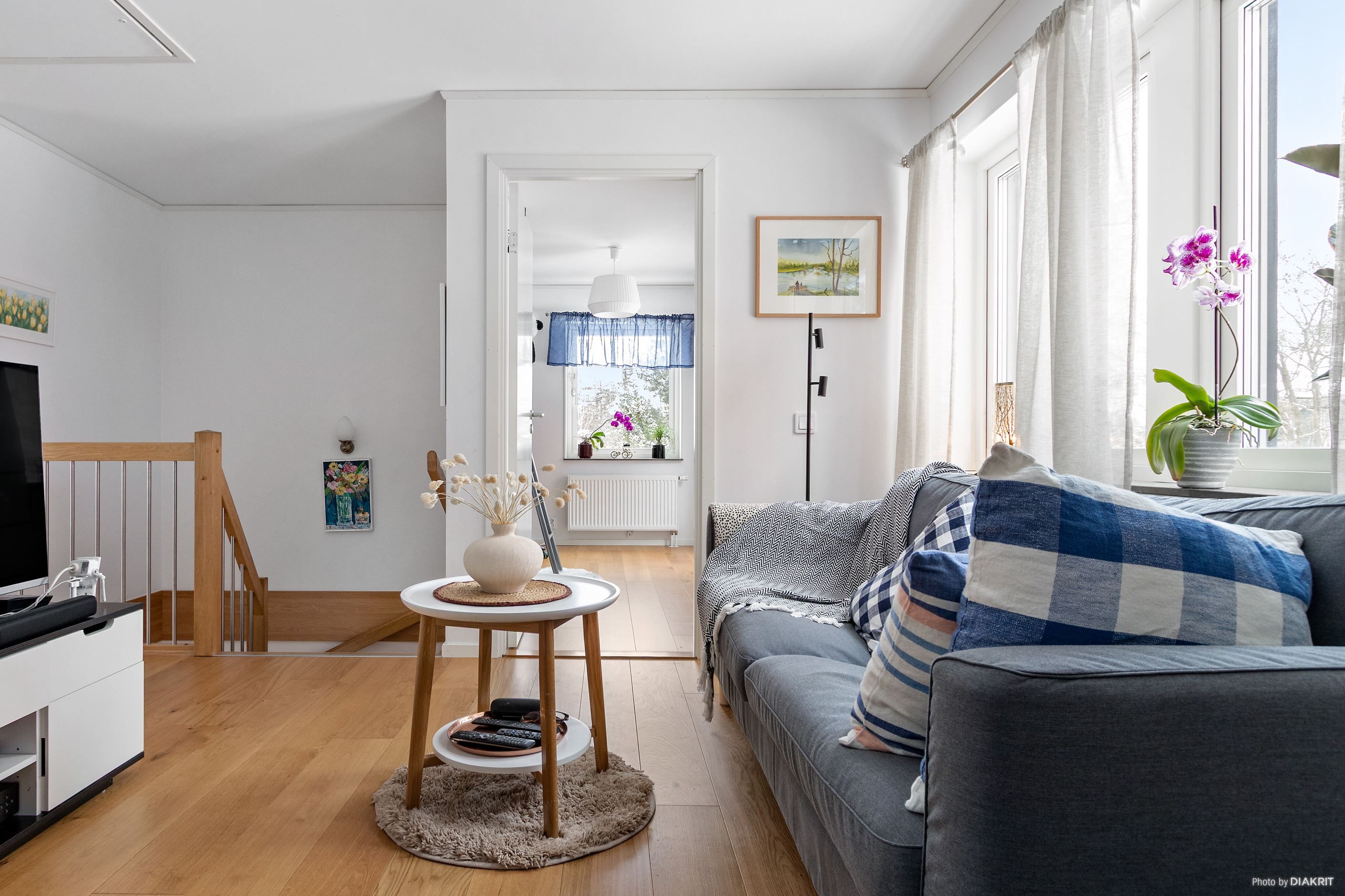 När vi kliver in genom entrédörren så möts vi av en välkomnande, ljus hall med klinkergolv och plats för avhängning. Vidare in på entrévåningen finns ett vardagsrum med gott om plats för soffgrupp och tv-möblemang, matplats samt utgång till altan/uteplats.