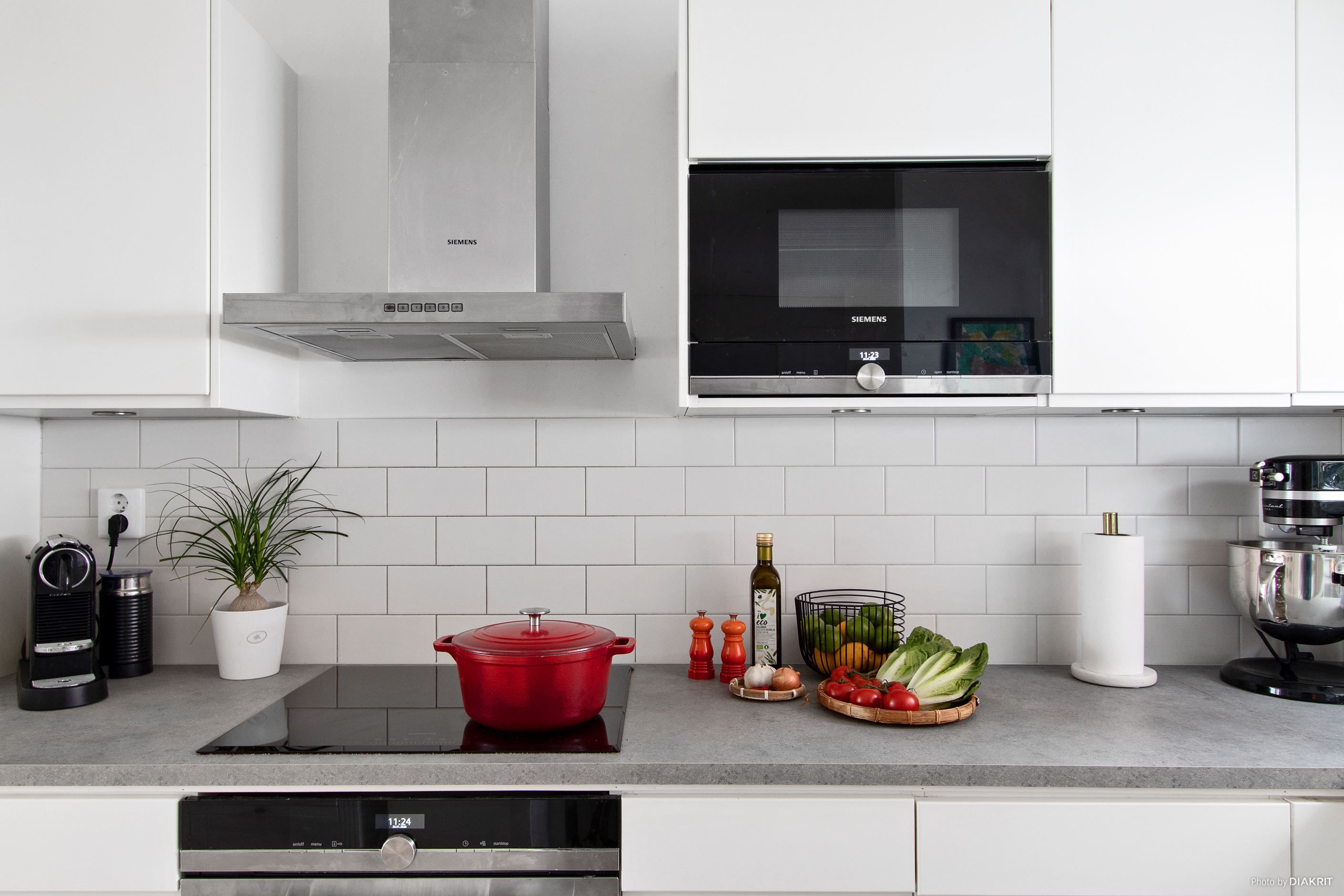 Det fullutrustade köket ligger i anslutning och erbjuder gott om förvaringsutrymme och arbetsyta. Vitvaror från Siemens med kyl och frys i fullhöjd, inbyggd mikrovågsugn, inbyggd varmluftsugn, induktionshäll samt diskmaskin.