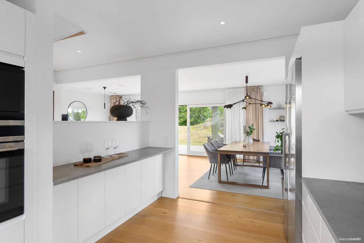 När vi tar trappan upp till mellanvåningen så möts vi av de härliga stora sociala ytorna, med öppen planlösning mellan kök och vardagsrum. Här finns stort skjutglasparti som går att öppna upp ut mot den stora uteplatsen i söderläge med utsikt mot natur och grönområde, samt gott om plats för utemöbler och grillmöjligheter.