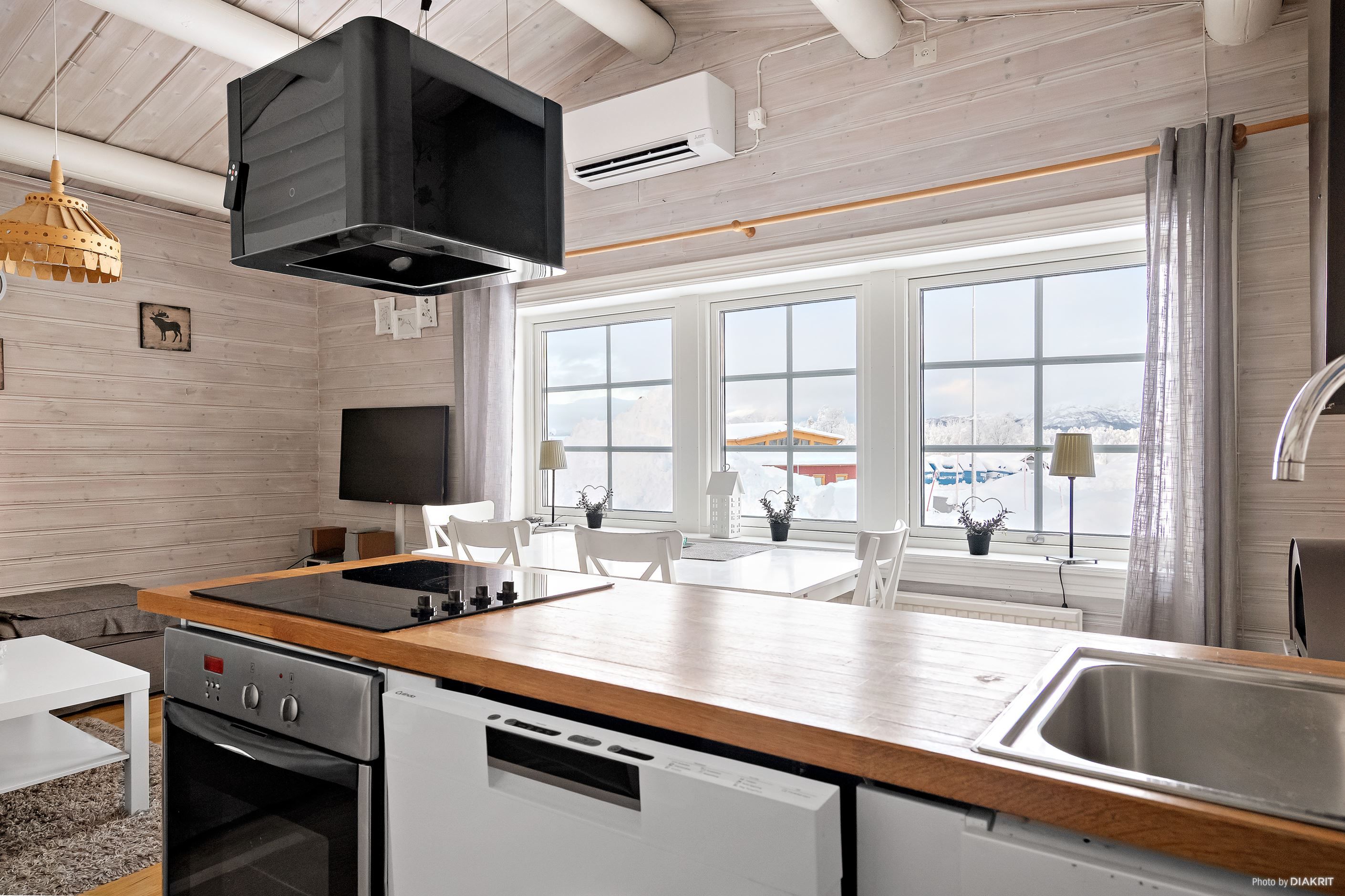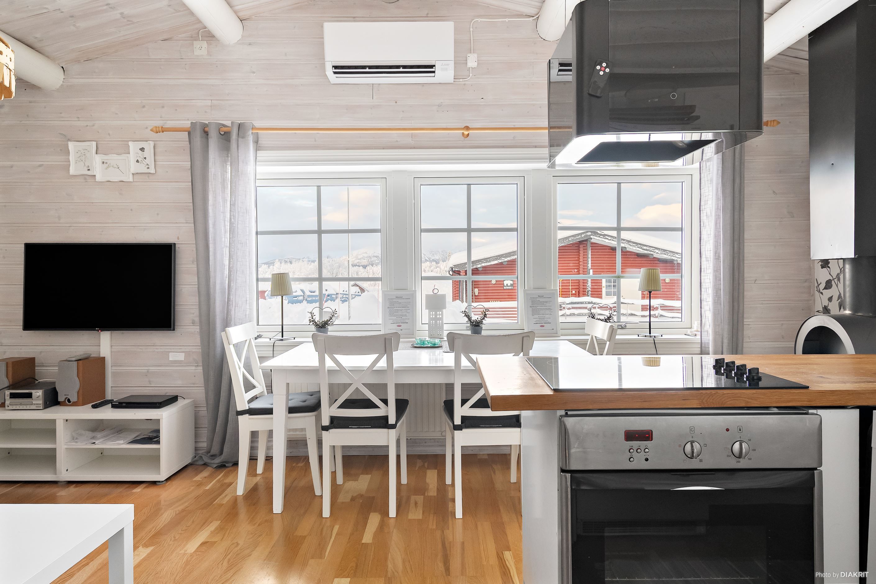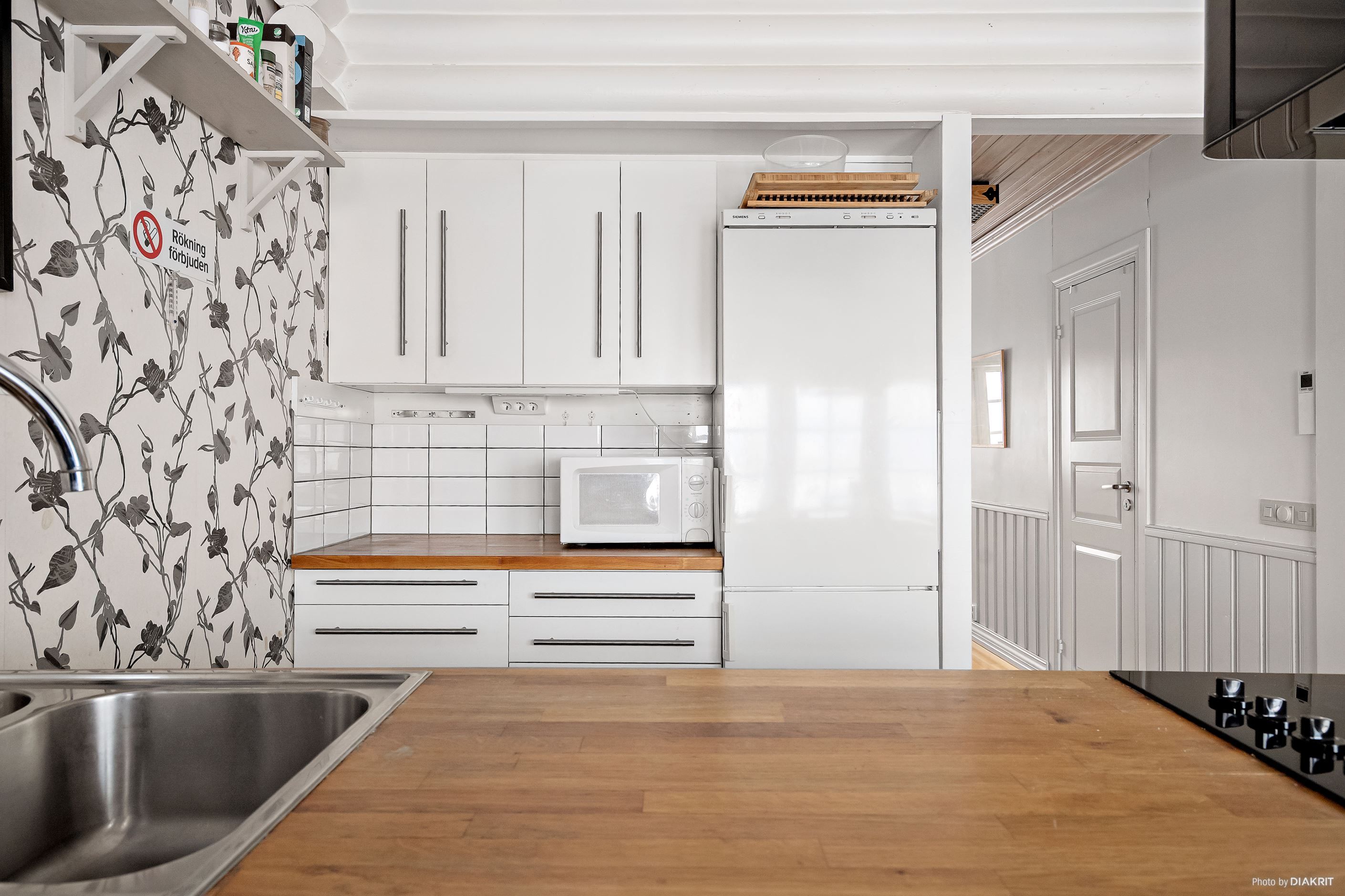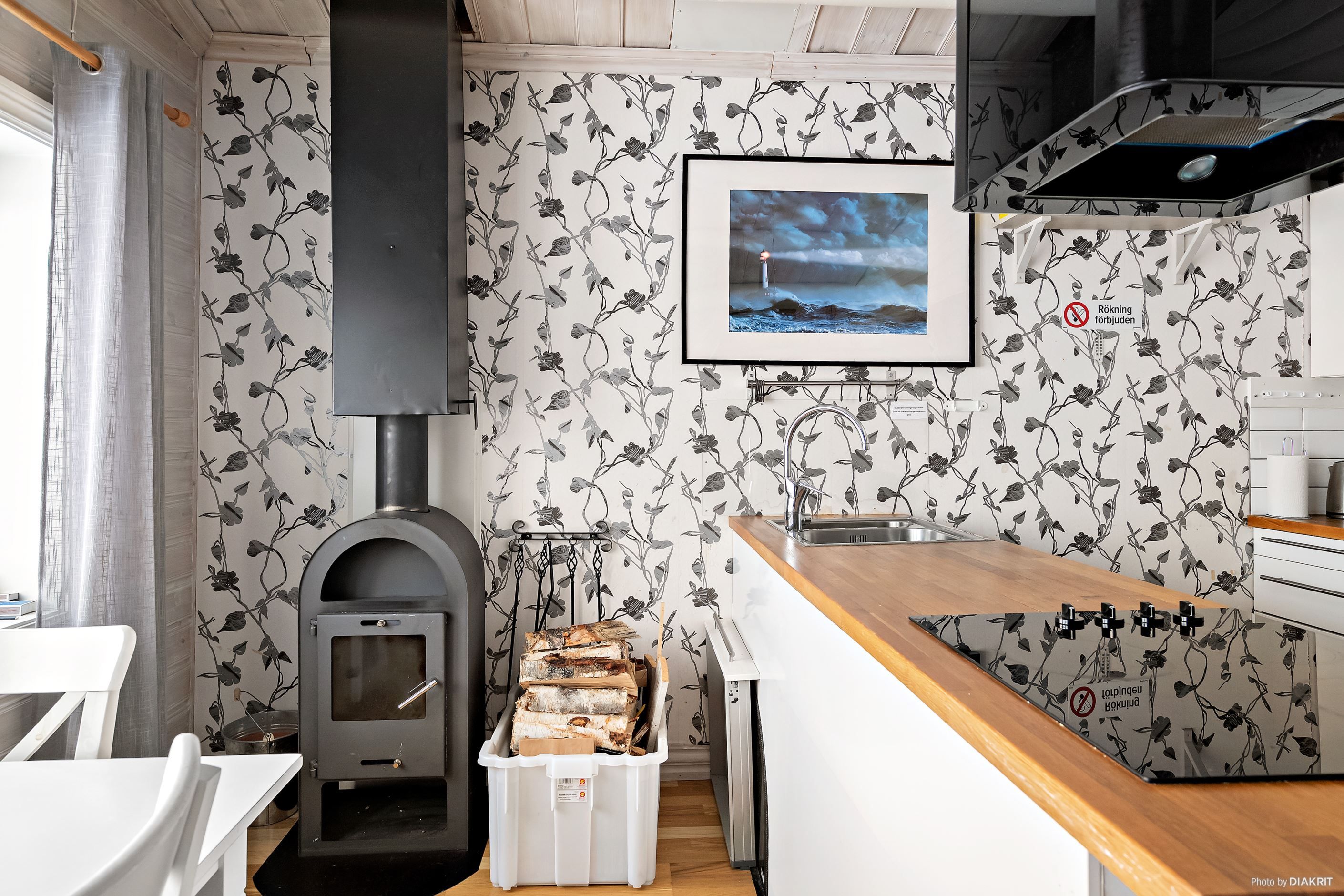 Köket är renoverat och funktionellt utformat med modern känsla. Köksö med diskmaskin ger extra arbetsyta och gör köket socialt – perfekt när flera vill hjälpas åt med matlagningen.