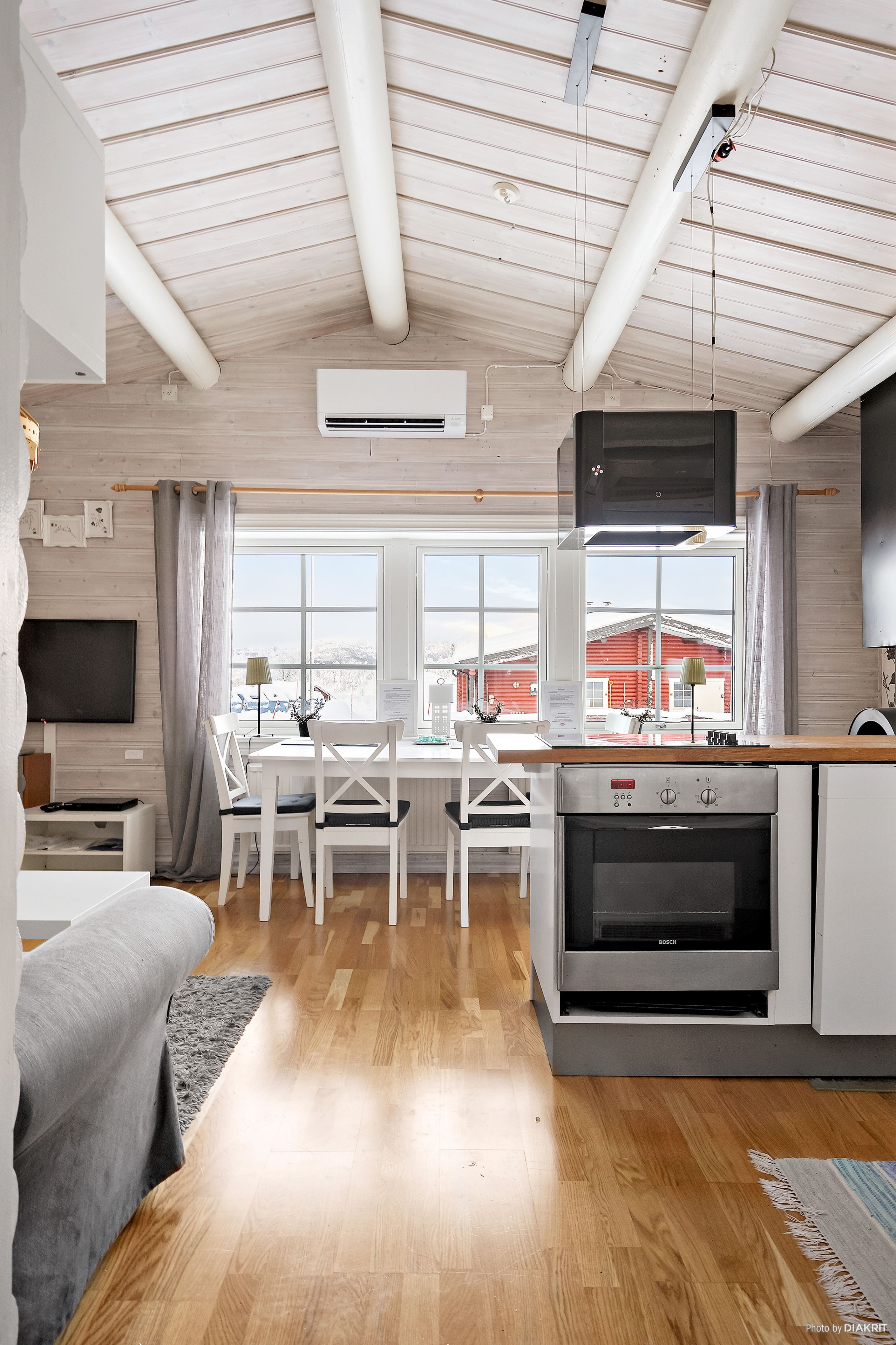 Redan när du kliver in möts du av ett inbjudande allrum med plats för både soffgrupp och matplats. Här finns en kamin placerad längs ena väggen som skapar både värme och stämning efter långa dagar ute på fjället. Allrummet har trägolv i ek och en planlösning som gör det enkelt att umgås.