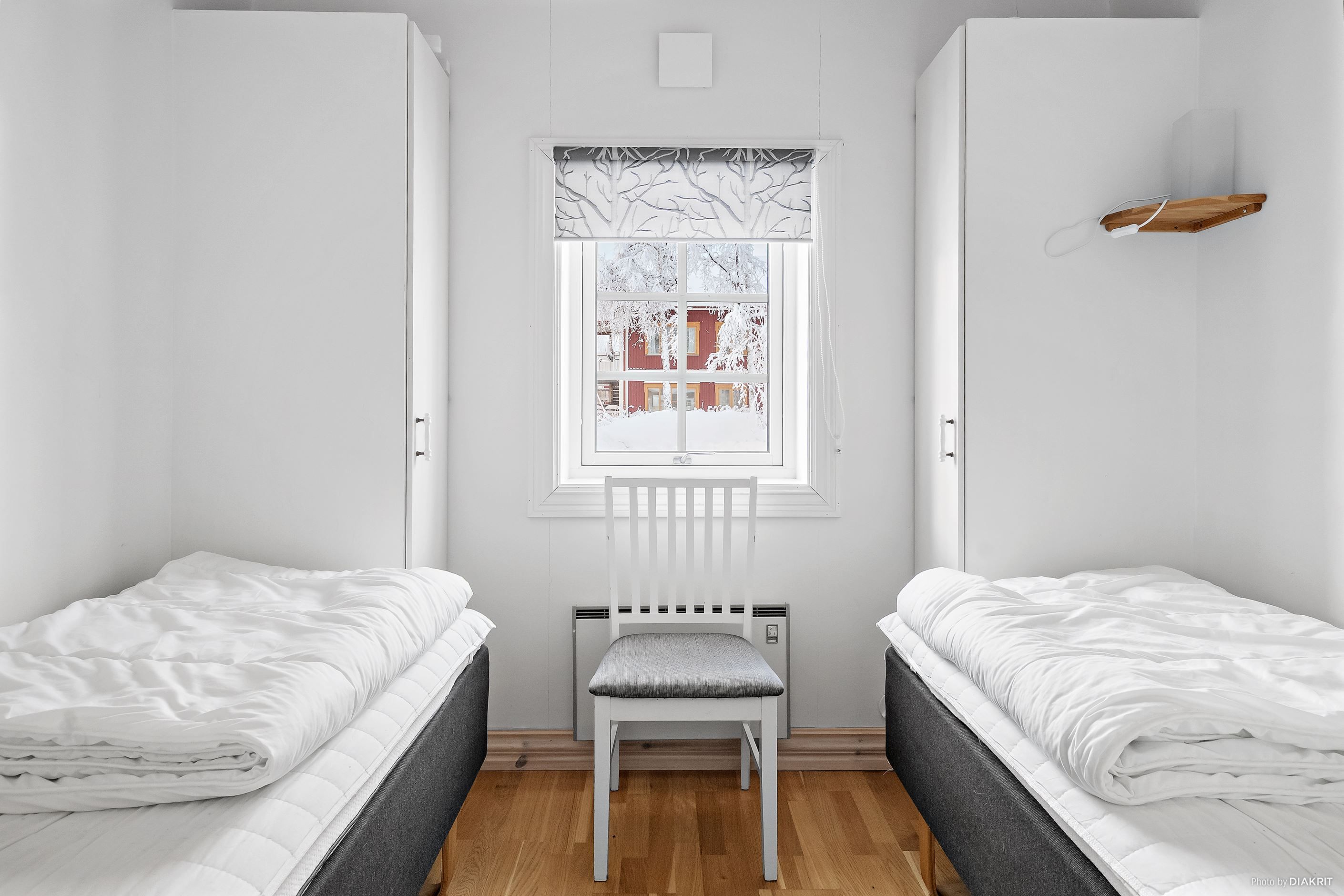 Stugan rymmer två sovrum med totalt fyra fasta sängar. Även sovrummen har trägolv i ek och en lugn, ombonad känsla.