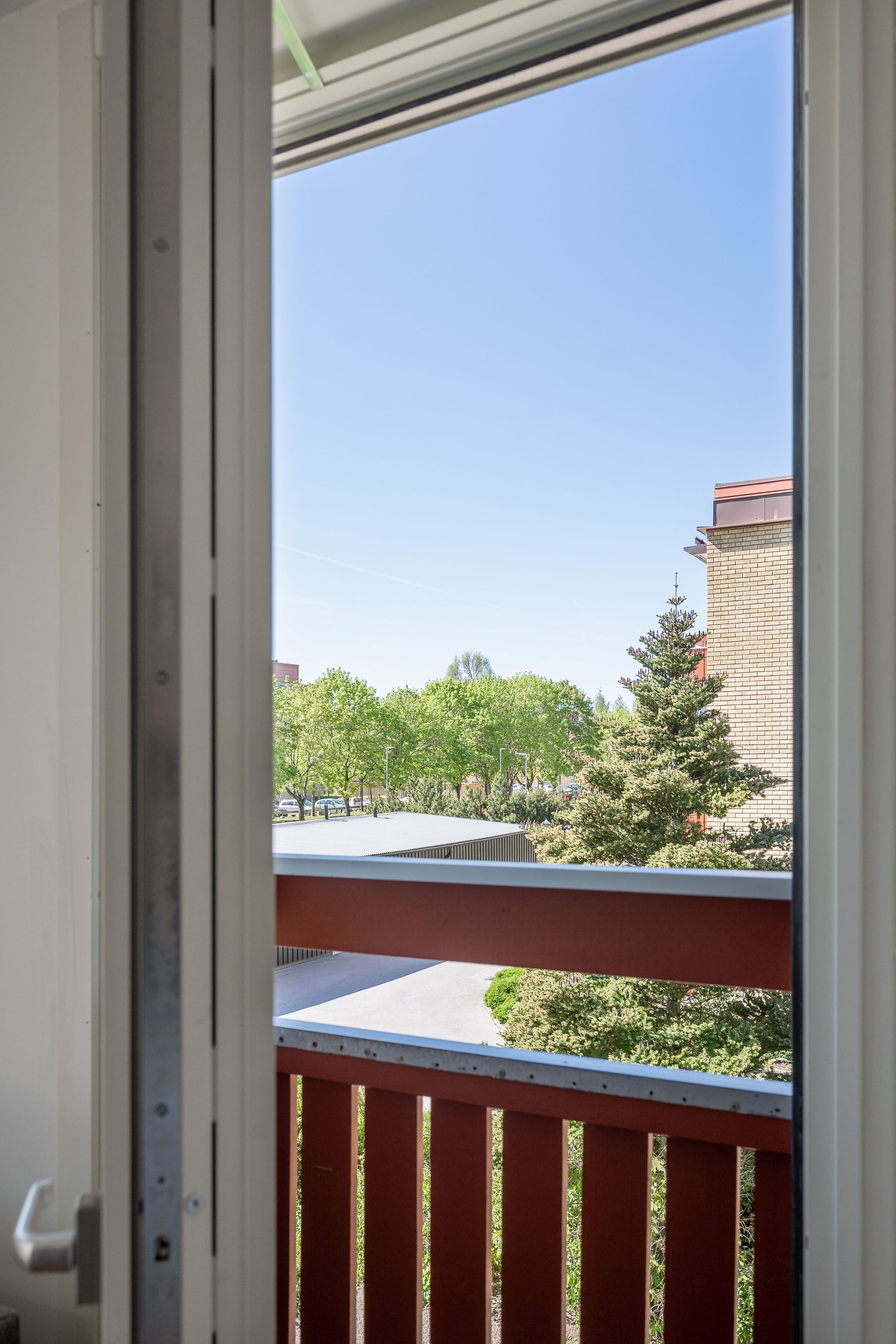 Välkommen till en solig balkong i söderläge – här kan du njuta av en grönskande utsikt och avkopplande stunder utomhus.
