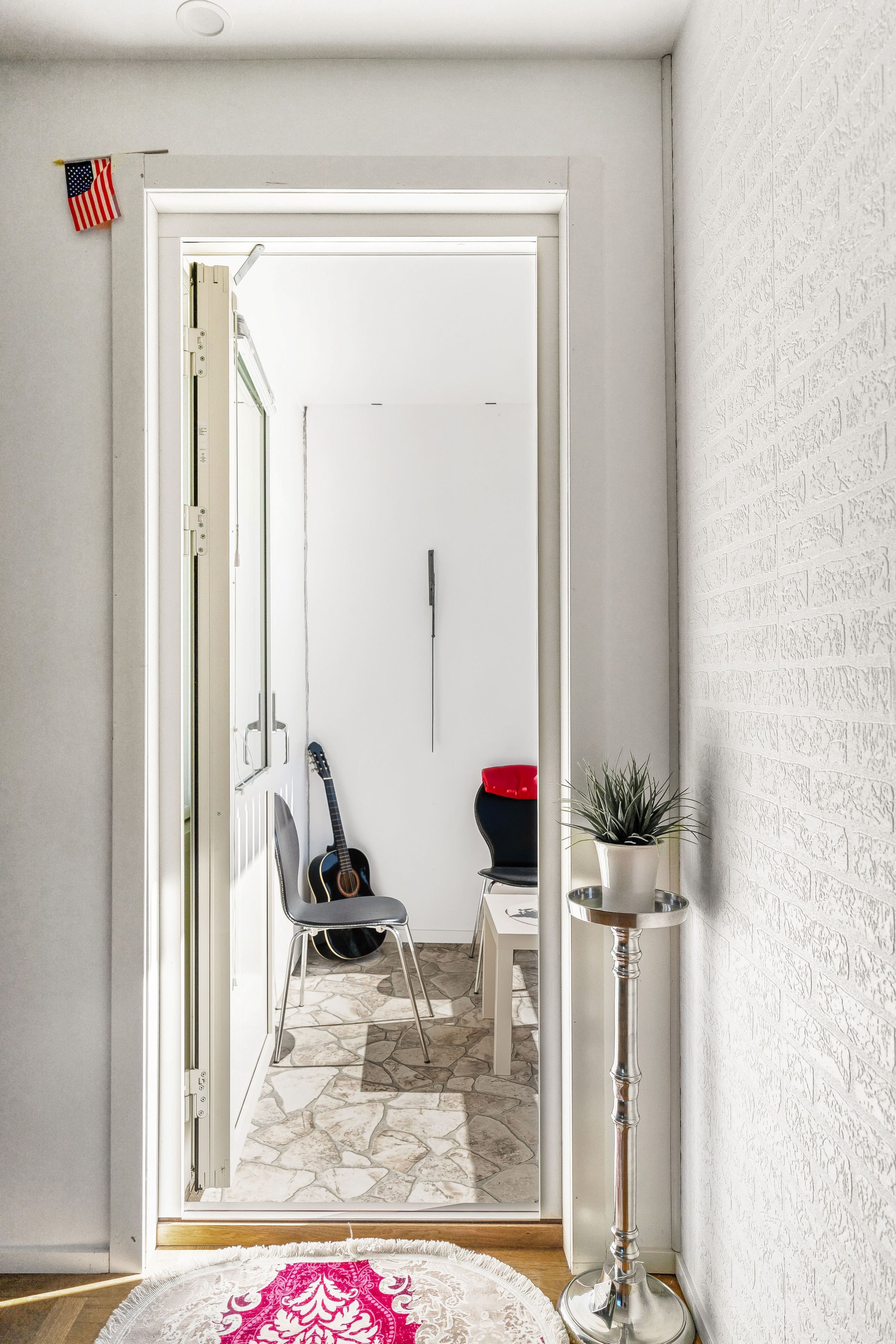 Det är en smart planerade tvåa på 60 kvm i en omtyckt, välskött, eftertraktad och stabil förening i lugnt expansionsområde på första våningen. Lägenheten har ett fördelaktigt hörnläge som ger ett fantastiskt ljusinsläpp, utmärkta förvaringslösningar och en mycket genomtänkt planlösning. Vardagsrummet är rymligt och ljust tack vare fönster i två väderstreck och utgångar till en nymålad balkong samt en dörröppning mot en fransk balkong. Spotlights är nyligen monterade i vardagsrummets tak. Sovrummet är rofyllt med vacker fondvägg. Badrummet är helkaklat och med badkar samt toppmatad tvättmaskin/torktumlare – finns en större tvättstuga i området. I hallen finns ytterligare förvaring i form av garderober. Genomgående vita putsade väggar kompletteras av fondväggar i vissa rum och ekfärgade golv som harmoniserar fint med den vackra parketten i vardagsrummet. Det tidlösa köket har vita skåpluckor och grått kakel, och intill köket finns en matplats med gott om utrymme för ett större matbord.