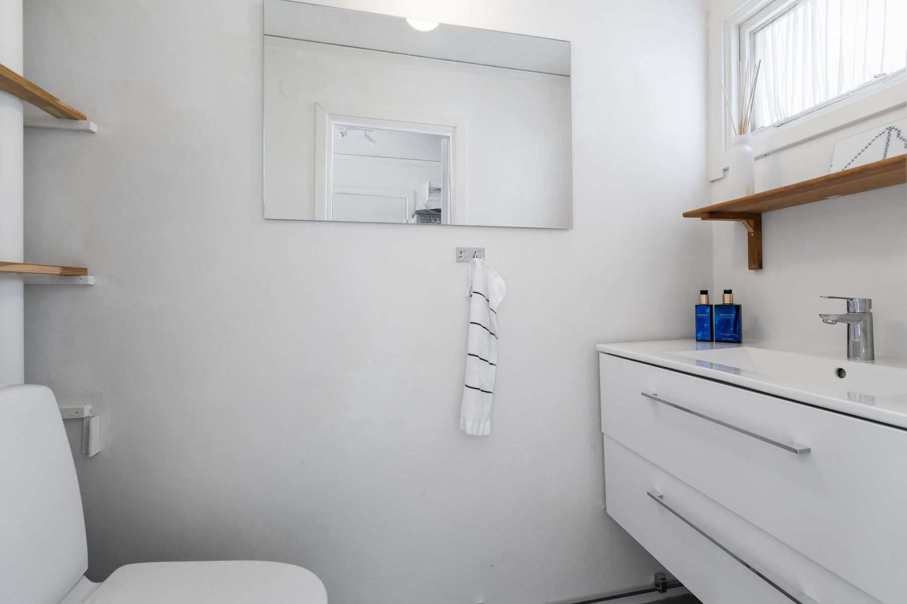 Väl innanför ytterdörren på huvudbyggnaden välkomnas man av hall med plats för avhängning. Direkt till höger finns gästtoalett utrustad med kommod, wc och golvvärme.