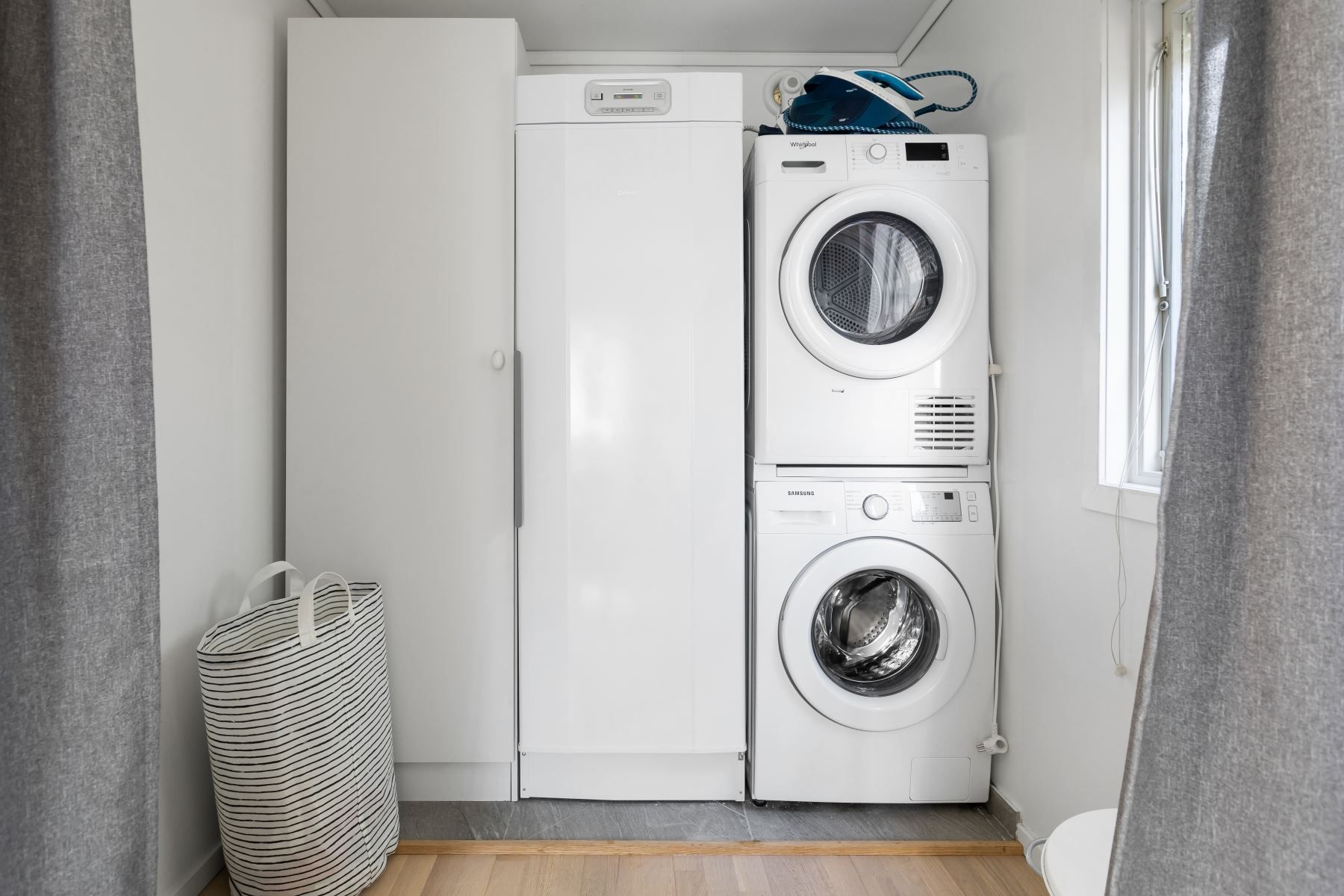 Vardagsrum med plats för soffgrupp. Här finns tre garderober som ger bra förvaring. Grovkök utrustat med tvättmaskin, torktumlare, torkskåp samt garderob. Här finns möjlighet att installera kök – om så önskas.