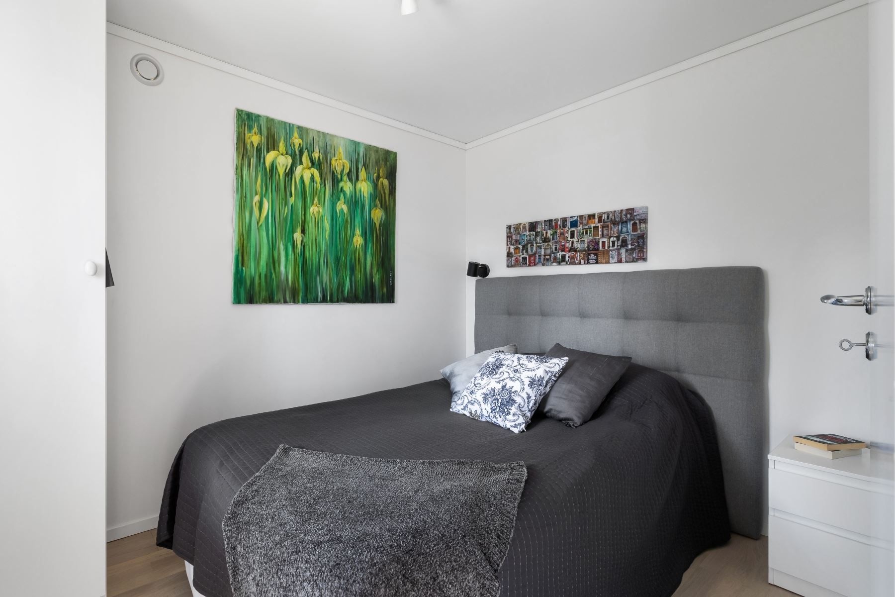 Från matrummet finns ingång till ett av husets två sovrum. Här finns plats för säng och övrig möblering. Platsbyggda garderober ger gott om förvaring.