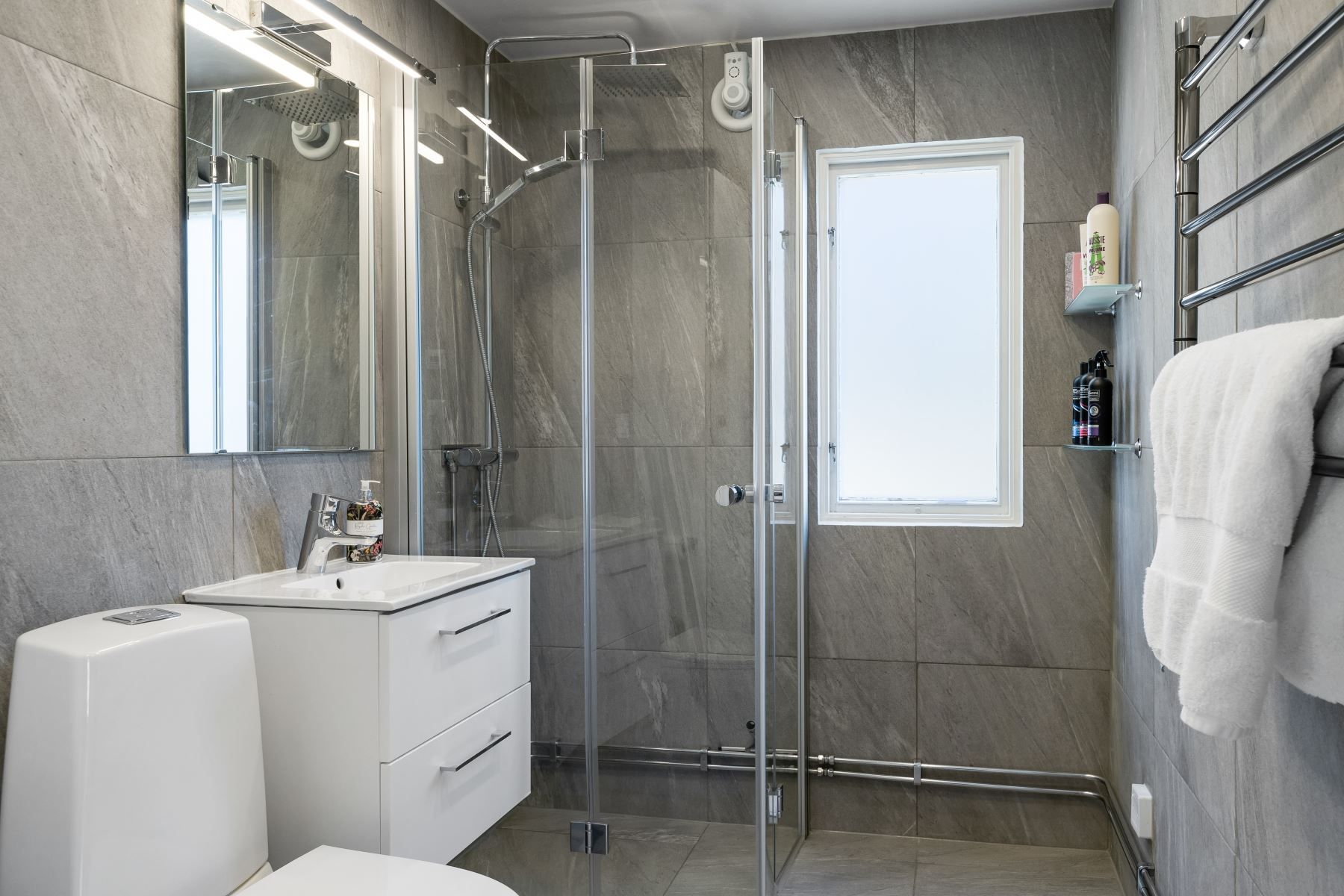 Rakt fram från entrén finns det stilrena helkaklade badrummet utrusta med spegelskåp med belysning, handfat med kommod, wc, handukstork, golvvärme samt duschhörna med vikbara duschväggar. Tak- och handdusch.