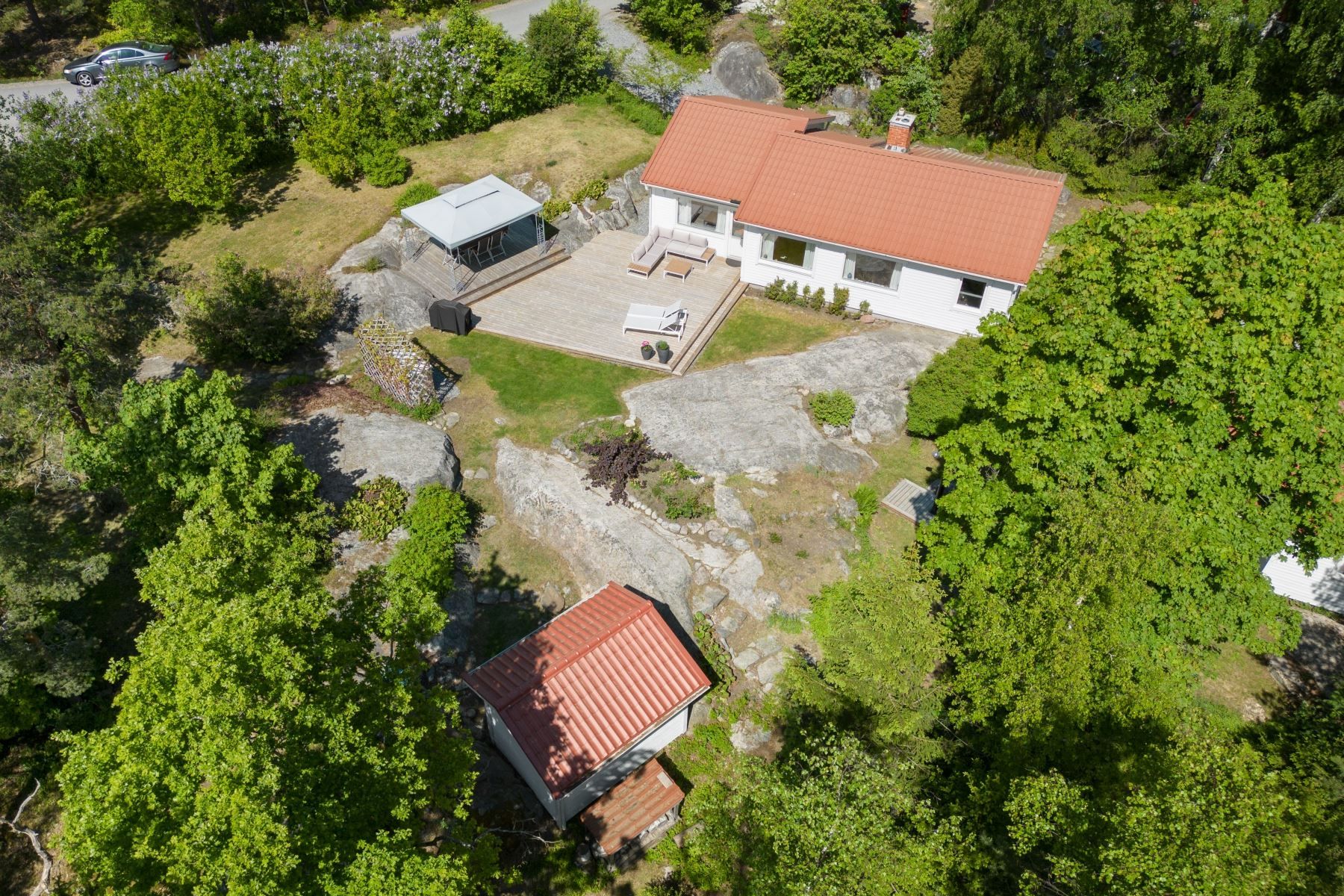 Tomten, som är om 2 219 kvm, är högt belägen och så gott som fri från insyn. Tomten har en härlig karaktär som bjuder på berg i dagen, gräsmatta, naturtomt, gott om växtlighet och stor trädäckad terrass i direkt söderläge. Den här fastigheten är ingenting för den ljusskygge. På fastigheten finns gott om parkeringsplatser samt en isolerad friggebod om ca 10 kvm, perfekt för förvaring av trädgårdsredskap och övriga prylar.