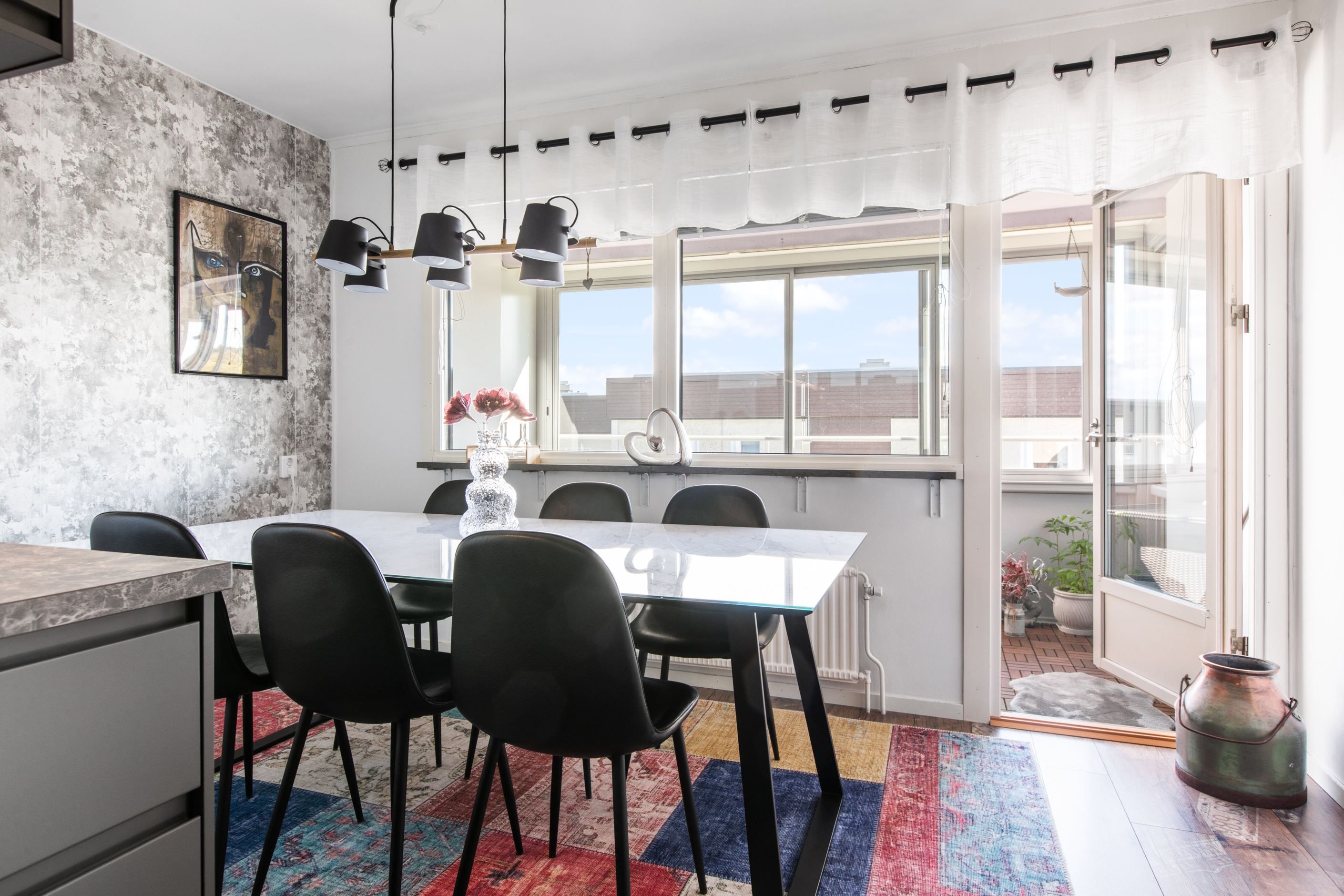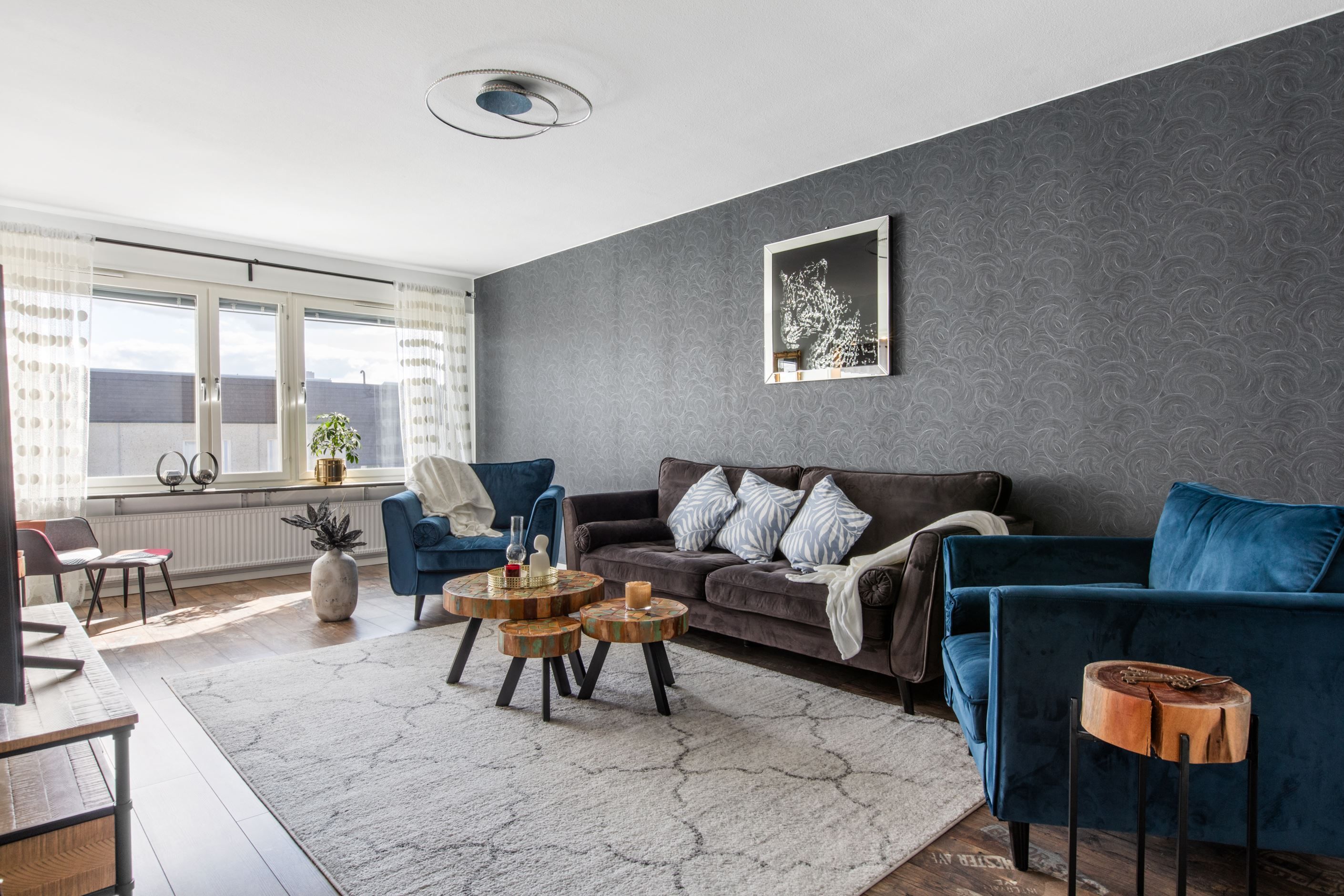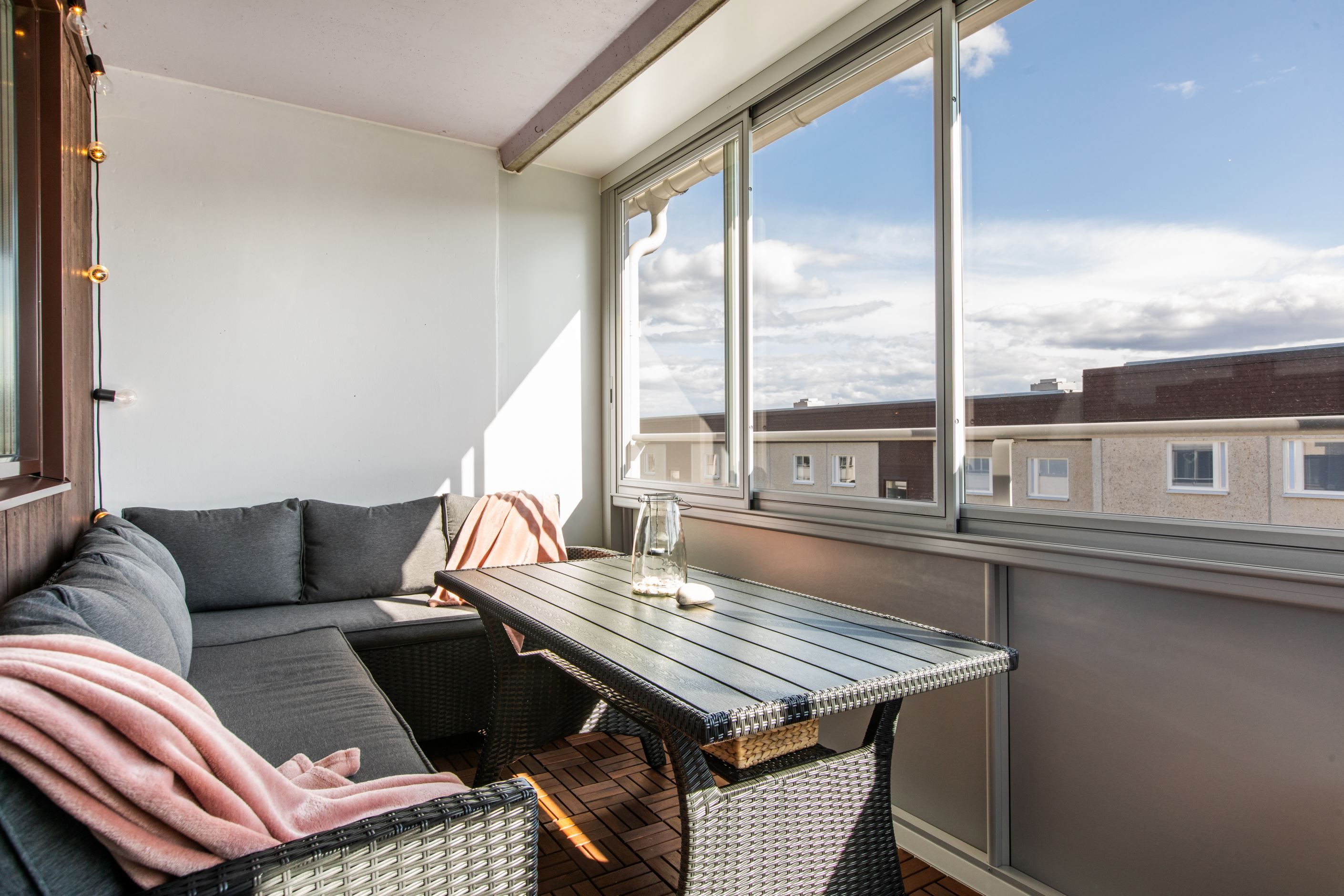 Planlösningen är genomtänkt och skapar en behaglig helhet. Det rymliga vardagsrummet har gott om plats för både soffa och matsalsmöbel, och de stora fönstren låter ljuset flöda genom rummet. Från vardagsrummet nås den insynsskyddade balkongen – en härlig plats för morgonkaffet eller en lugn stund i kvällssolen.