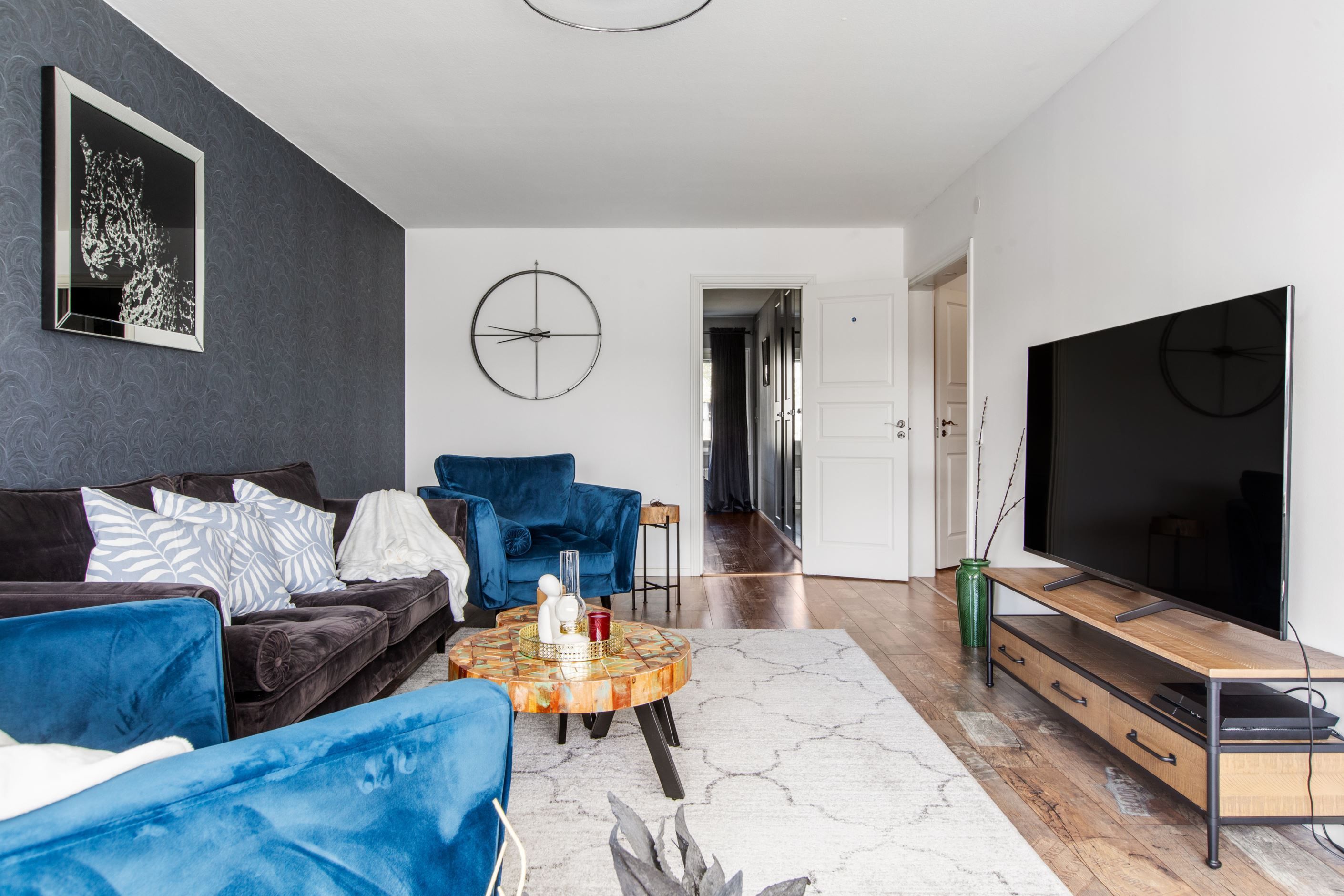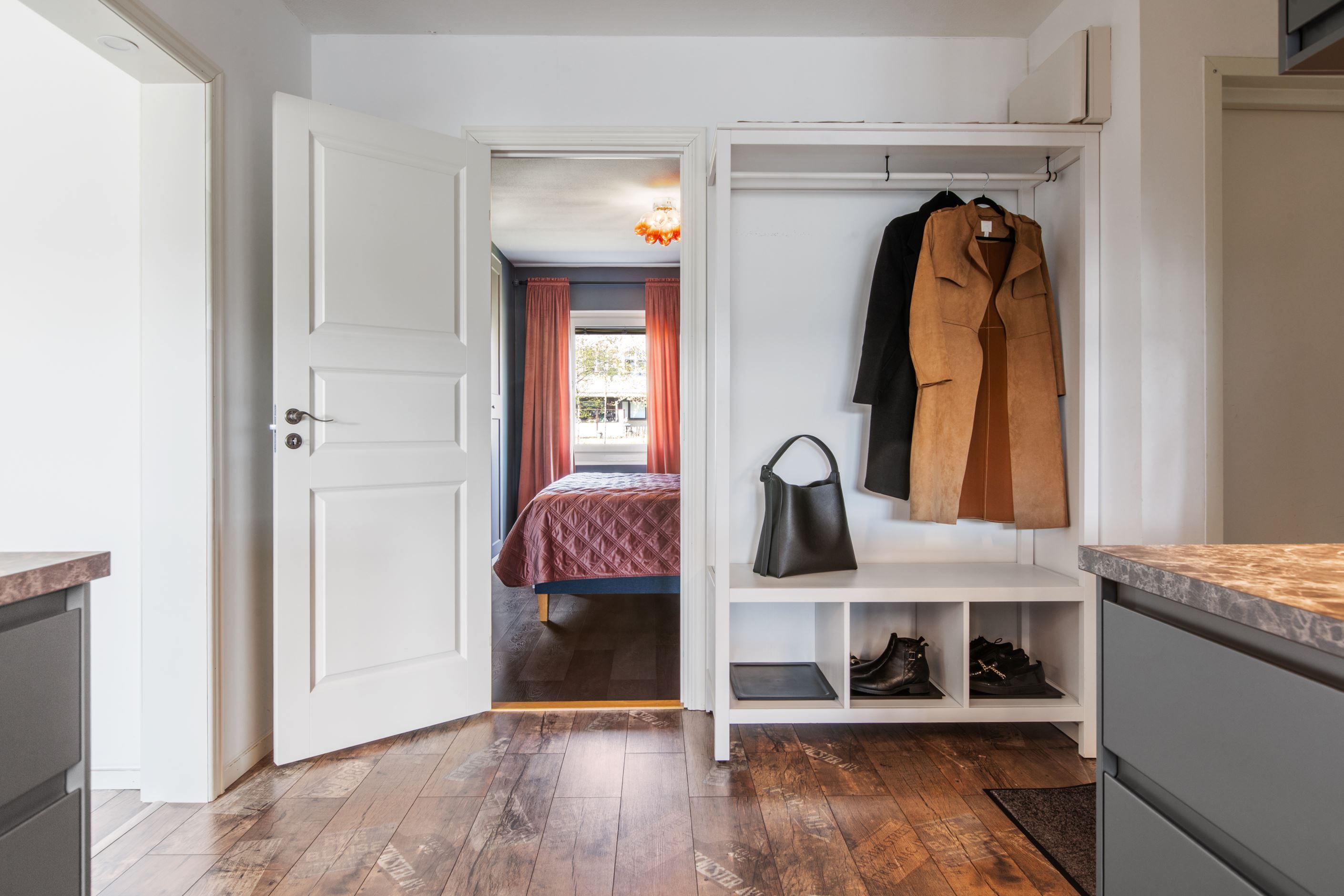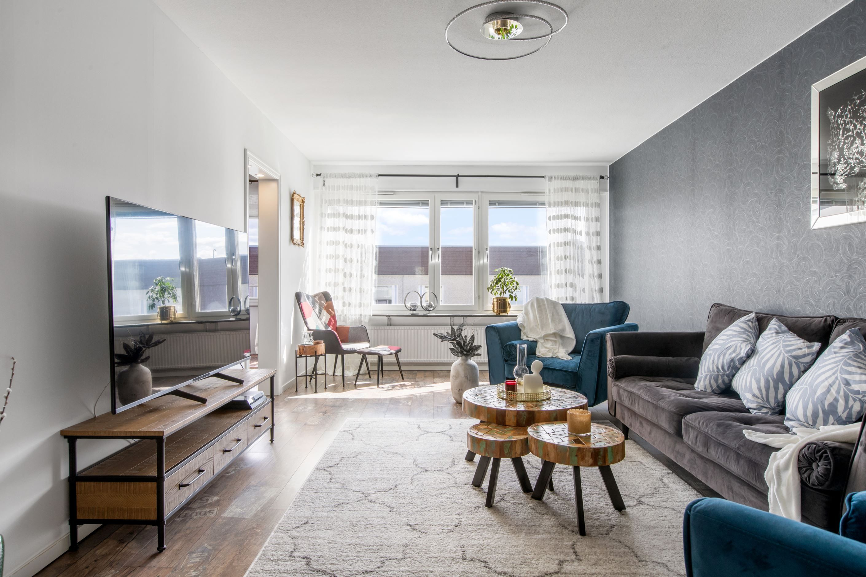 Planlösningen är genomtänkt och skapar en behaglig helhet. Det rymliga vardagsrummet har gott om plats för både soffa och matsalsmöbel, och de stora fönstren låter ljuset flöda genom rummet. Från vardagsrummet nås den insynsskyddade balkongen – en härlig plats för morgonkaffet eller en lugn stund i kvällssolen.