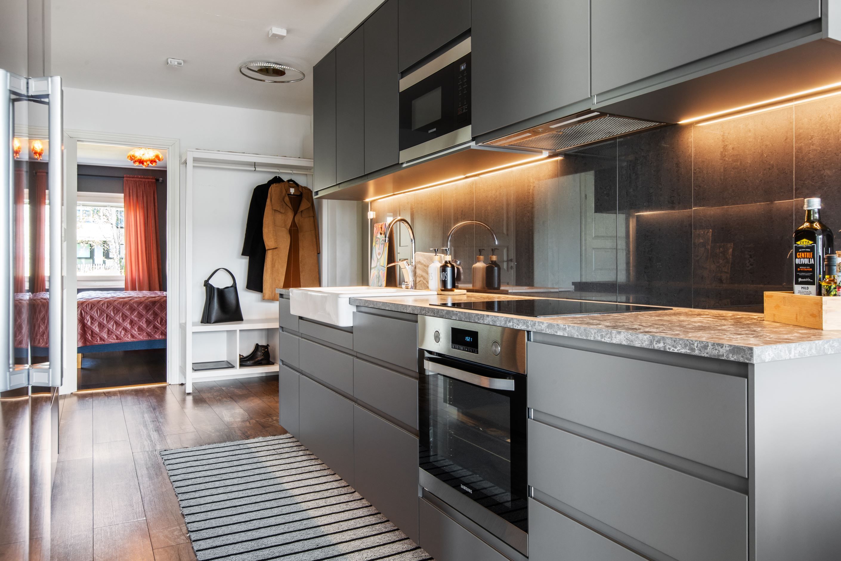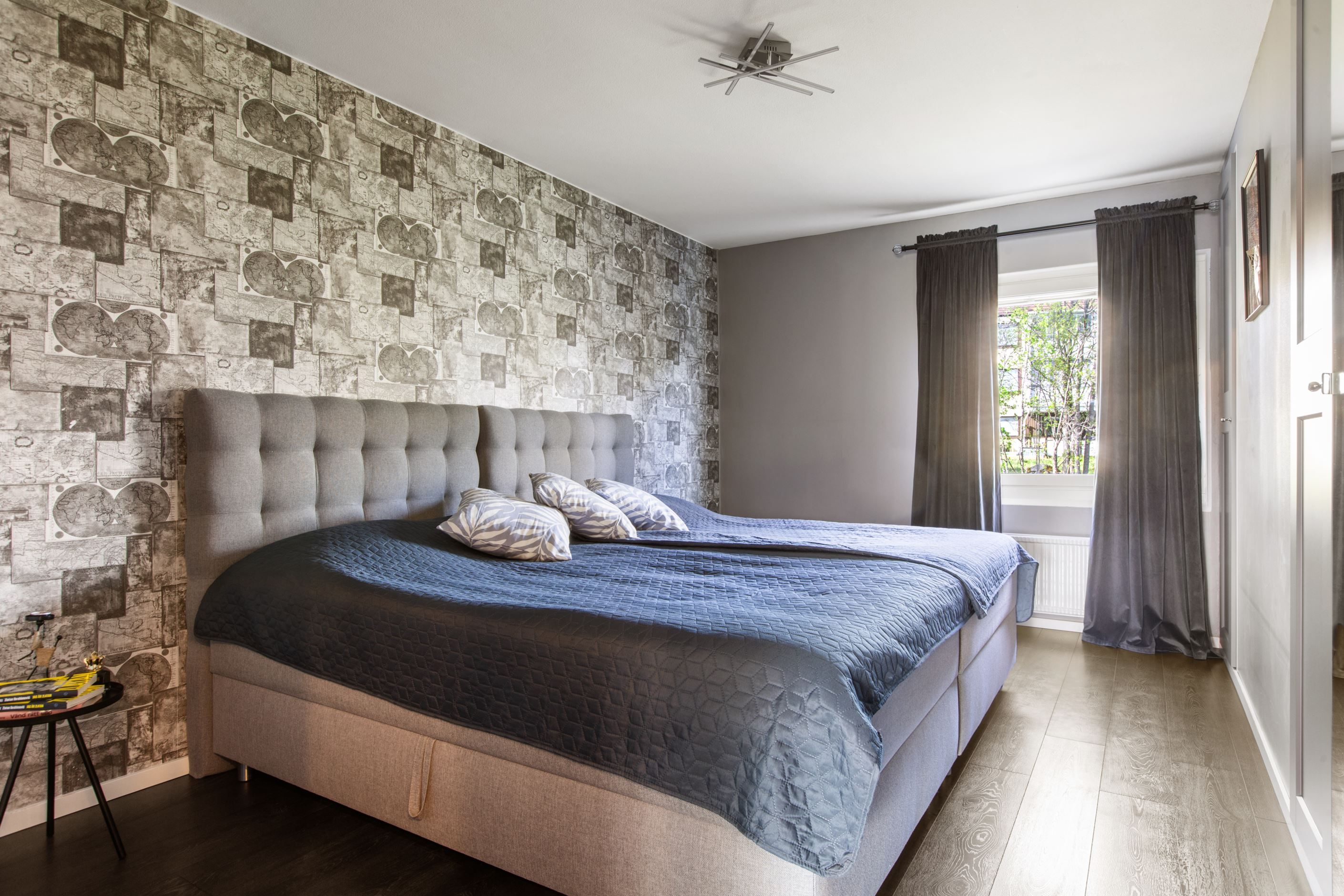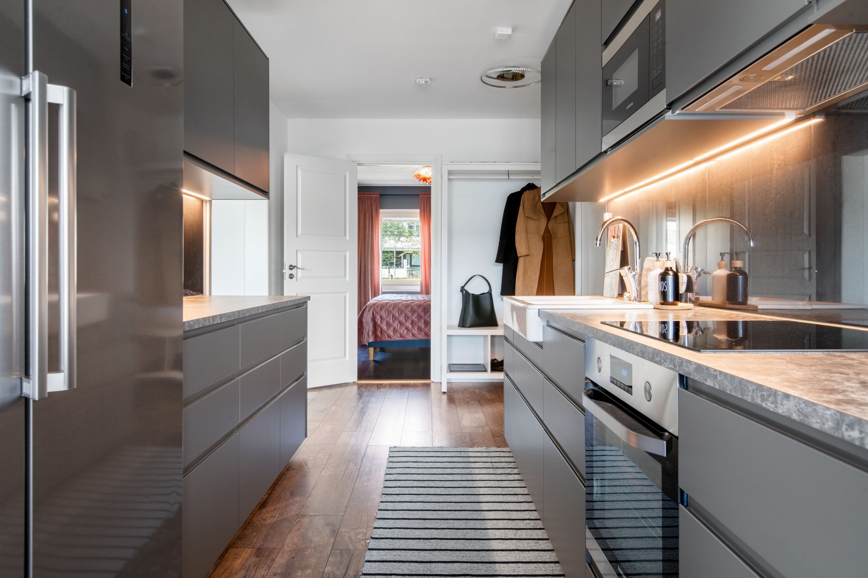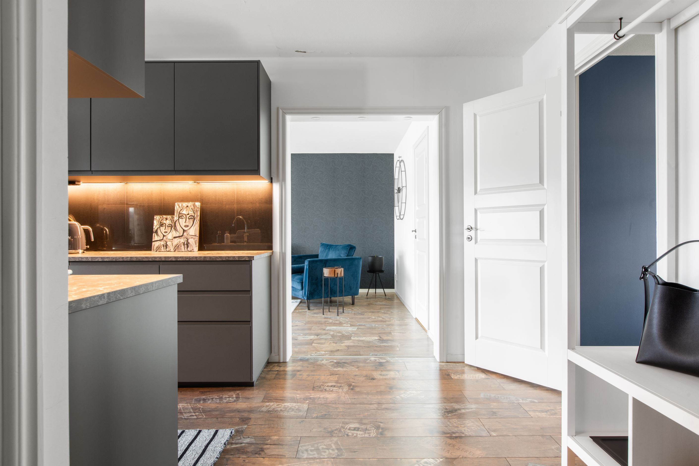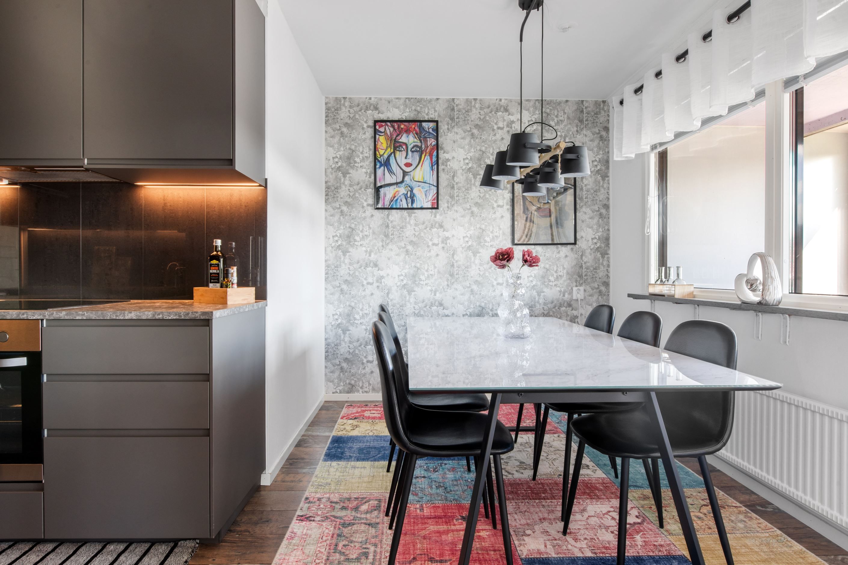 Köket är stilrent och välutrustat, med smakfulla materialval och goda arbetsytor. De två sovrummen erbjuder generöst med plats och förvaring, och badrummet är snyggt renoverat med moderna ytskikt. Genomgående ljusa material och väl valda detaljer ger bostaden en inbjudande och harmonisk känsla.