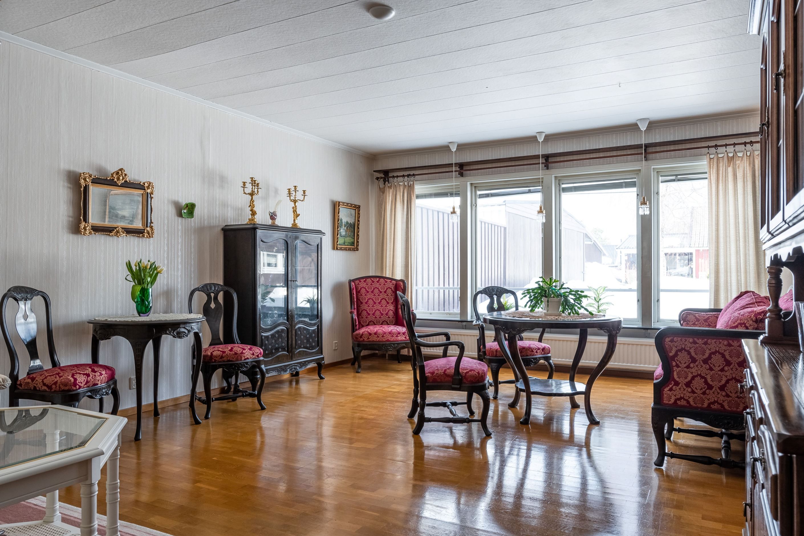 Här erbjuds en trivsamt bostad med fantastisk potential. Huset bjuder på en rymlig hall, ett vardagsrum som skapar möjlighet till kreativ möblering och en påtaglig social atmosfär. Två stora sovrum som med egen utgång till husets östra sida och ett allrum som skapar utrymme att upprätta ytterligare två separata sovrum. Här erbjuds både toalett och duschrum samt egen tvättstuga. Kök i social samklang med matplatsen som vidare erbjuder fantastiska förvaringsmöjligheter. Uteplats under tak och en fristående garagebyggnad med förrådsdel.