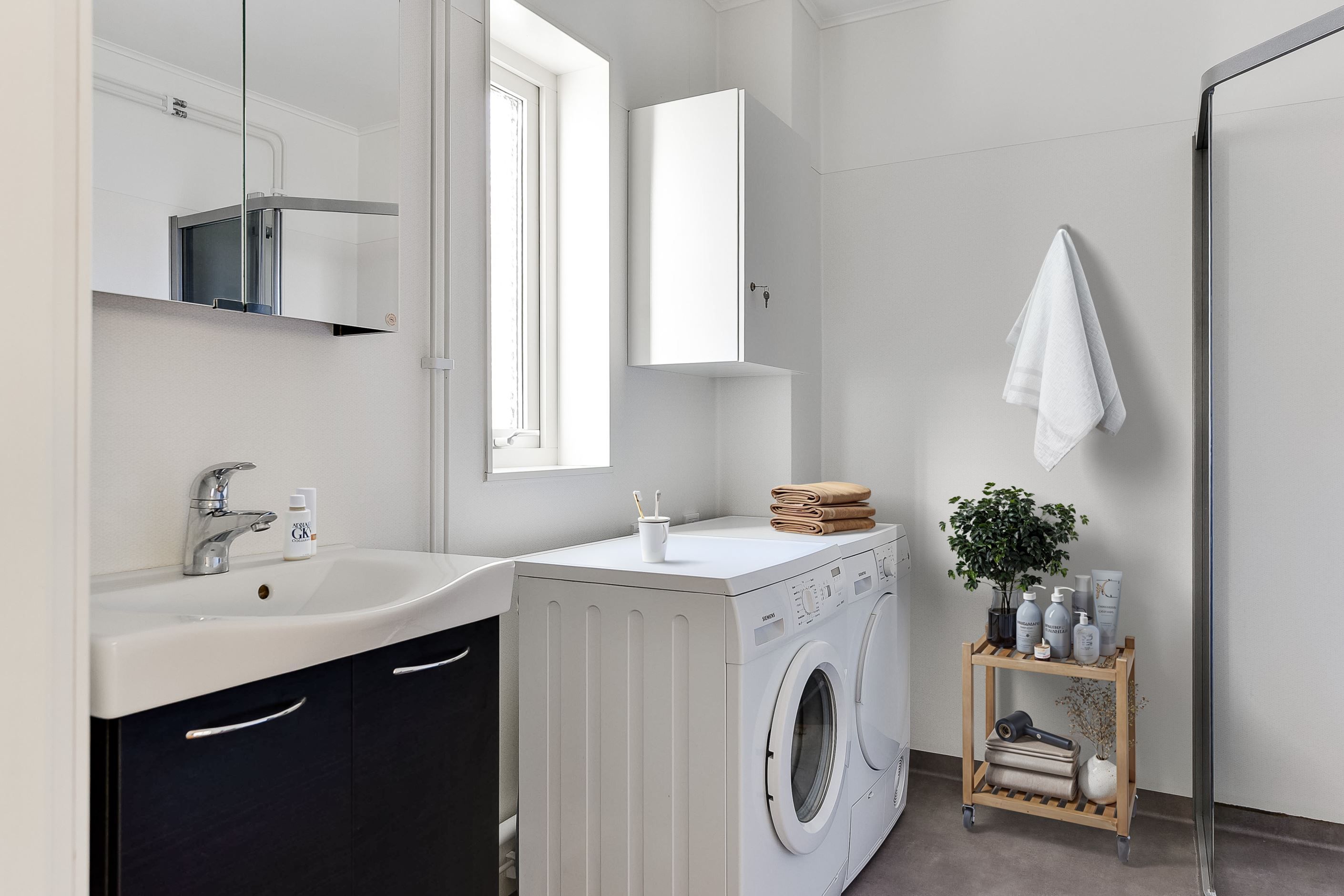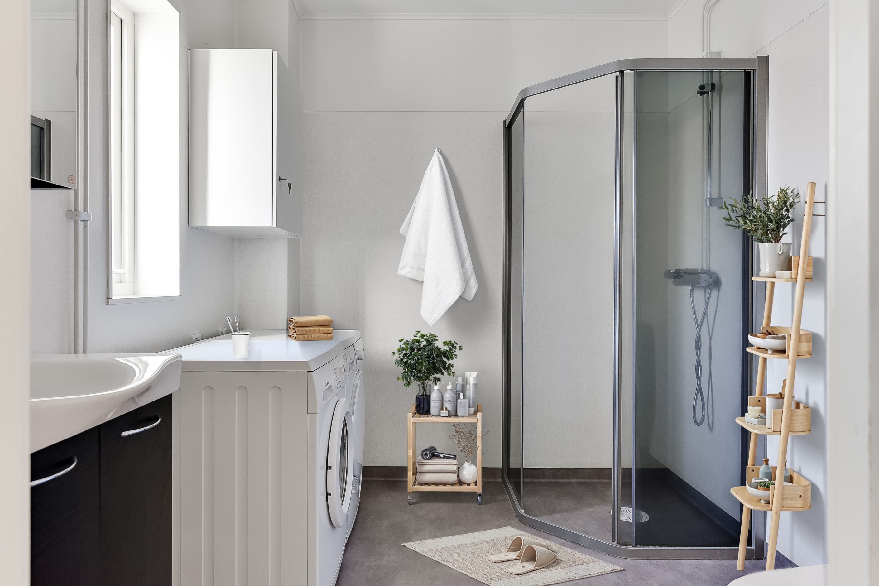 Det fräscha badrummet är både praktiskt och stilrent med ljusa väggar, mörk våtrumsmatta på golvet, dusch med vikväggar, wc, kommod med förvaring och dessutom både tvättmaskin och torktumlare – en bekvämlighet som gör vardagen lite enklare.