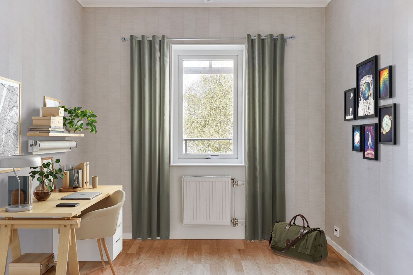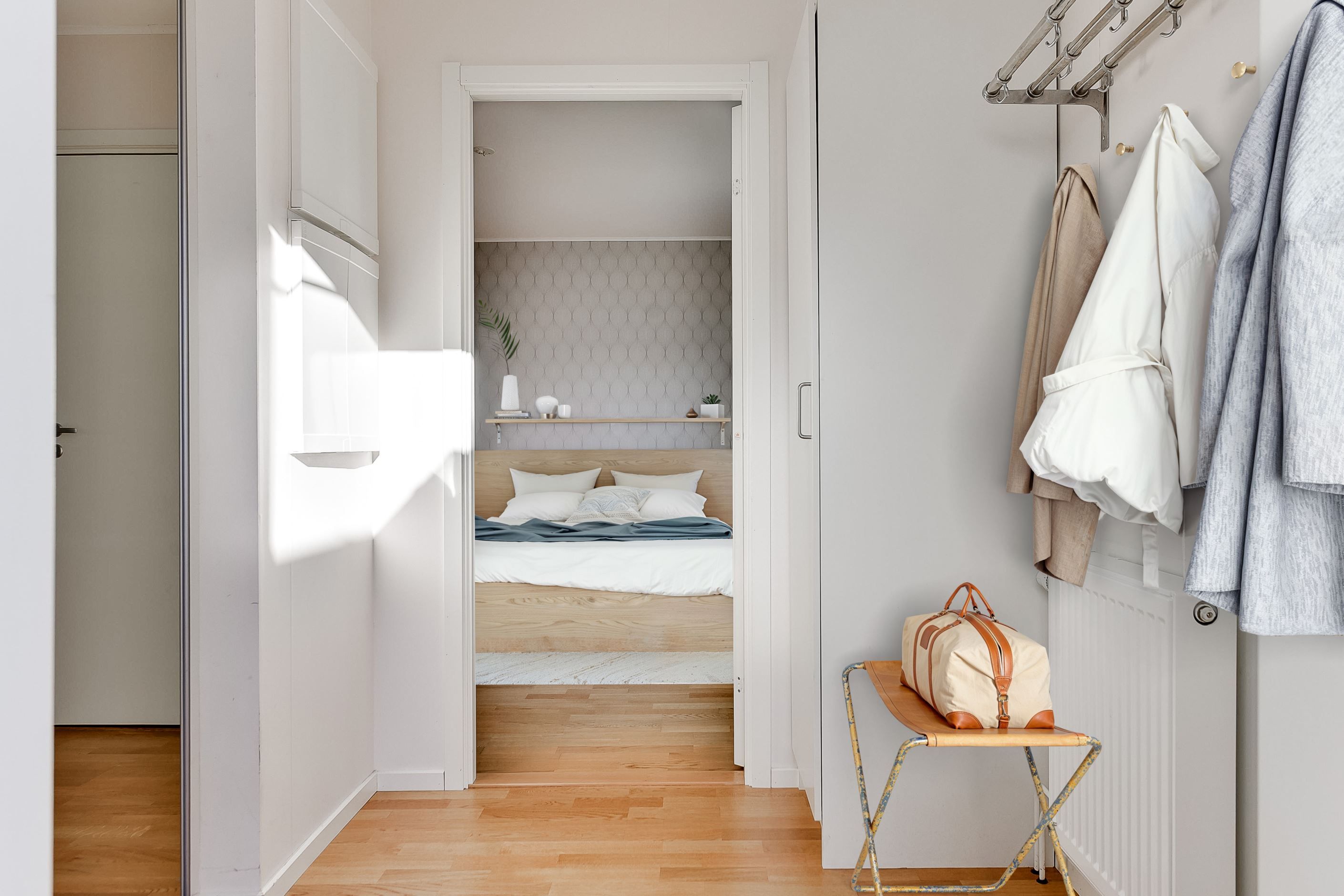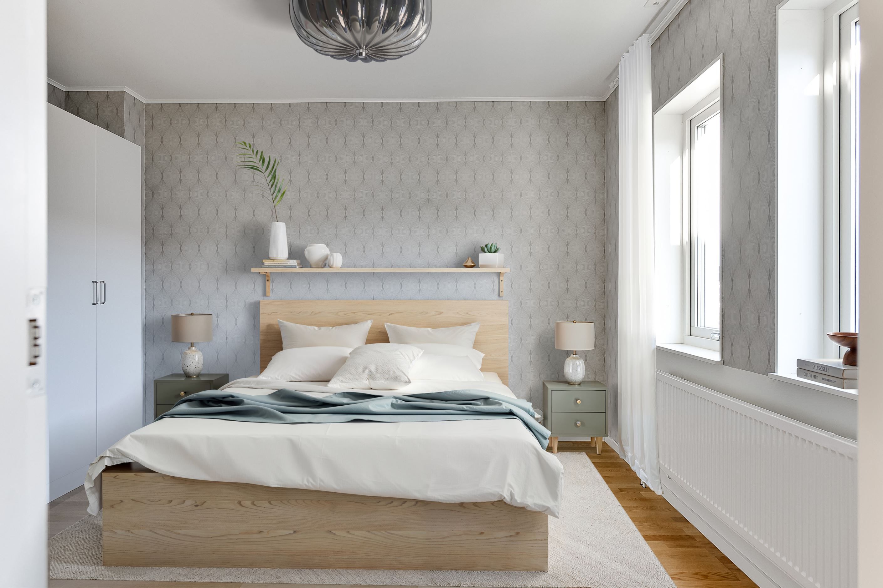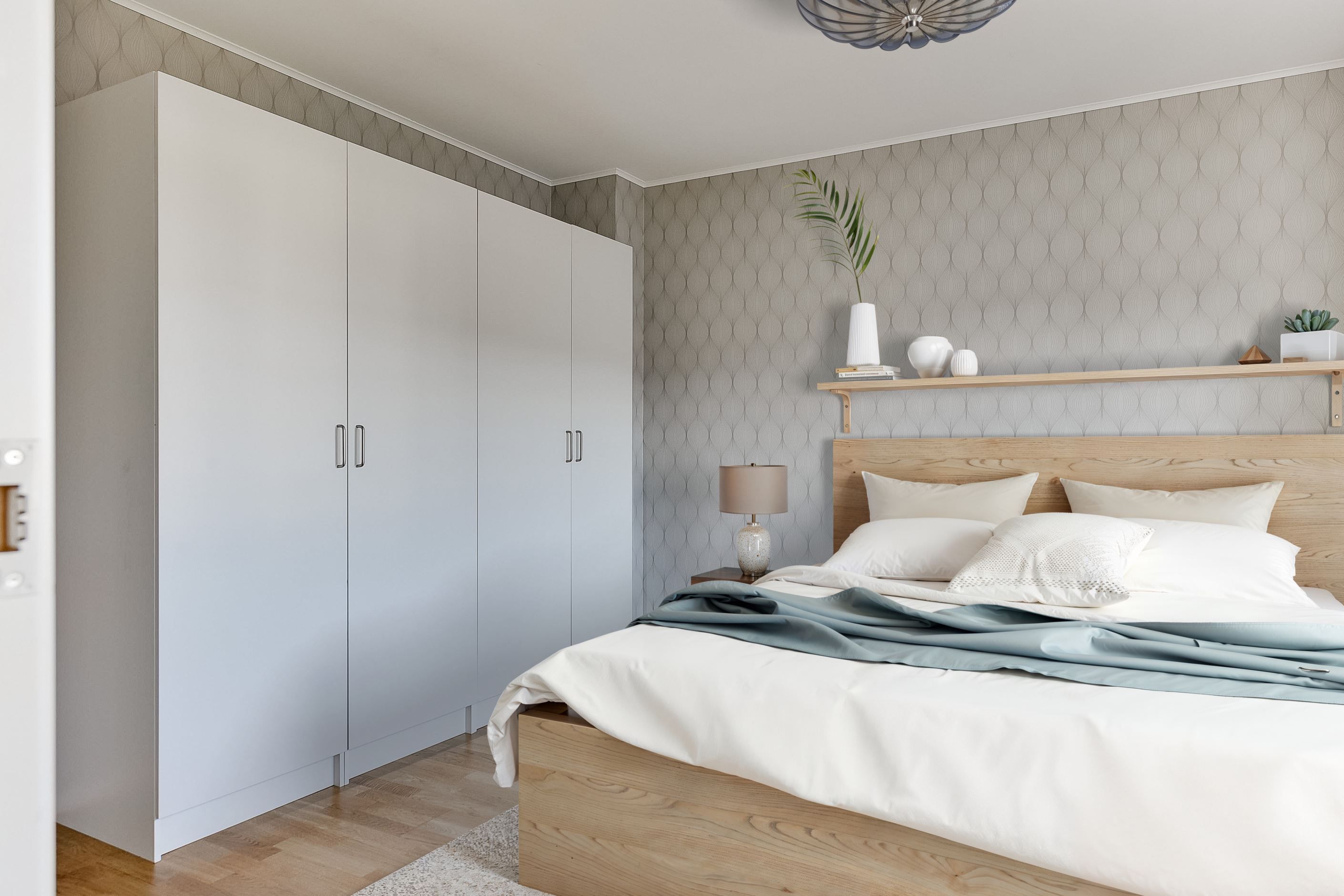 Lägenheten erbjuder två sovrum där det större rummet rymmer dubbelsäng och ytterligare möblemang, medan det mindre sovrummet passar utmärkt som gästrum, barnrum eller hemmakontor. Båda rummen präglas av ljusa ytskikt och samma enhetliga parkettgolv som löper genom hela bostaden.