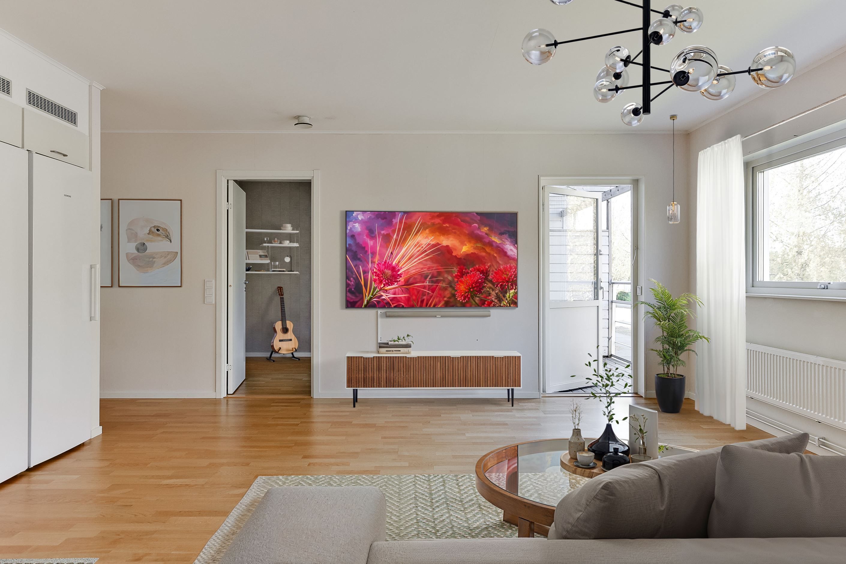 Hallen välkomnar er med praktiska avhängningsmöjligheter och en stor skjutdörrsgarderob med spegelglas som både förhöjer rymden och ger gott om förvaring. Härifrån nås bostadens hjärta – det ljusa vardagsrummet i öppen planlösning med köket. De stora fönsterpartierna släpper in rikligt med dagsljus och skapar en luftig känsla, perfekt för både vardag och umgänge. Köket erbjuder fina arbetsytor och plats för matgrupp, och i direkt anslutning finns vardagsrumsdelen med utgång till den soliga balkongen i sydvästläge. Här njuter ni av sol hela dagen, helt utan insyn och med en trivsam vy över omgivningarna – en självklar favoritplats under sommarhalvåret.