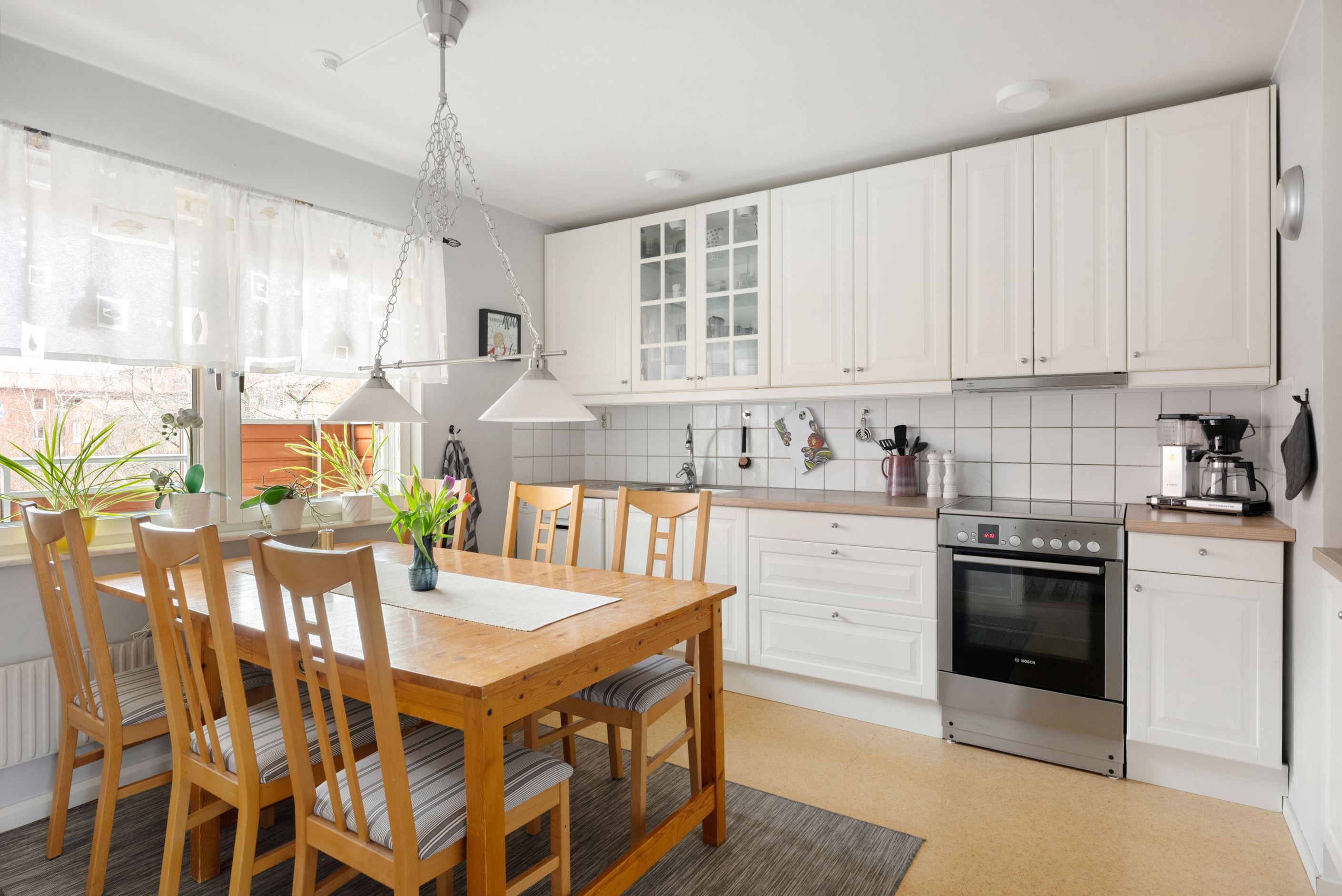 Till vänster om hallen finner du köket som går i stilrena toner och är fullt utrustat med goda arbetsytor. Här finns även plats för matbord för 6–8 personer med utsikt mot innegården. Vidare in i lägenheten ligger det lättmöblerade vardagsrummet med ett stort fönsterparti som ger ett härligt ljusinsläpp. Här erbjuds det gott om plats för både soffgrupp, mediamöbel och övrigt möblemang efter behov. Bostadens badrum går i ljusa toner och är utrustat med badkar.