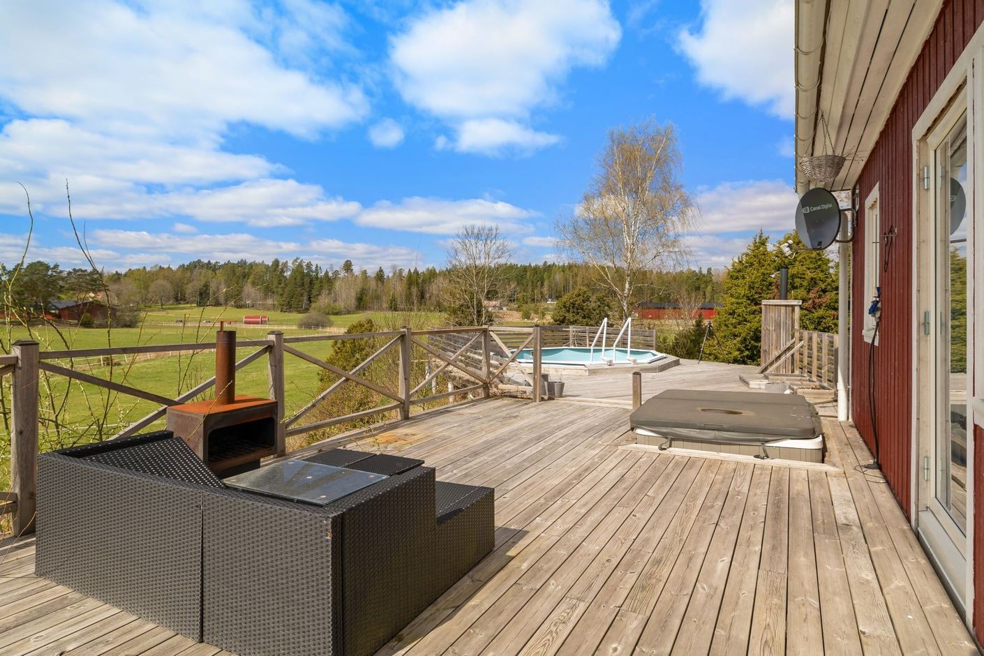Den generösa trädäckade altanen, med sin inbjudande pool, blir en naturlig samlingspunkt för både avkoppling och sociala stunder. Från altanen kan du njuta av en rogivande utsikt som sträcker sig över det vackra landskapet.