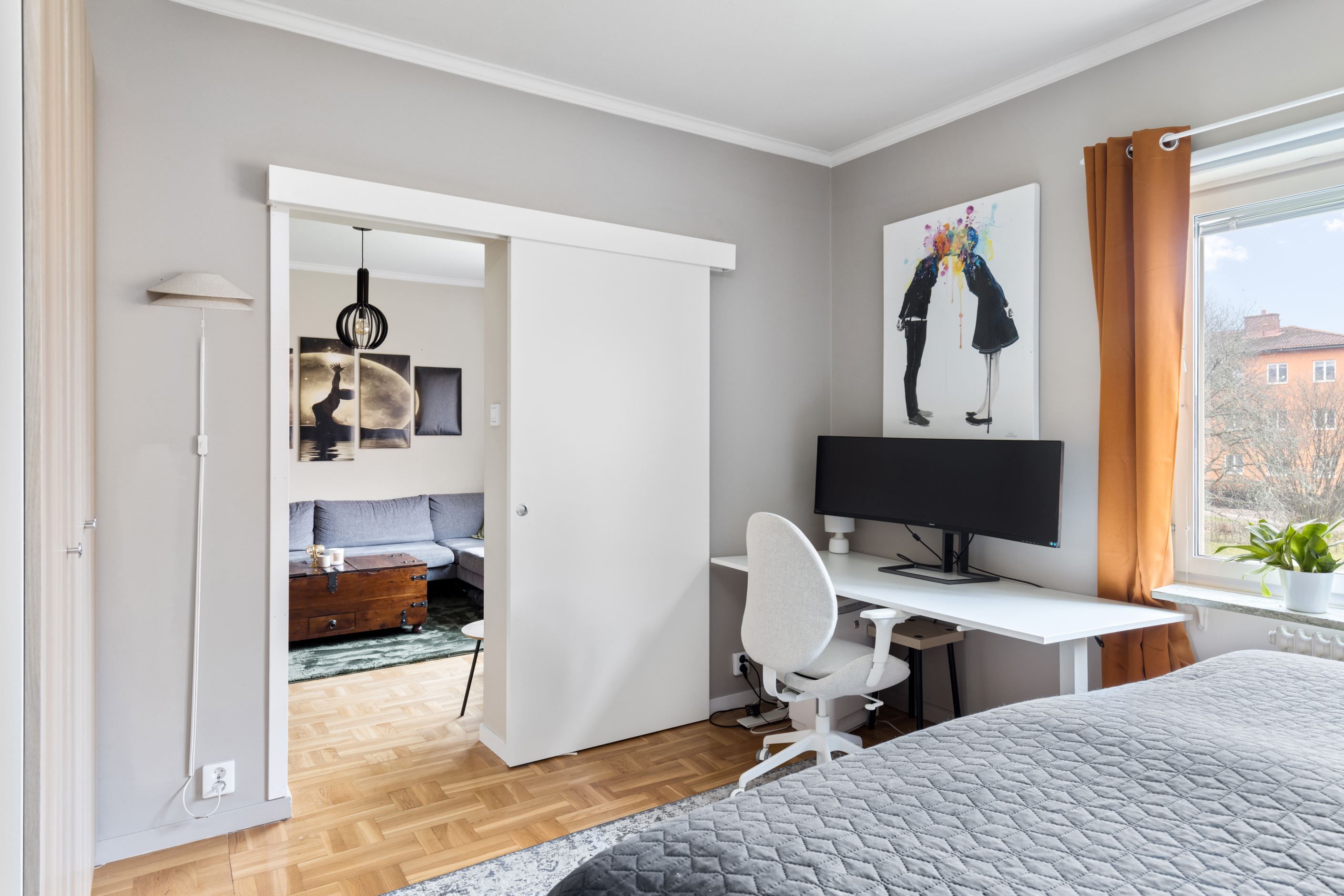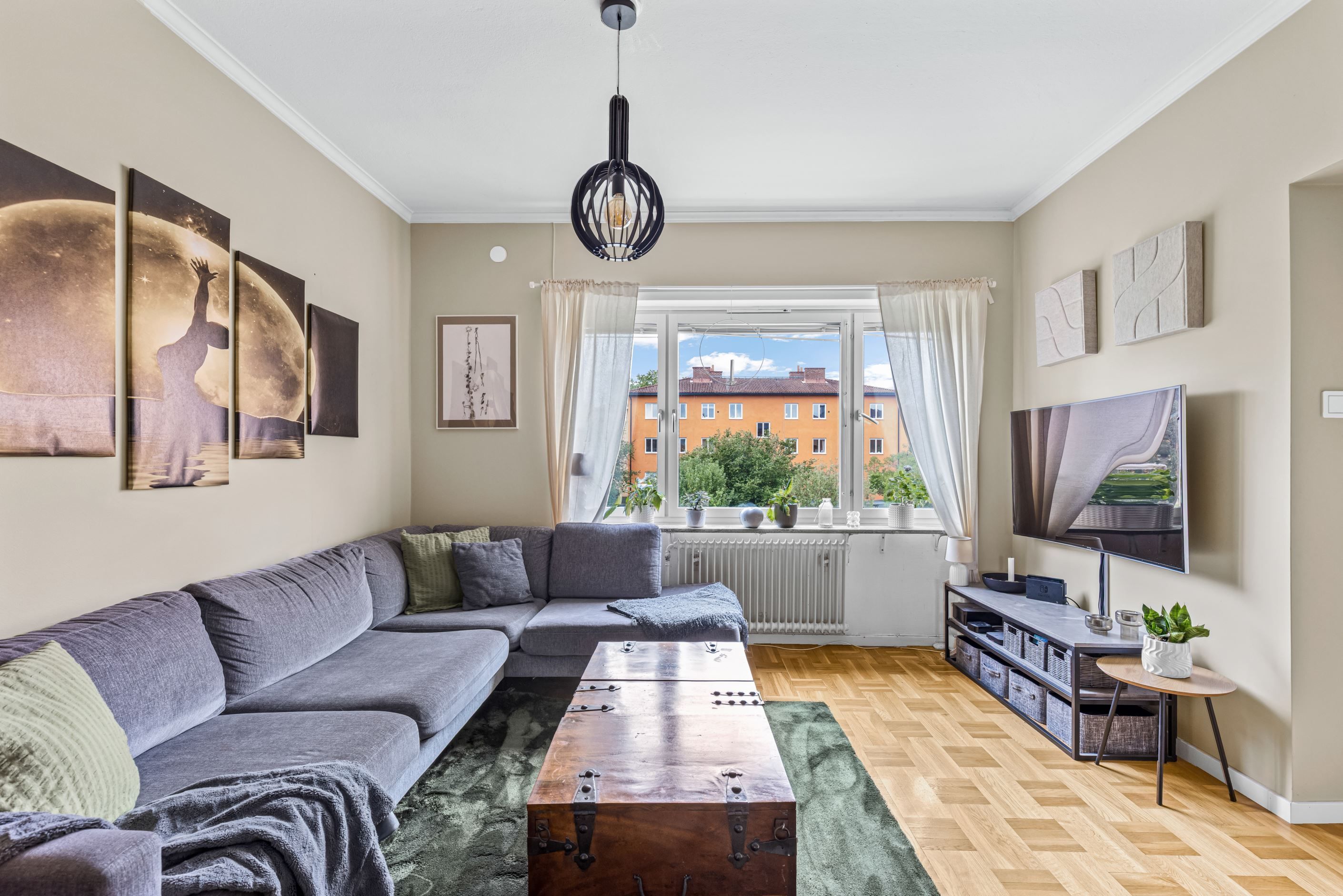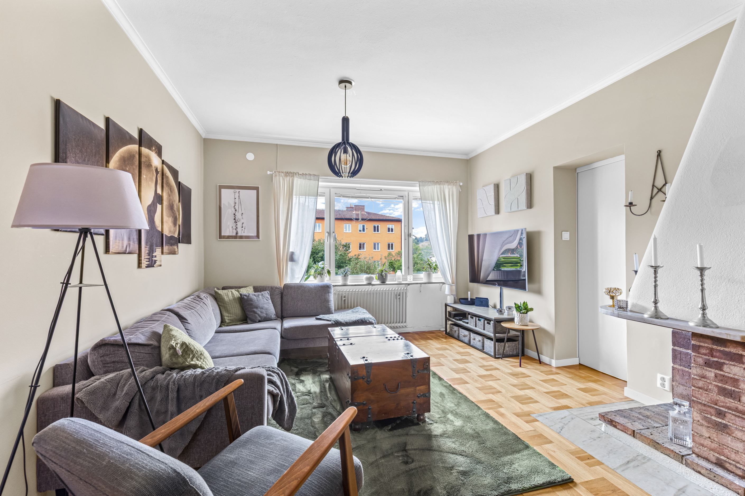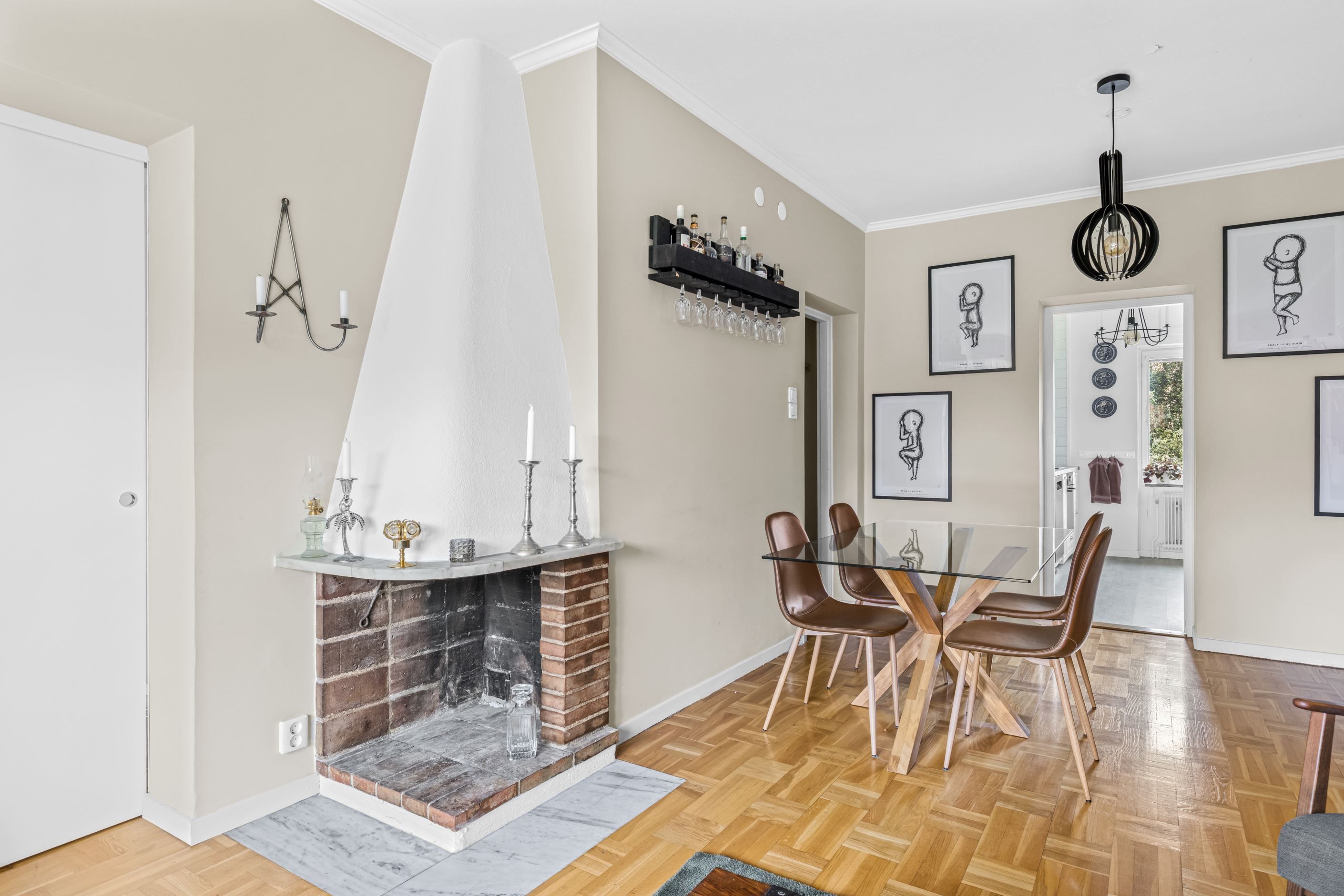 Bostaden erbjuder fyra rymliga sovrum, ett badrum med dusch samt en separat wc. Köket är nytt från 2024 och fullt utrustat med moderna vitvaror, medan det generösa vardagsrummet lockar med sin öppna spis och stora fönster som ger rikligt med ljusinsläpp samt utsikt mot den gröna innergården.