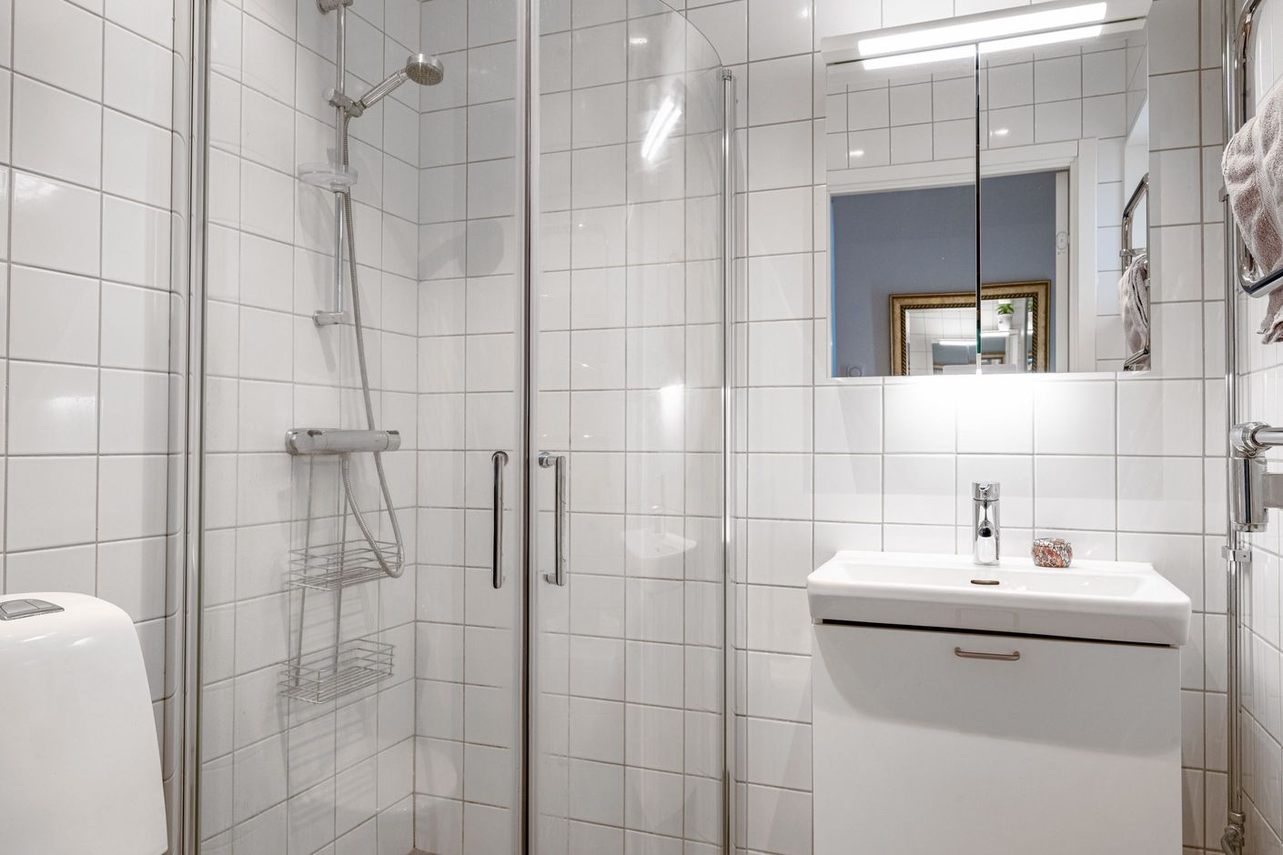 -Duschrum med klinker och helkaklade väggar, dusch, handfat med kommod, spegelskåp samt wc