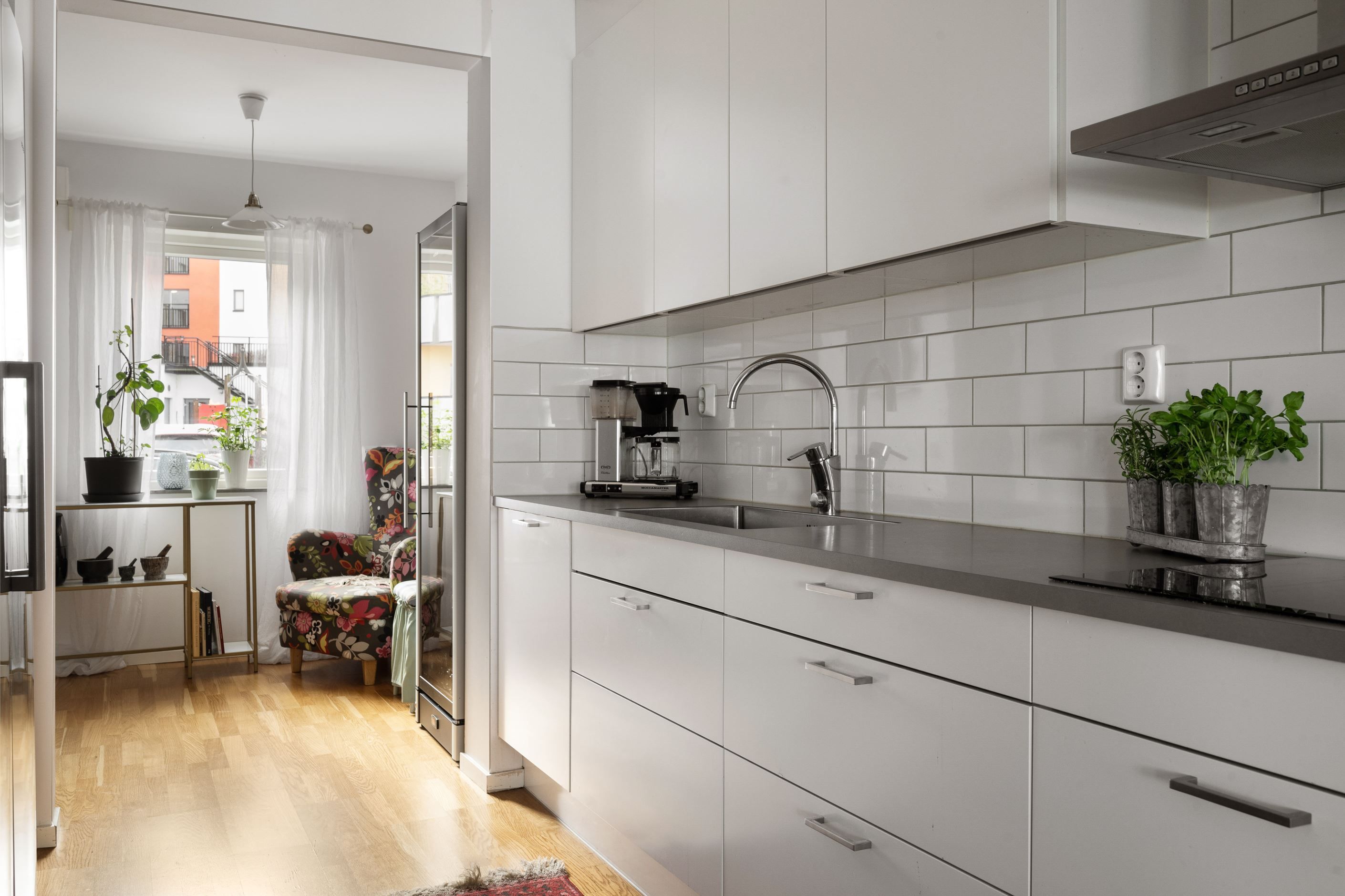 -Kök med öppen planlösning till vardagsrum där det finns plats för matsalsbord. Köket har vita skåpsluckor, kyl och frys i fullhöjd, inbyggd ugn och micro samt diskmaskin