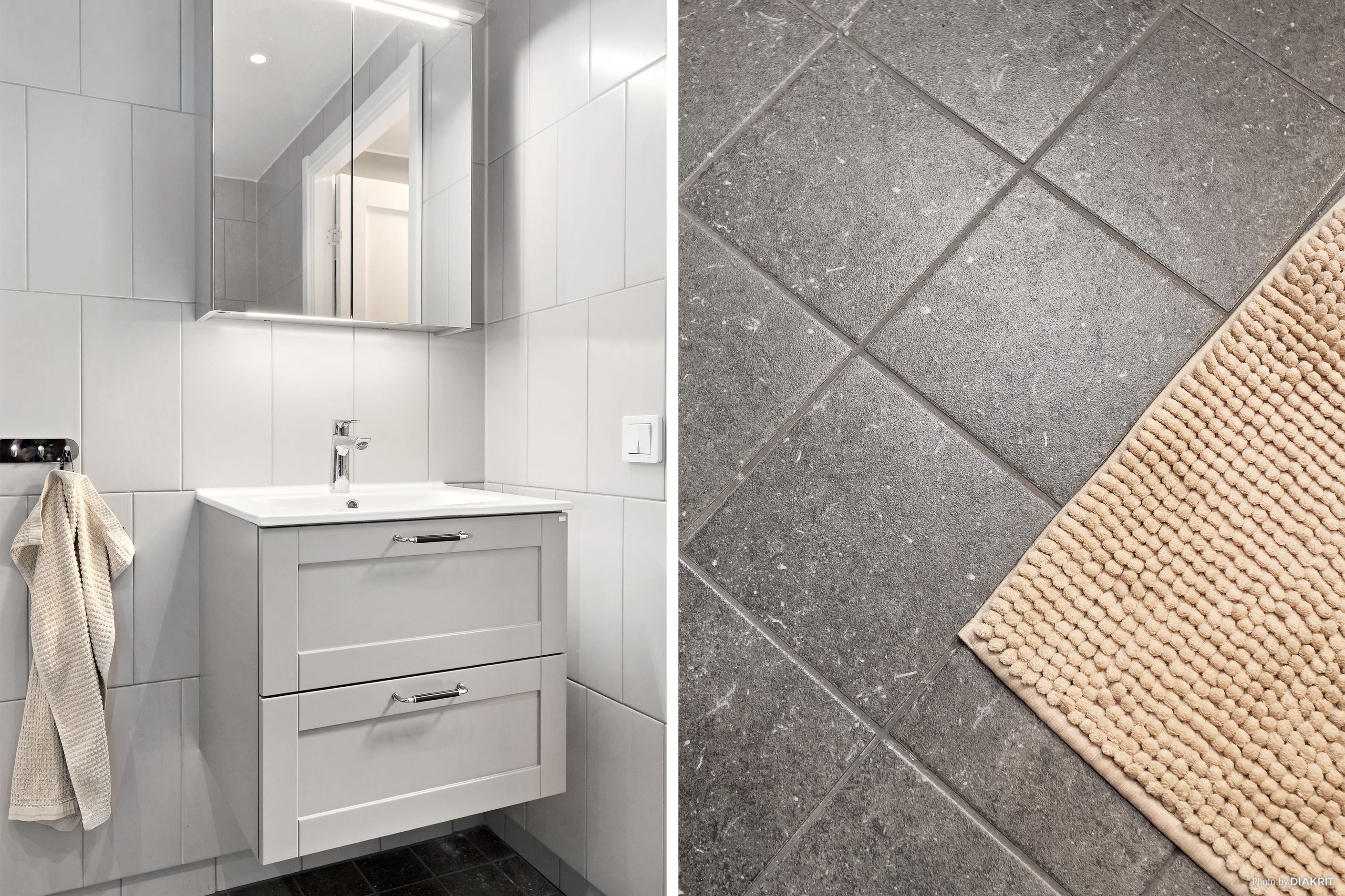 Badrummet är helkaklat i en elegant och tidlös stil. Här finns handfat med kommod, wc, kombimaskin och handdukstork för extra komfort. Duschdelen ramas in av moderna duschväggar i klarglas som ger en luftig och exklusiv känsla.
