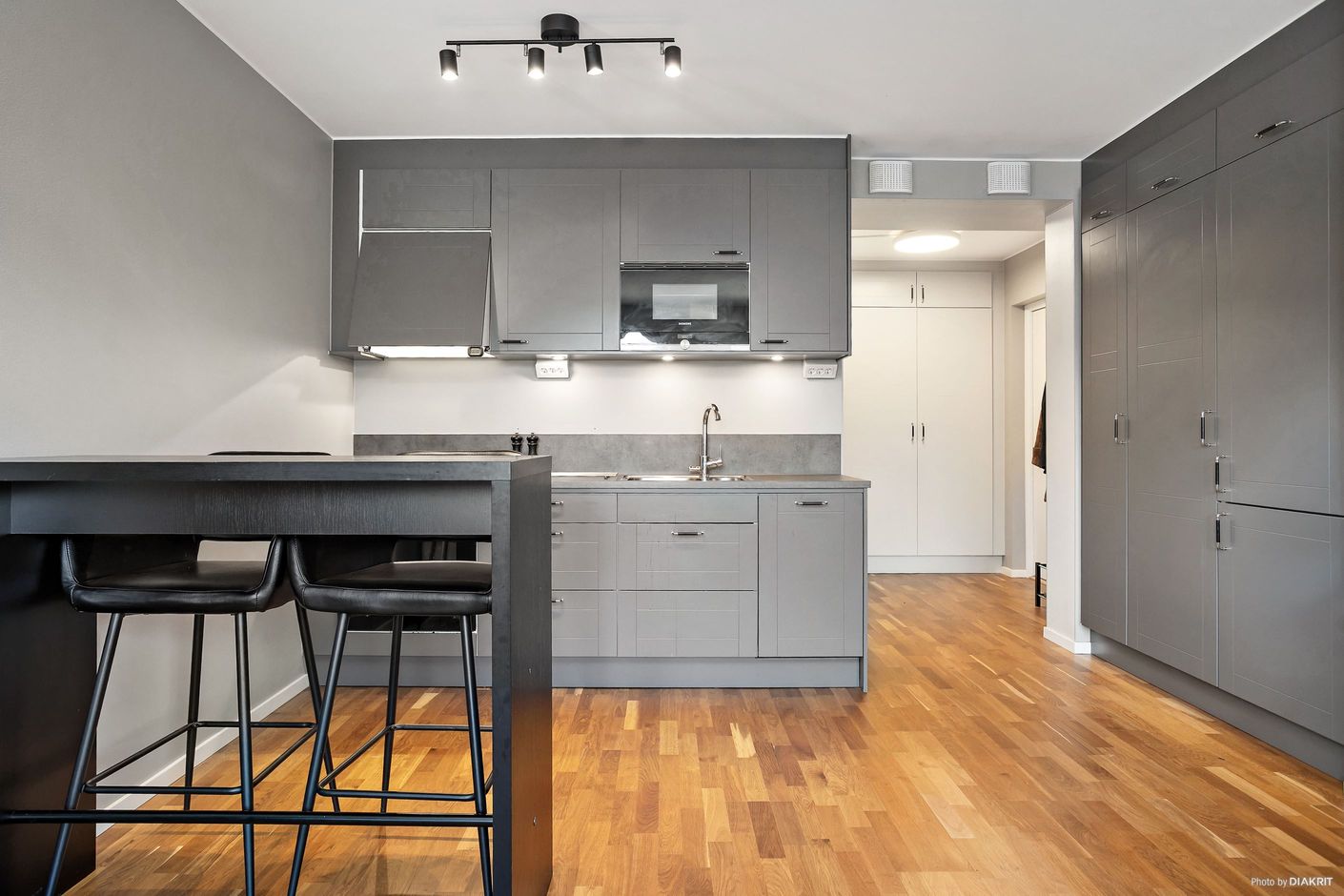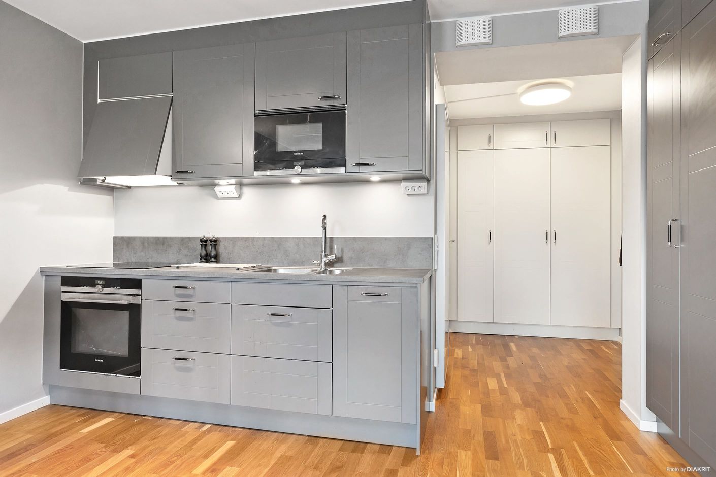 Allrummet bjuder på en inbjudande atmosfär med vackert parkettgolv och mjukt grå väggar som skapar en stilfull bas. Här ryms både säng och matplats utan att tumma på rymden. Det integrerade köket är smakfullt utformat med gråa luckor och utrustat med kvalitativa vitvaror från Siemens, inklusive ugn, mikro och spishäll. De inbyggda garderoberna ger generöst med förvaring och bidrar till en lättmöblerad och funktionell miljö. Från rummet når du den stora balkongen på cirka 6 kvm, en härlig förlängning av bostaden där du kan njuta av många soliga stunder.